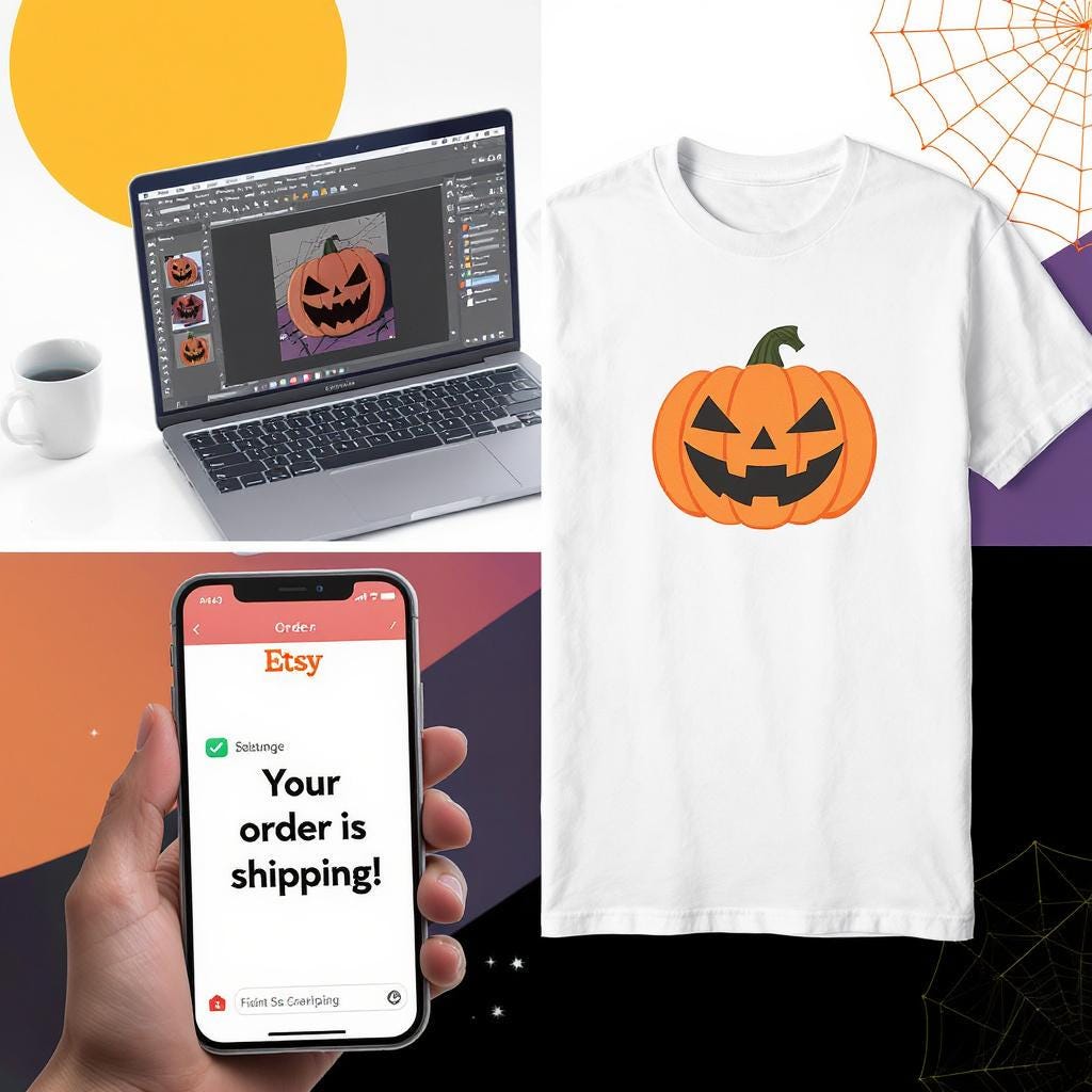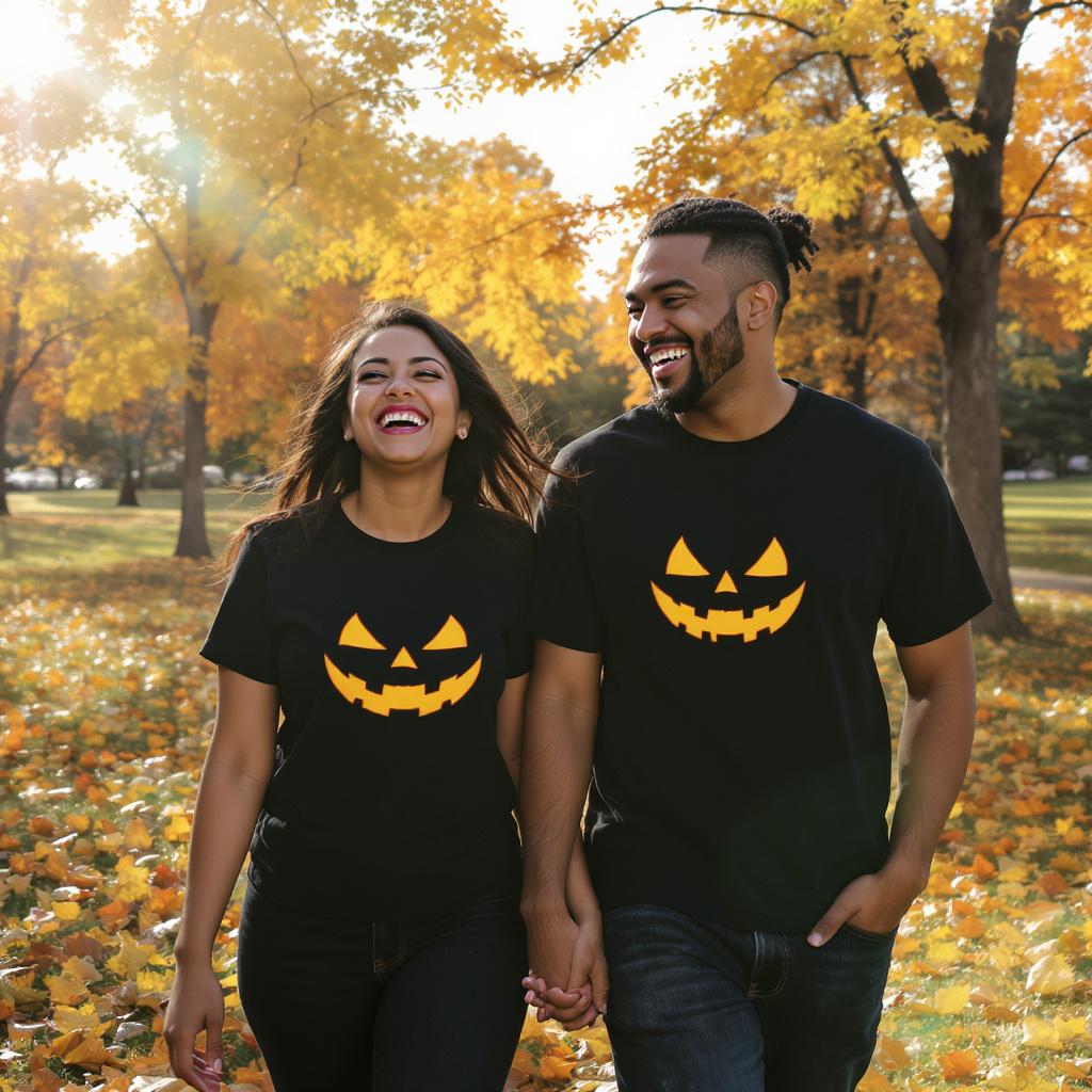 A young man and woman are wearing black T-shirts with small stylized pumpkins on the chest. Their poses are natural, their smiles restrained. The focus of the shot is on the T-shirts themselves, their quality, and the clever design that complements their look.