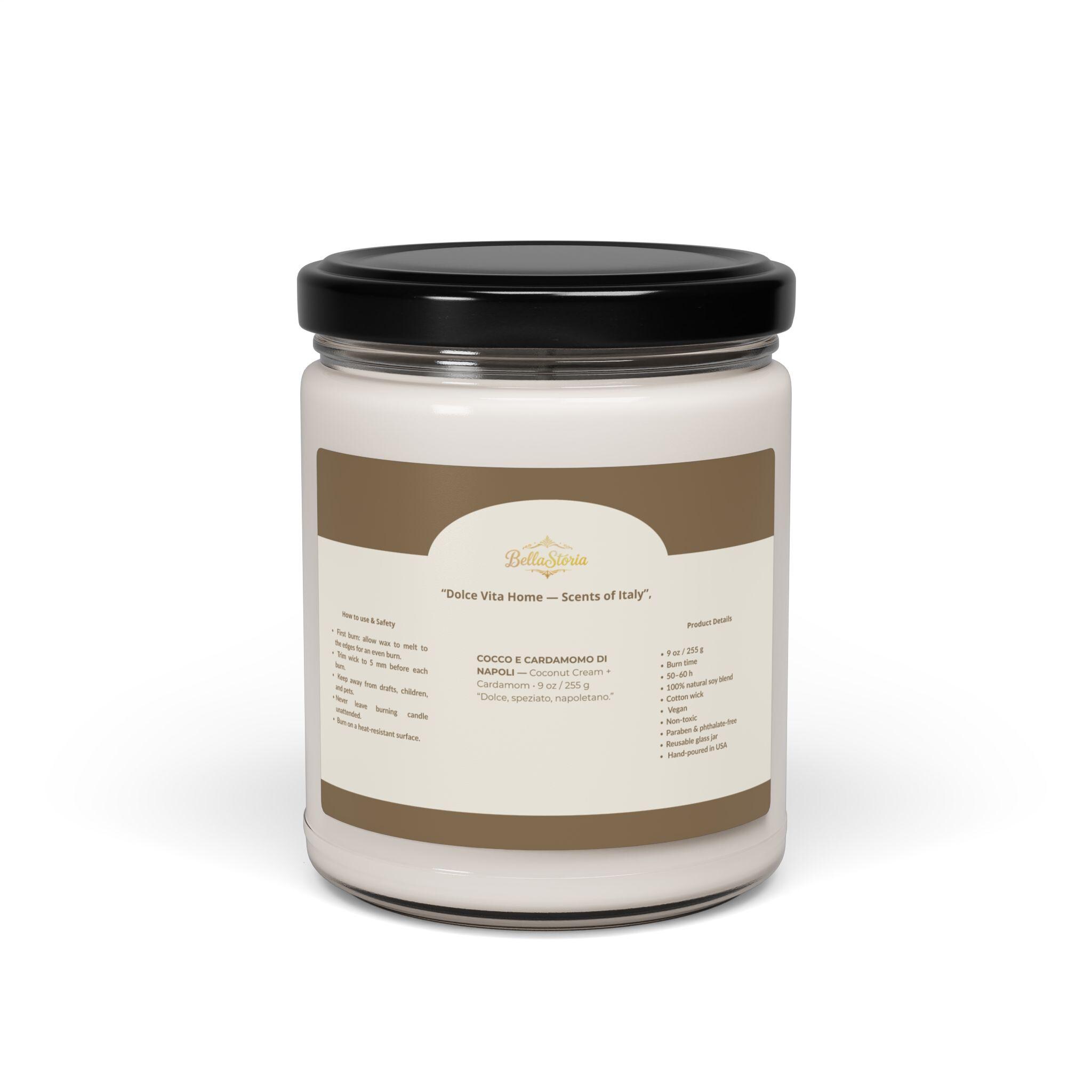 Experience the essence of Dolce Vita Home's COCCO E CARDAMOMO DI NAPOLI scented soy candle in Coconut Cream + Cardamom. Transport yourself to Napoli with this sweet, spicy, and exotic aroma. Perfect for creating a cozy and luxurious atmosphere at home. Ideal for those who appreciate high-quality, eco-friendly candles. Relevant for holidays, celebrations, and everyday relaxation.