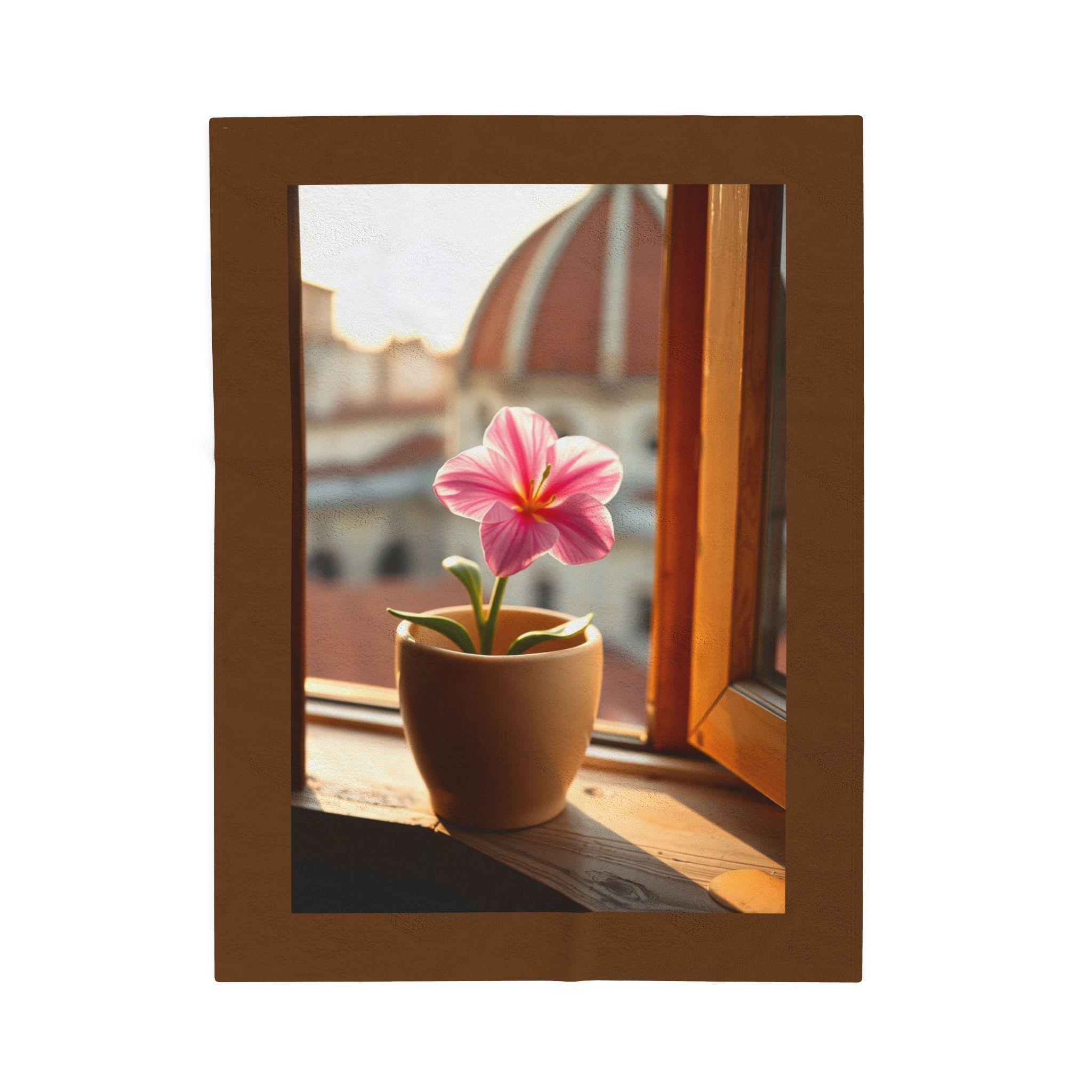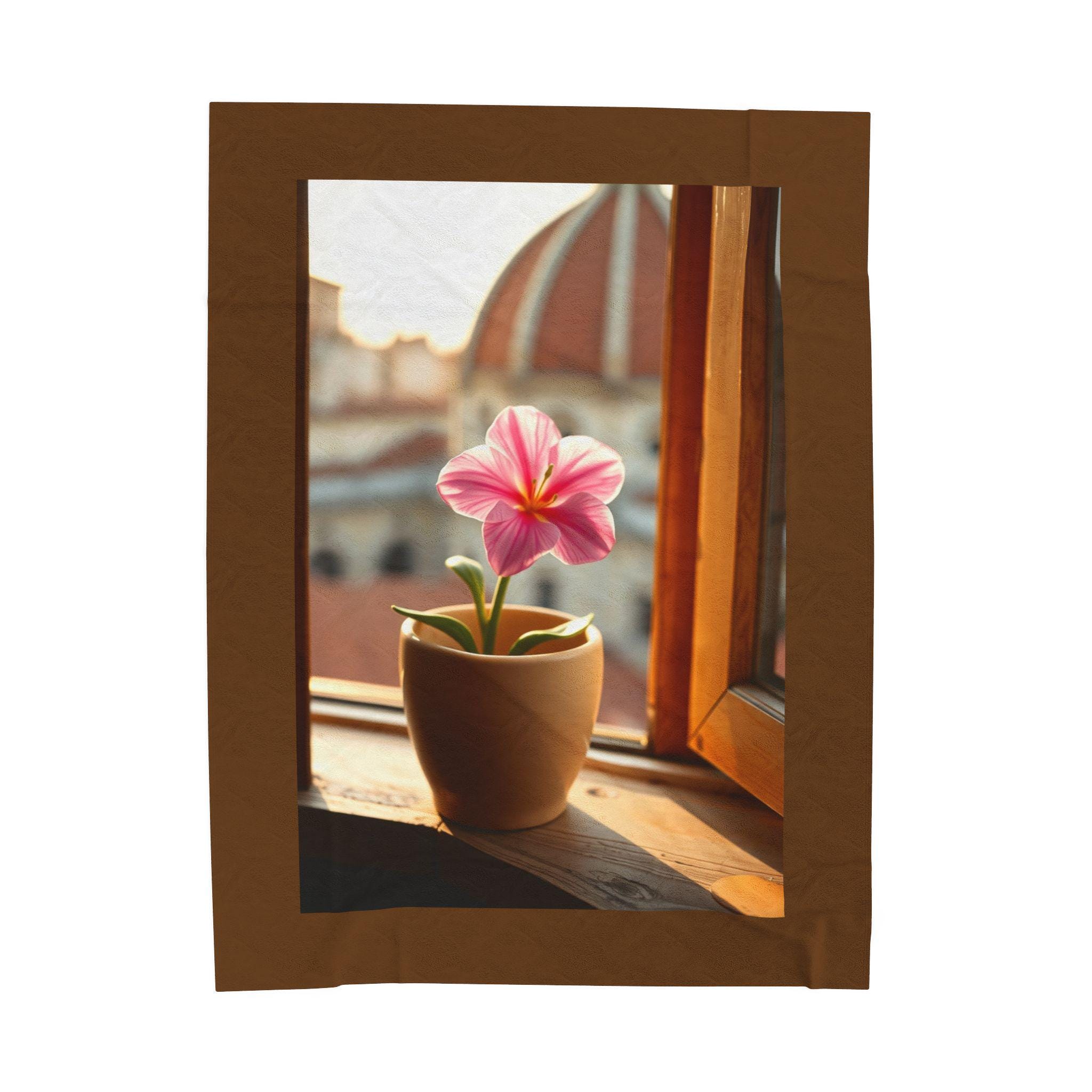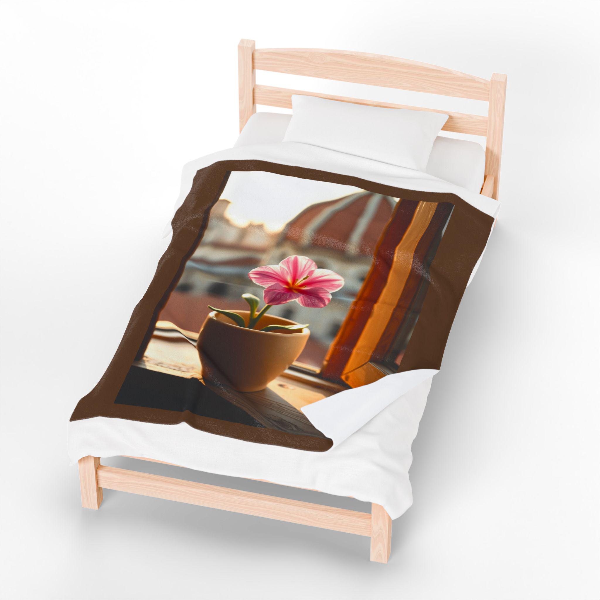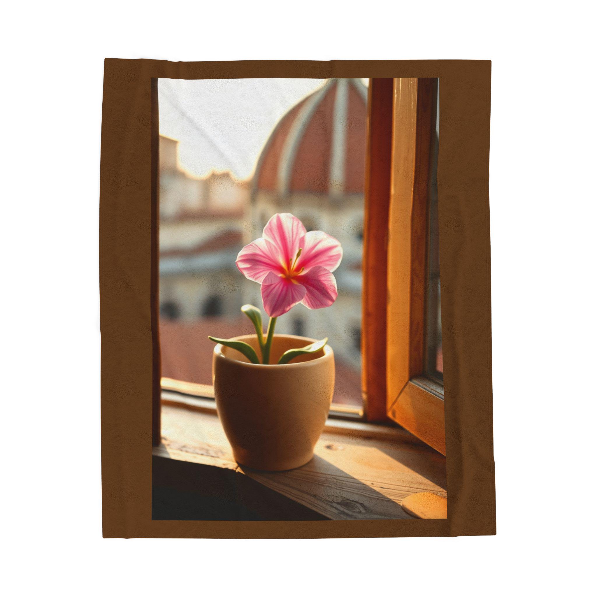 Pink Potted Flower Blanket | Window Sill Floral Velveteen Throw. This velveteen plush blanket gives a cozy and inviting vibe, perfect for snuggling up on the couch or adding a touch of floral charm to any room. Ideal for adults who love soft and luxurious blankets. Relevant for home decor, cozy nights, and gift-giving occasions.