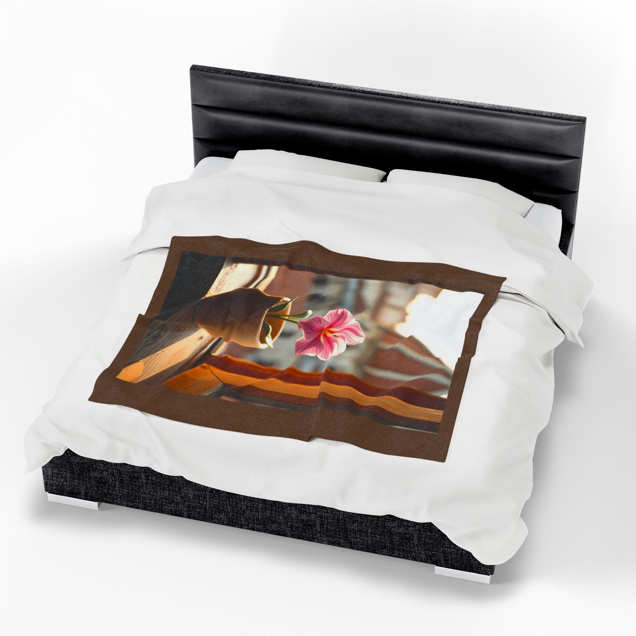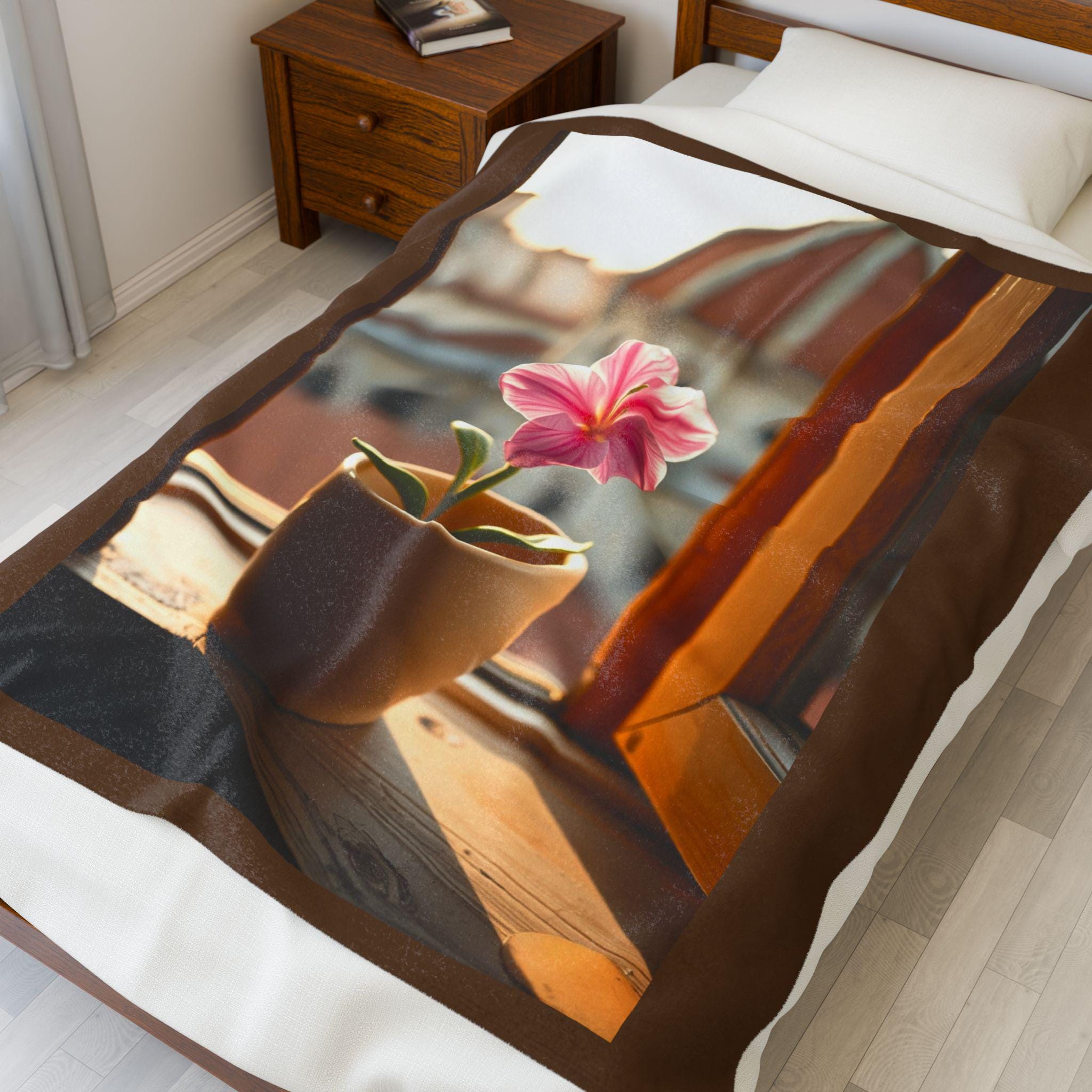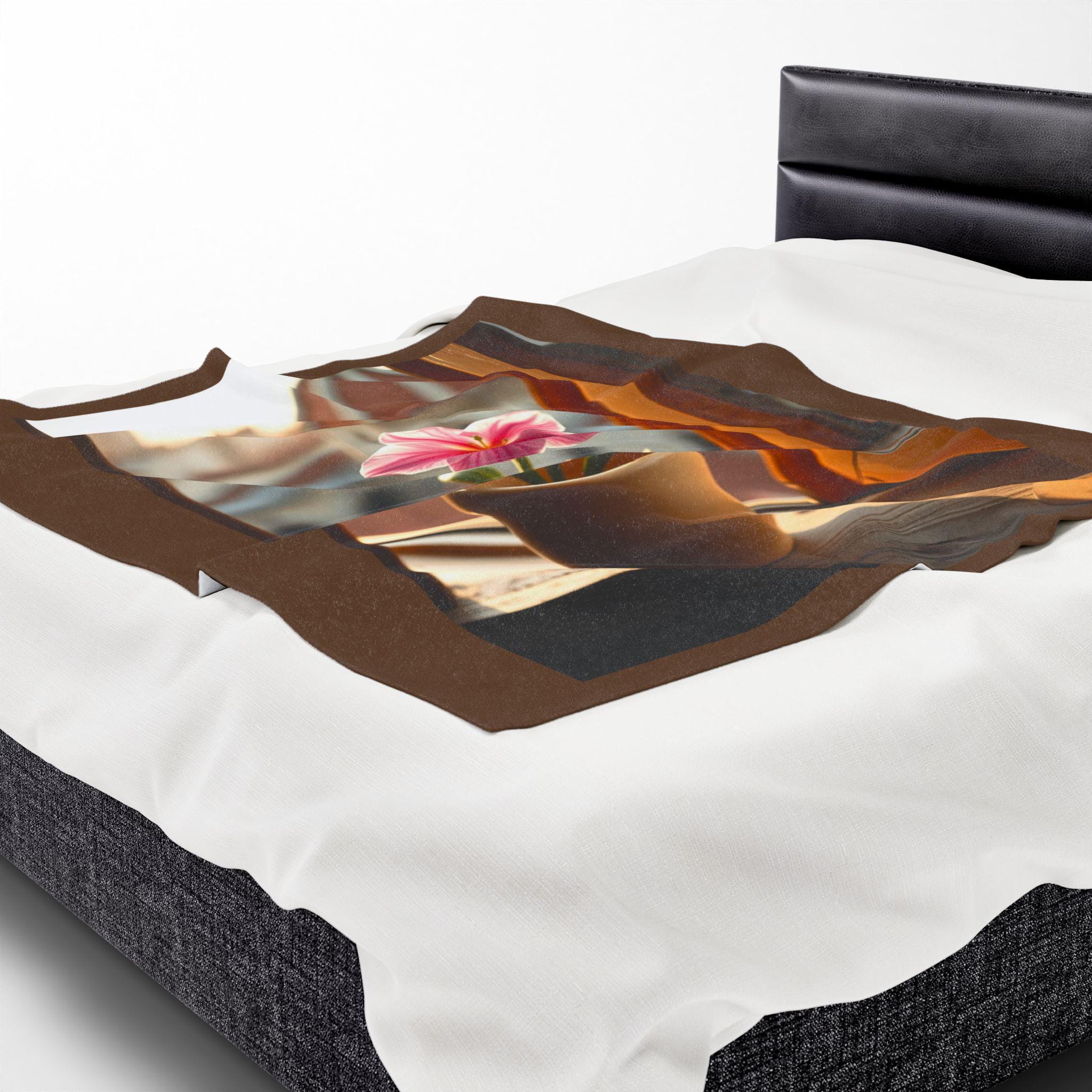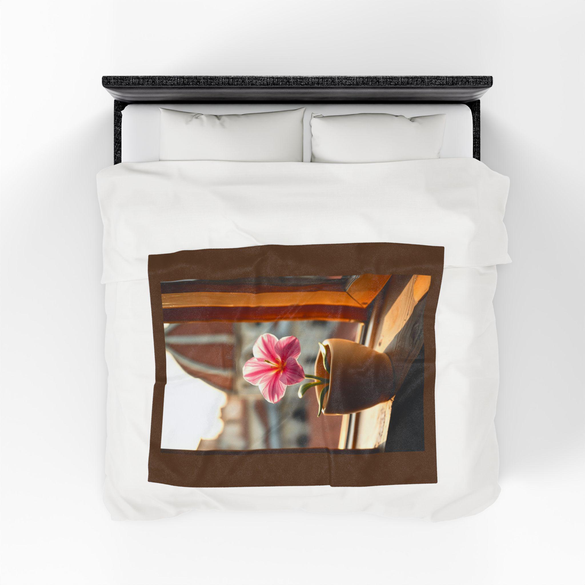 Pink Potted Flower Blanket | Window Sill Floral Velveteen Throw. This velveteen plush blanket gives a cozy and inviting vibe, perfect for snuggling up on the couch or adding a touch of floral charm to any room. Ideal for adults who love soft and luxurious blankets. Relevant for home decor, cozy nights, and gift-giving occasions.