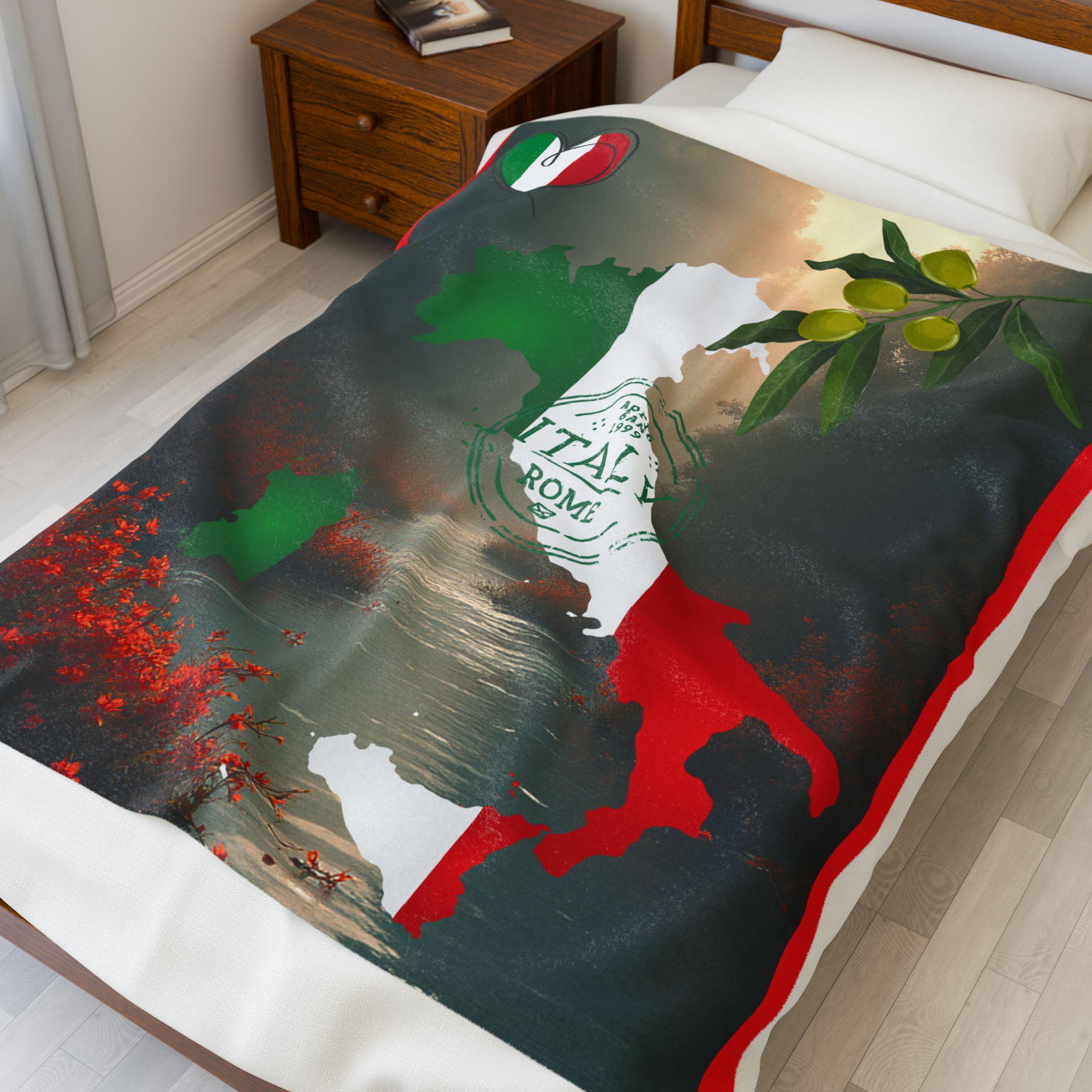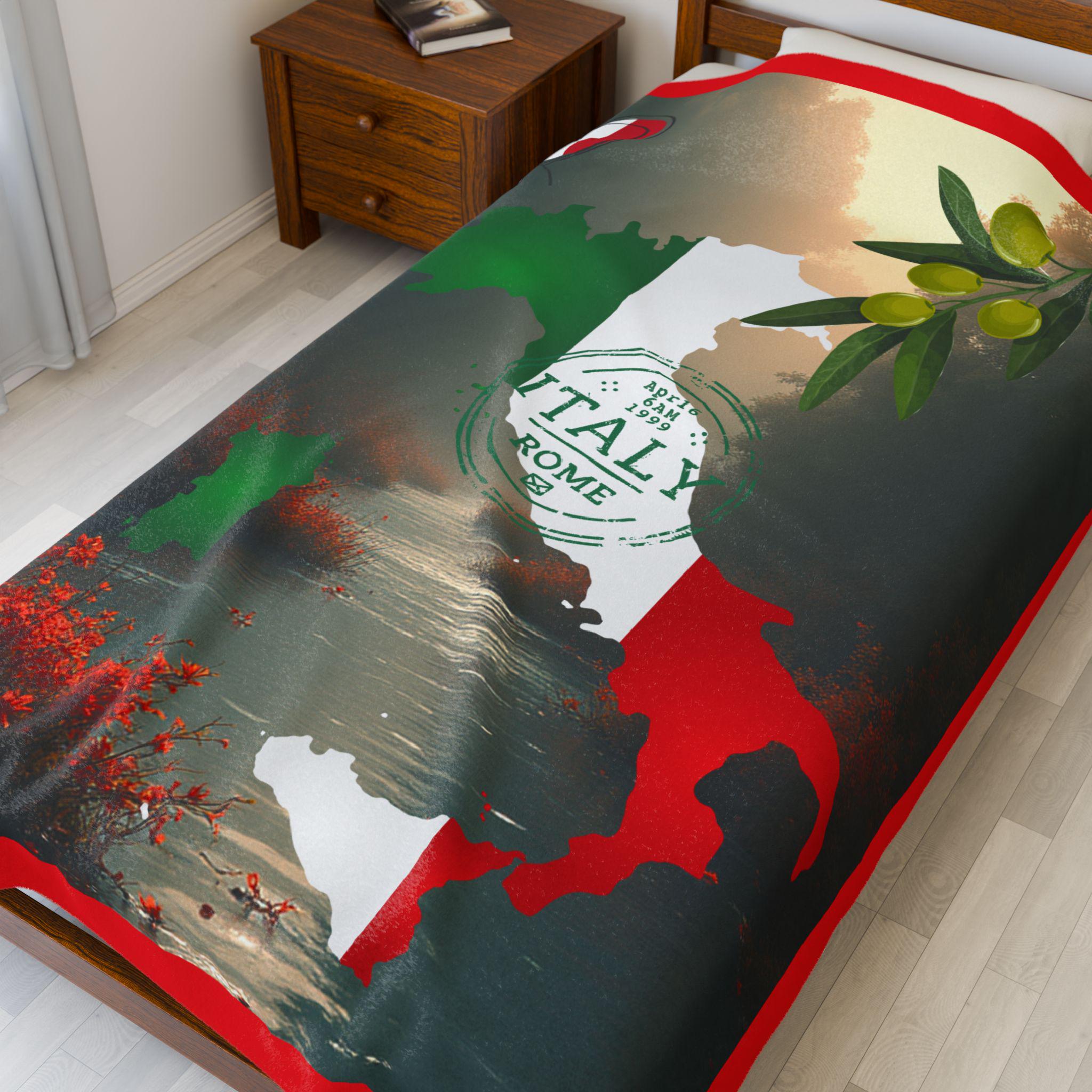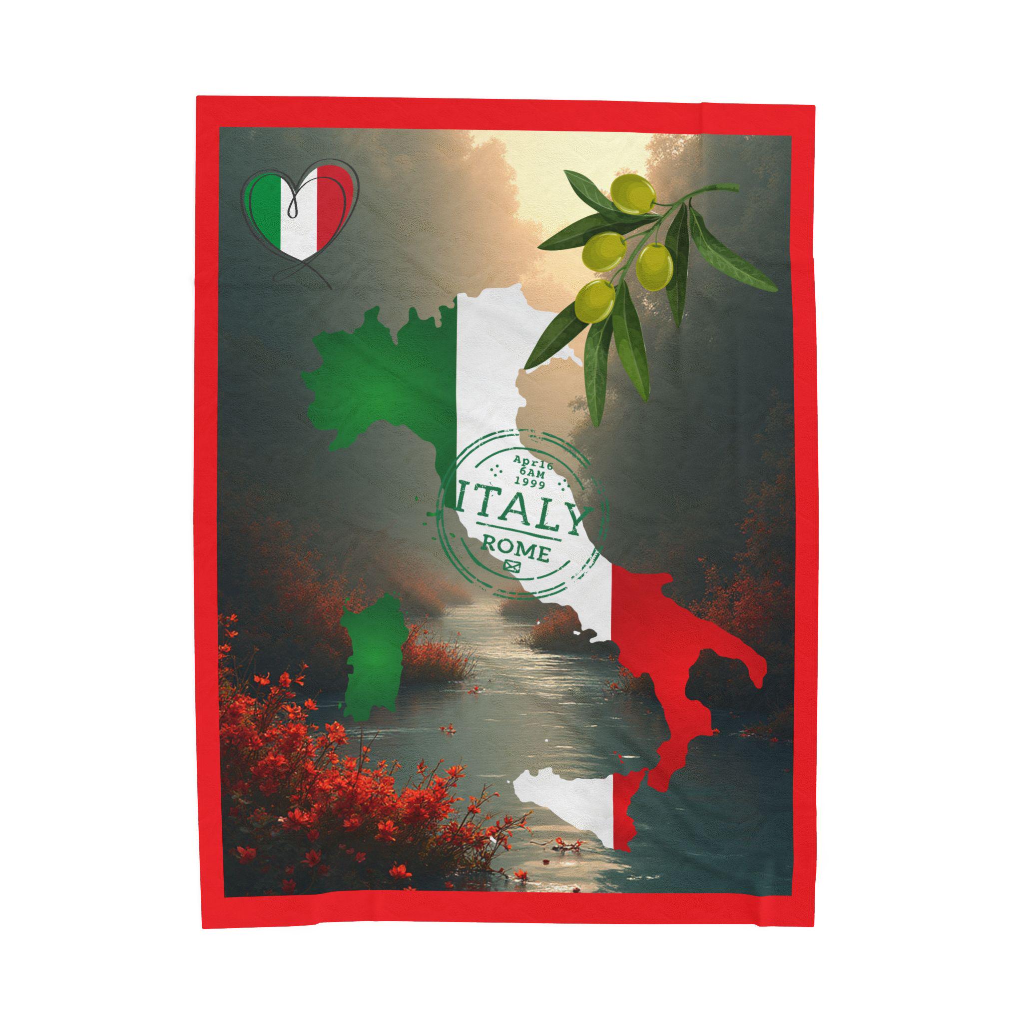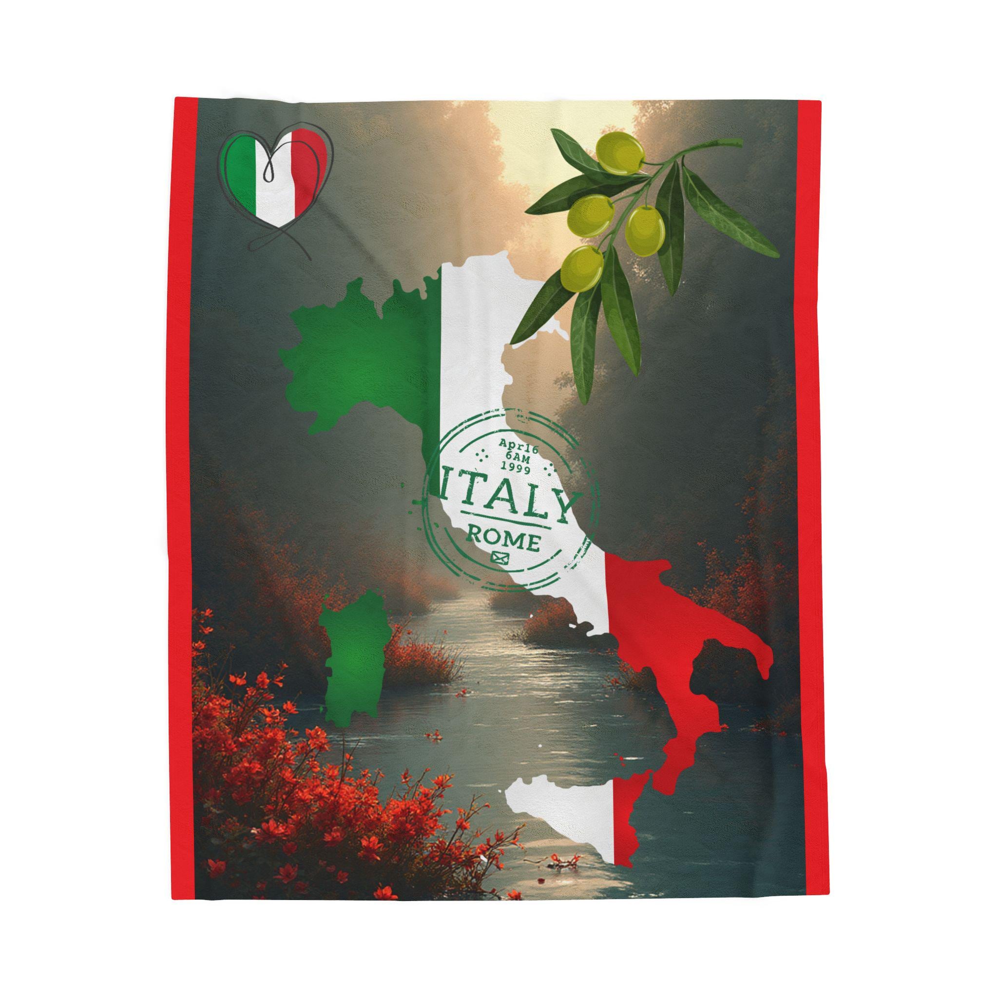 Folded across your lap or draped over the back of a favorite chair, this plush velveteen blanket carries a slice of Italy into everyday moments. The design layers a soft forest river scene with a bold map of Italy in tricolors, olive sprigs, and a vintage Rome stamp - a quiet mix of nostalgia and wanderlust. The fabric feels velvety warm, with enough weight to comfortably settle without feeling heavy. Use it for slow evenings with tea, travel memories revisited, or when you want a small, tactile reminder of places that matter.