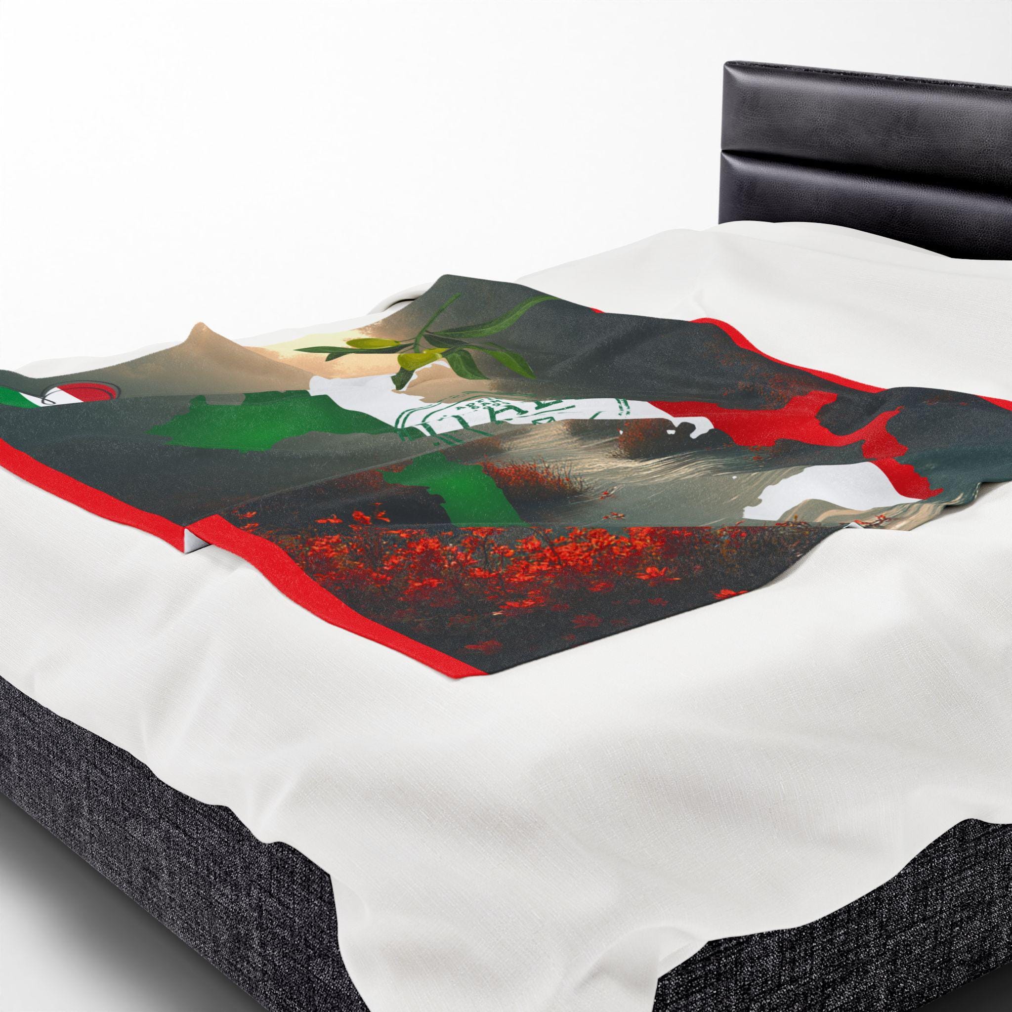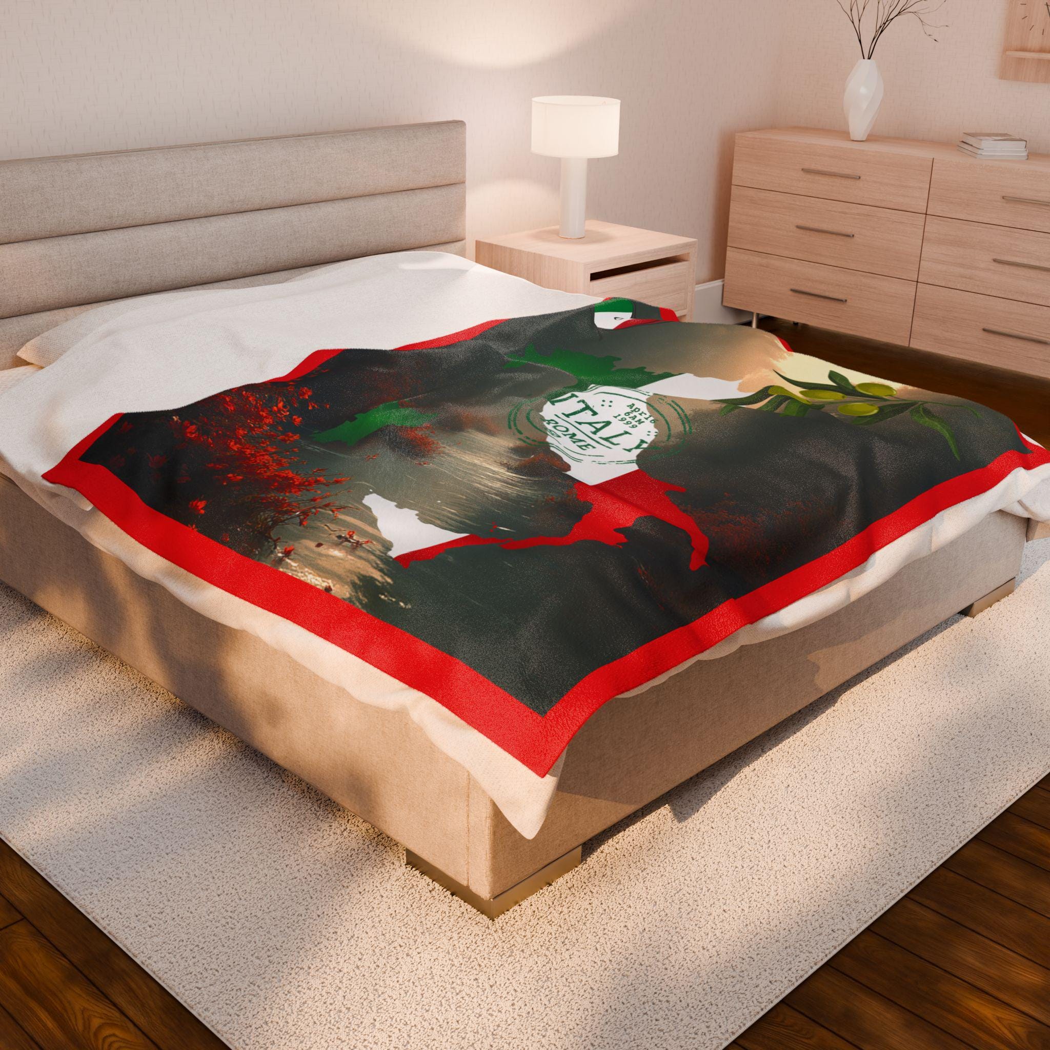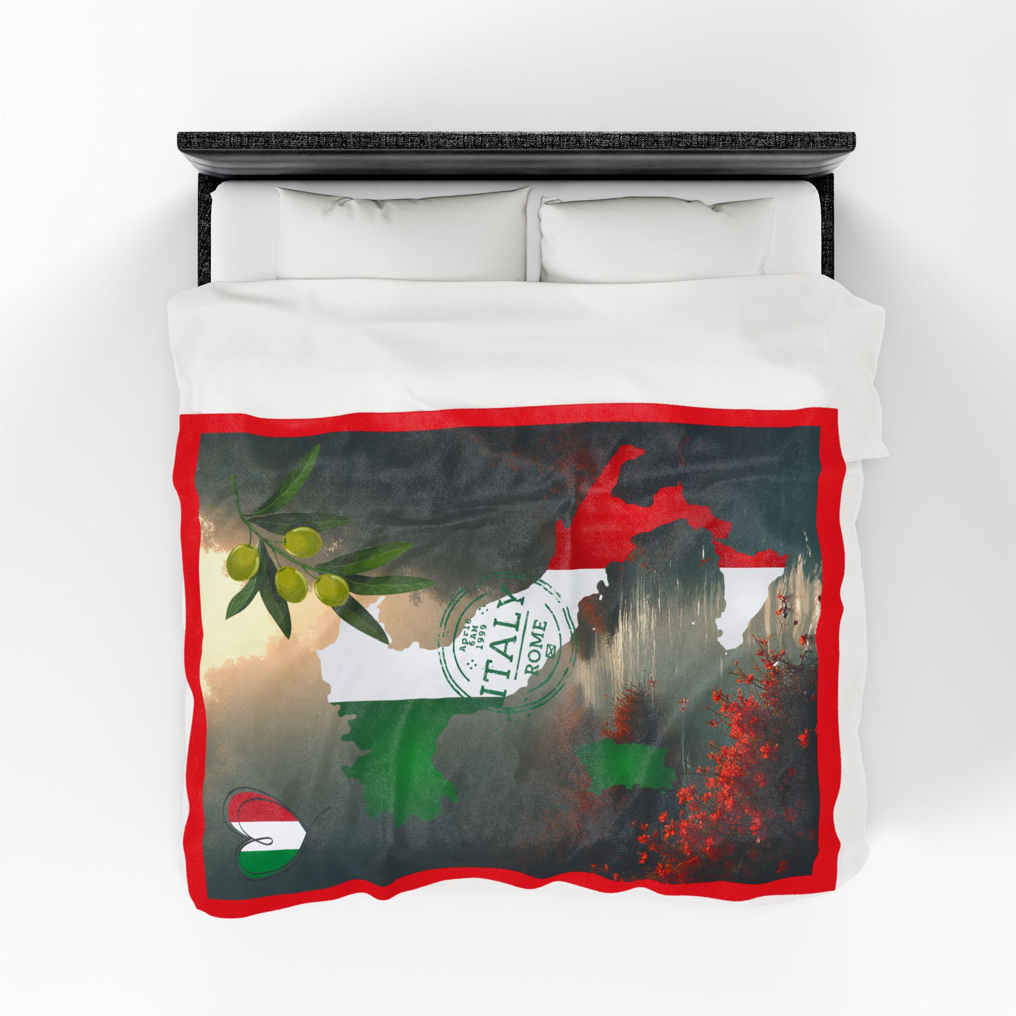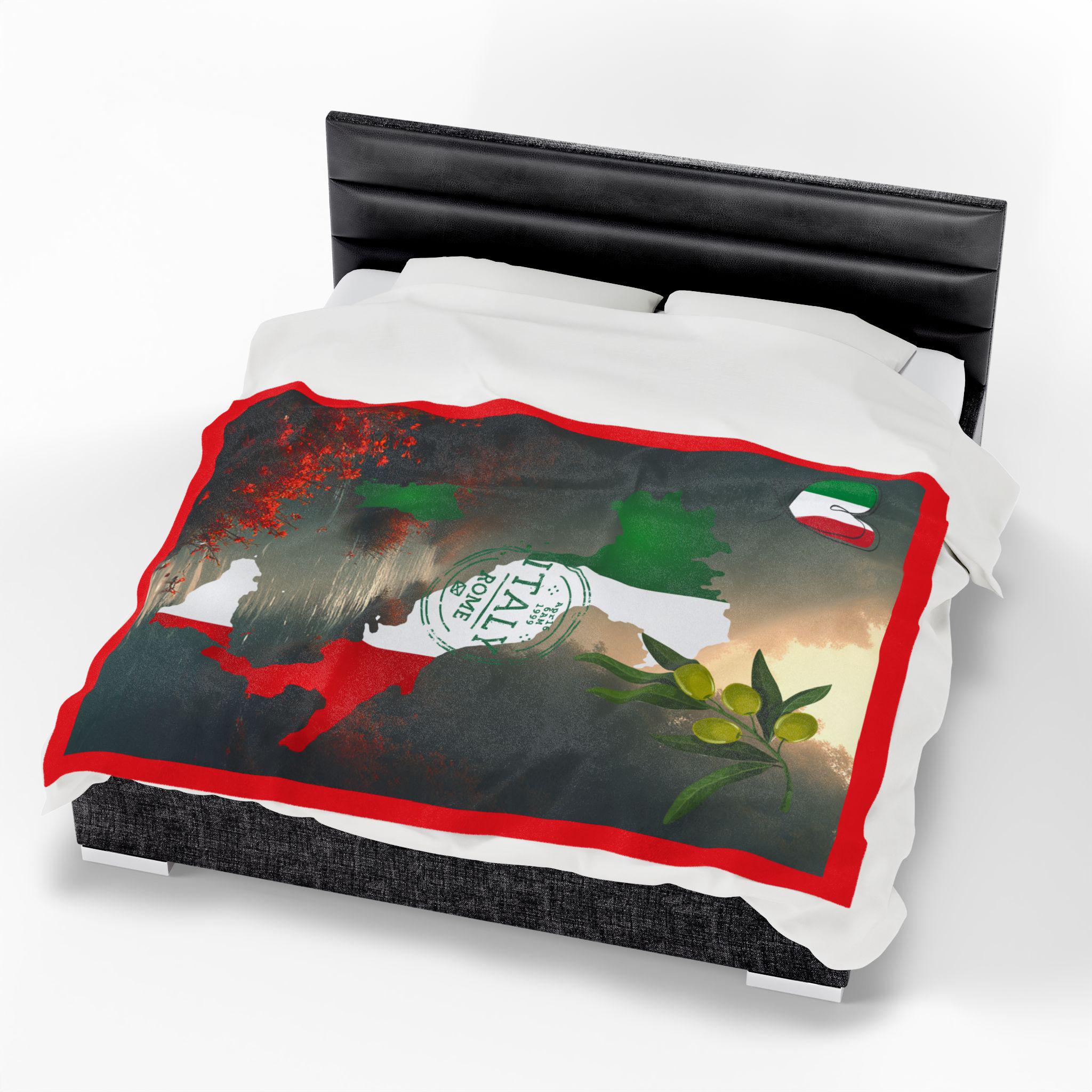 Folded across your lap or draped over the back of a favorite chair, this plush velveteen blanket carries a slice of Italy into everyday moments. The design layers a soft forest river scene with a bold map of Italy in tricolors, olive sprigs, and a vintage Rome stamp - a quiet mix of nostalgia and wanderlust. The fabric feels velvety warm, with enough weight to comfortably settle without feeling heavy. Use it for slow evenings with tea, travel memories revisited, or when you want a small, tactile reminder of places that matter.