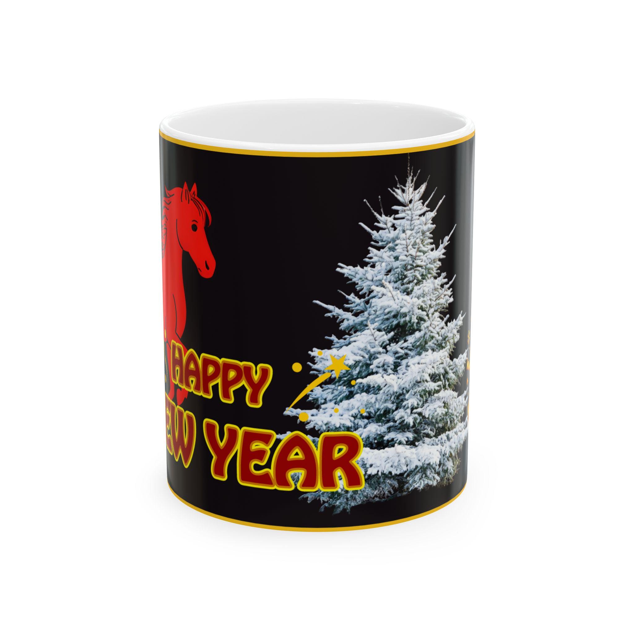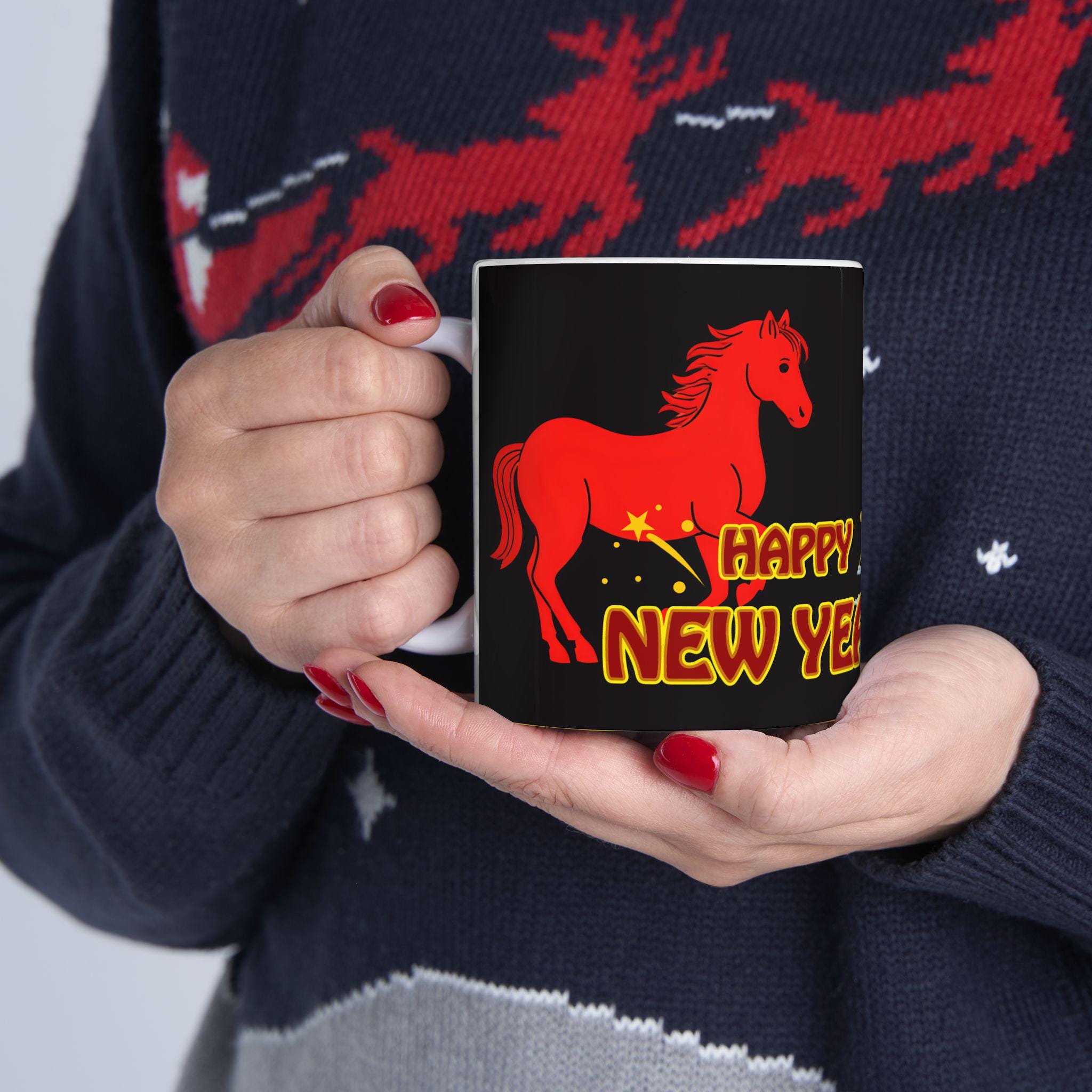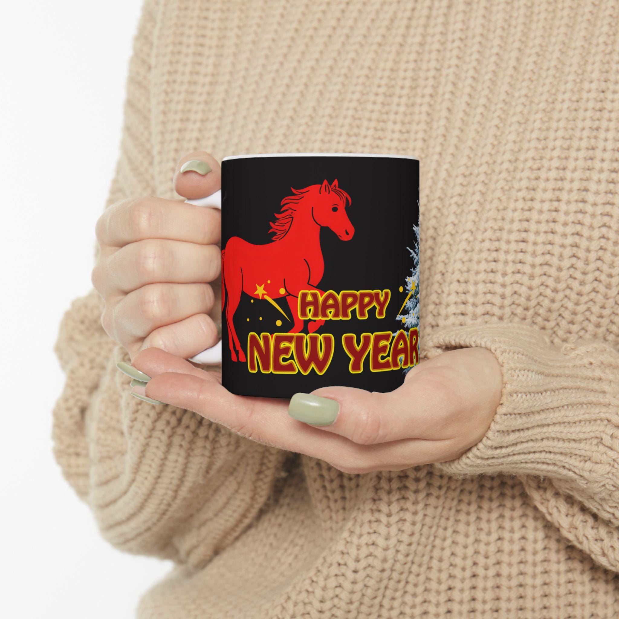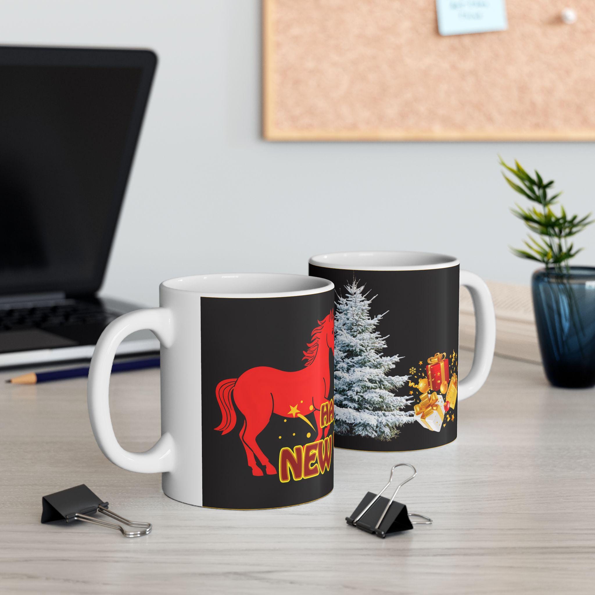 Warm, cheerful, and a little bit playful — this glossy ceramic mug brings festive New Year energy to every morning ritual. A deep black background makes the snowy fir and bright red horse pop, while the golden trim around the rim adds a celebratory gleam. It feels right for quiet moments with a steaming latte or for laughing with friends as midnight memories are retold. The sturdy C-handle sits comfortably in hand, and the durable print holds up to daily use so the design keeps its color and sparkle through many washes and gatherings.