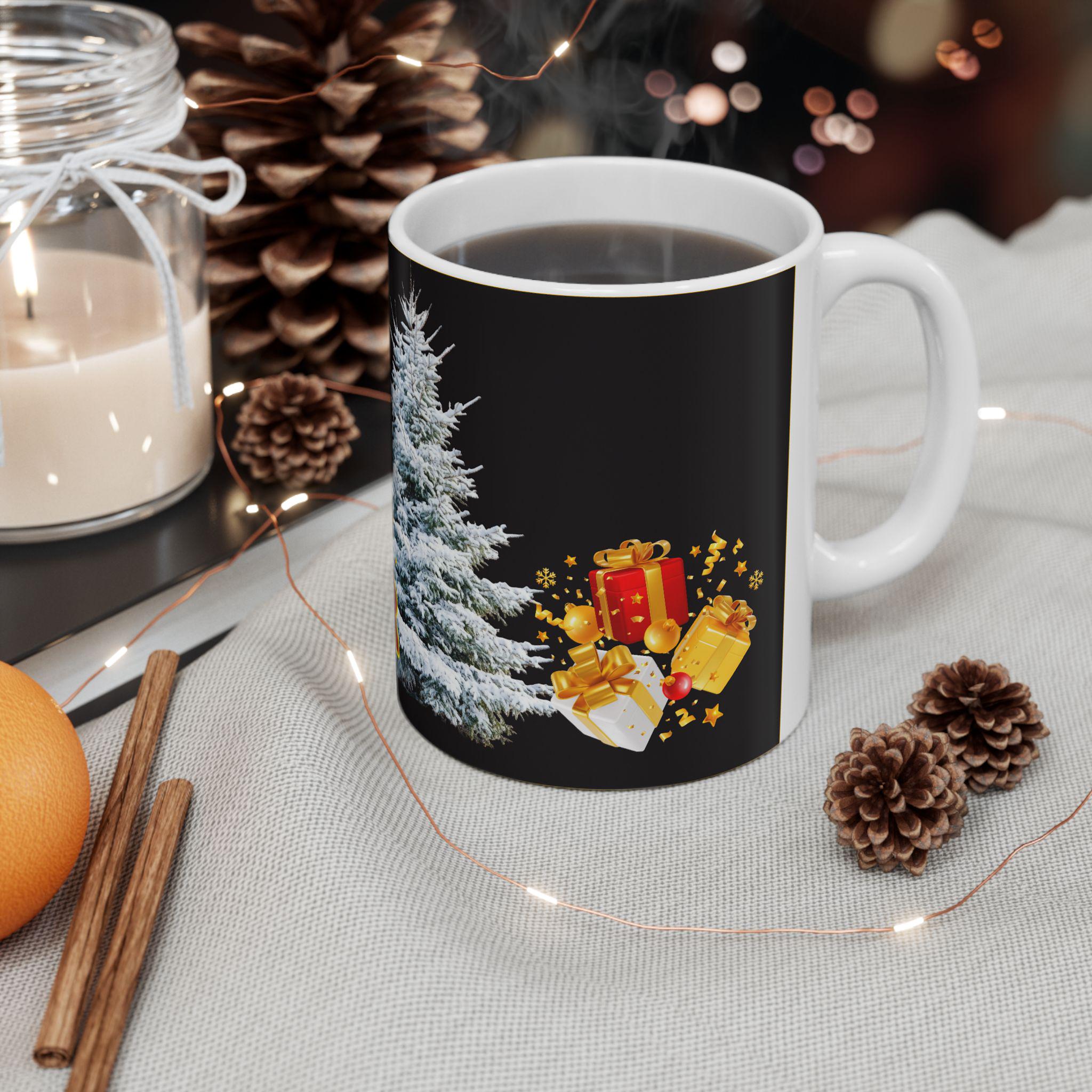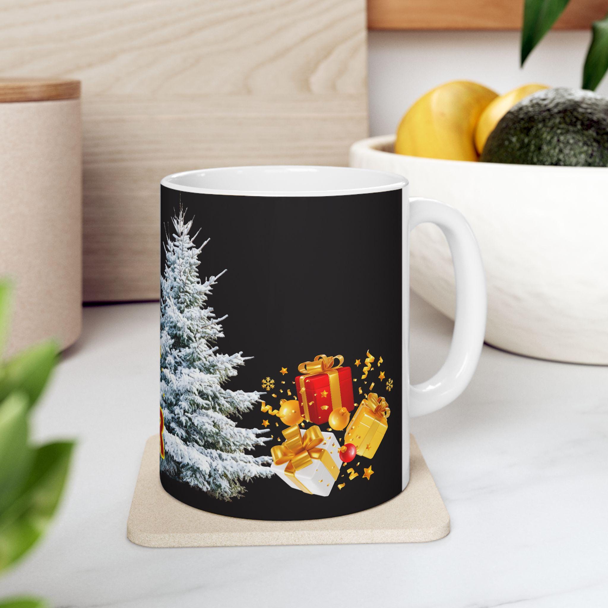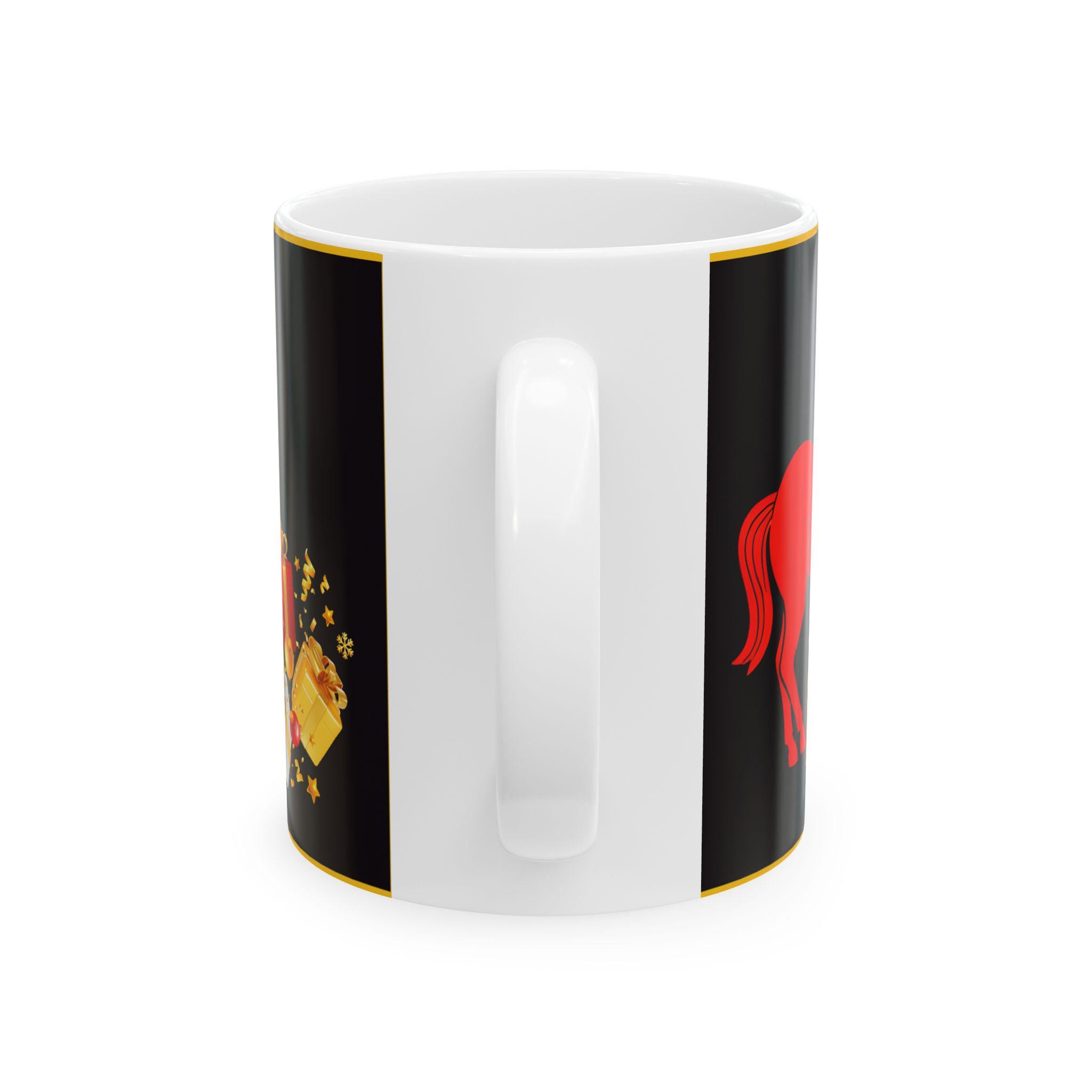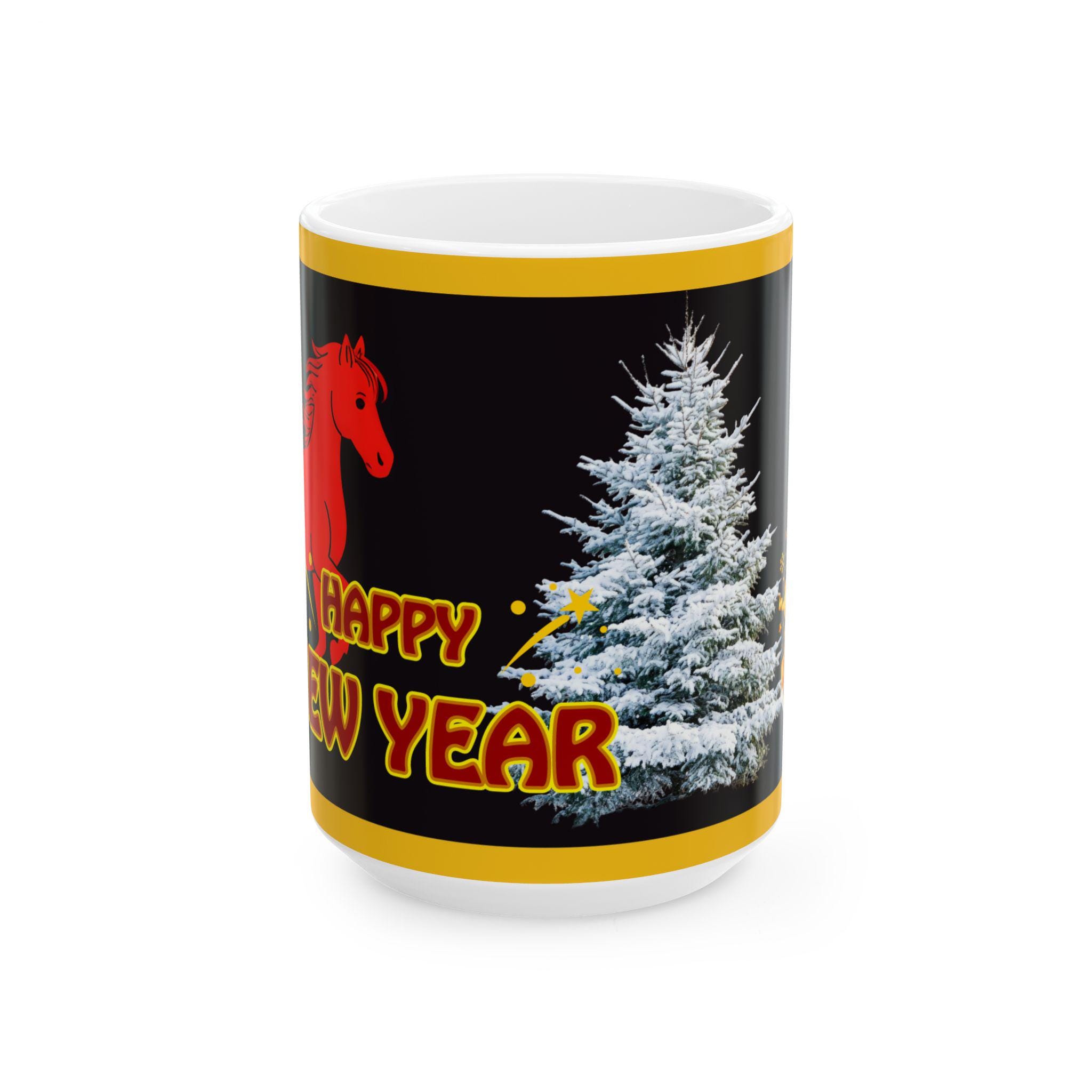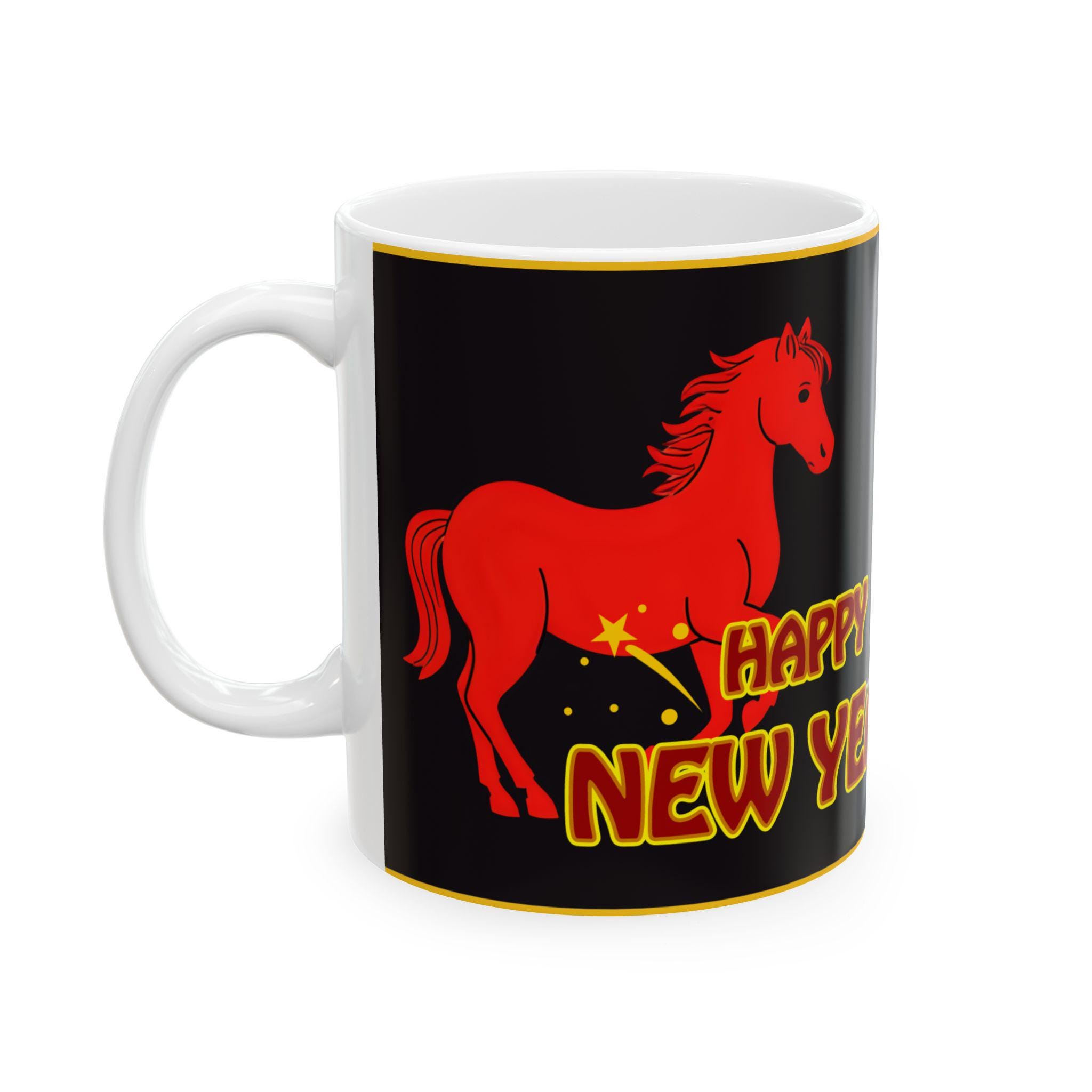 Warm, cheerful, and a little bit playful — this glossy ceramic mug brings festive New Year energy to every morning ritual. A deep black background makes the snowy fir and bright red horse pop, while the golden trim around the rim adds a celebratory gleam. It feels right for quiet moments with a steaming latte or for laughing with friends as midnight memories are retold. The sturdy C-handle sits comfortably in hand, and the durable print holds up to daily use so the design keeps its color and sparkle through many washes and gatherings.