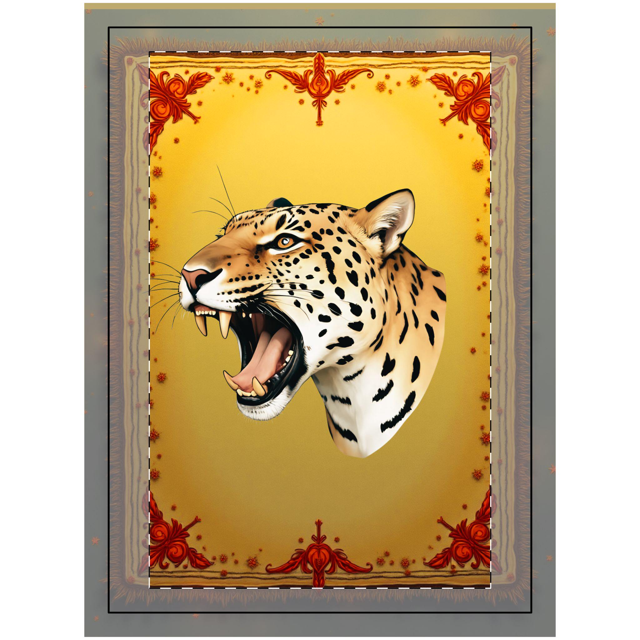 Unique Design: A vibrant illustration of a snarling leopard on a warm background with decorative corners creates the effect of an expensive graphic or a page from an antique satin.