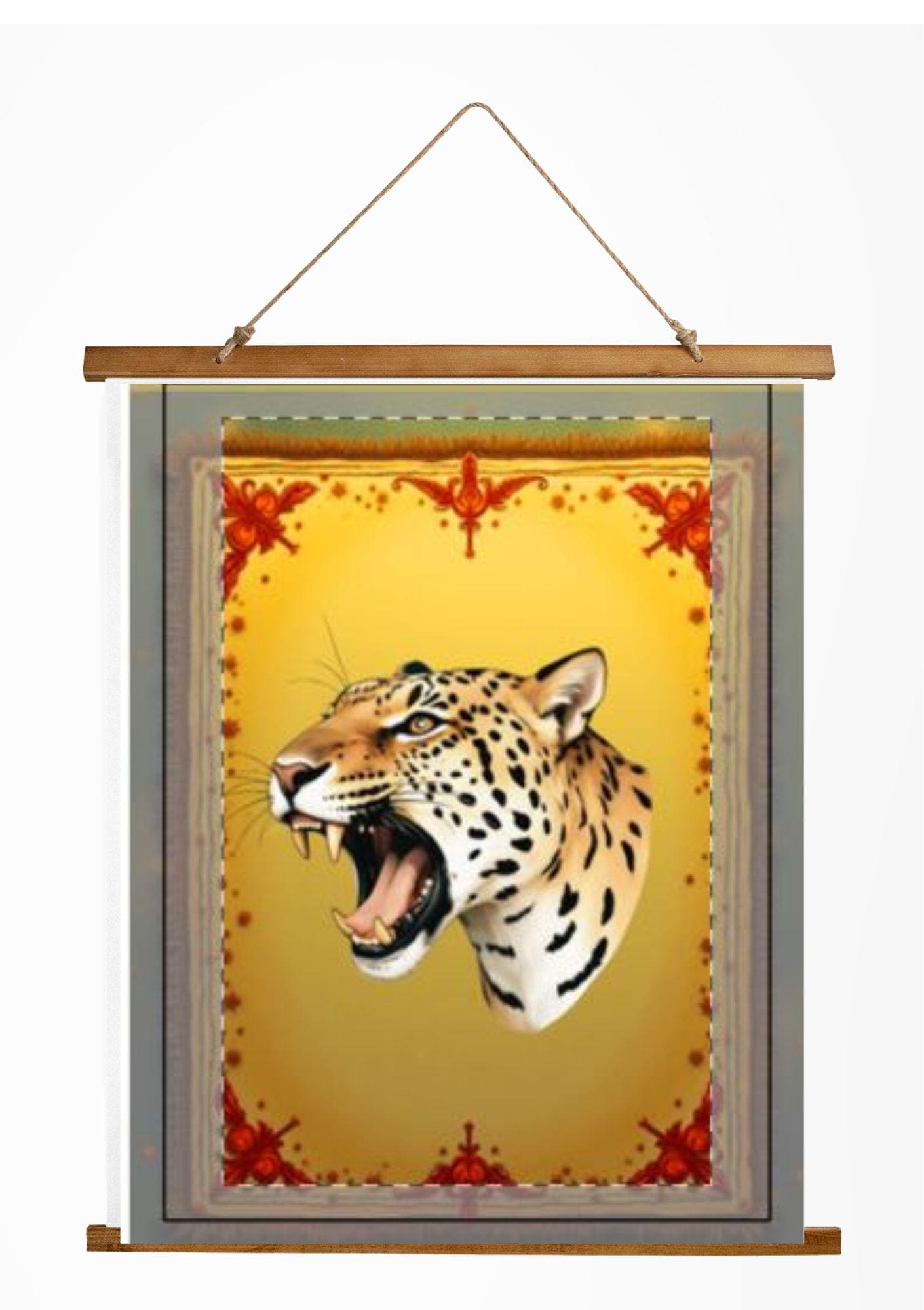 This powerful roaring leopard tapestry is more than just a decoration; it's a true story on your wall. The combination of bold animal print, warm golden tones, and graceful ornamental patterns in the corners creates an atmosphere of safari, luxury, and wild freedom. The wood slat and twine add a tactile, handmade feel, turning it into a truly unforgettable art object.