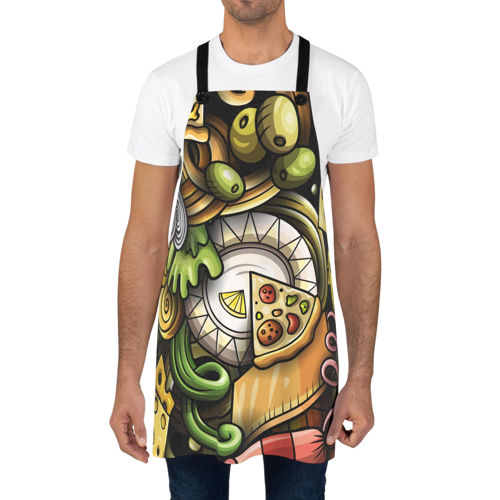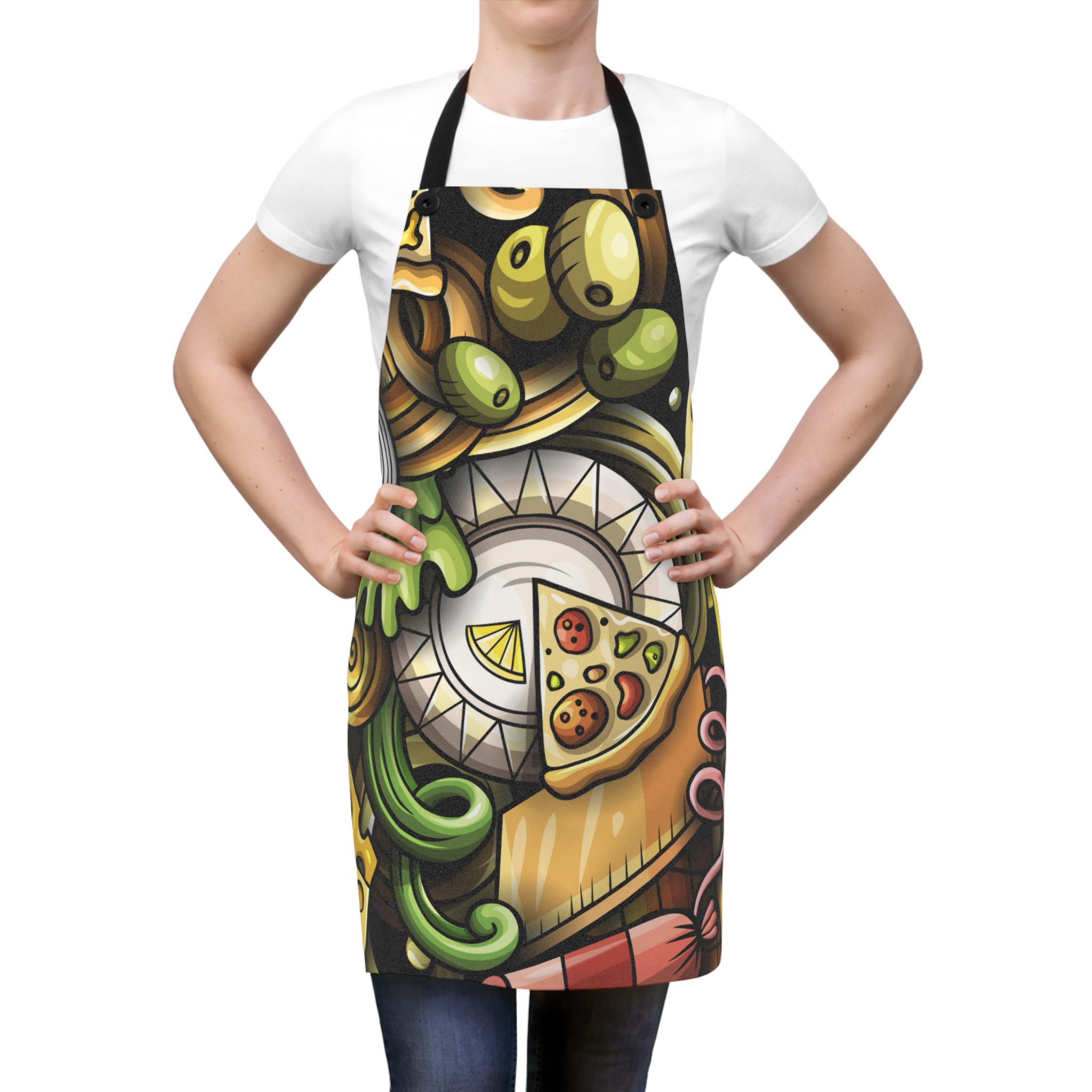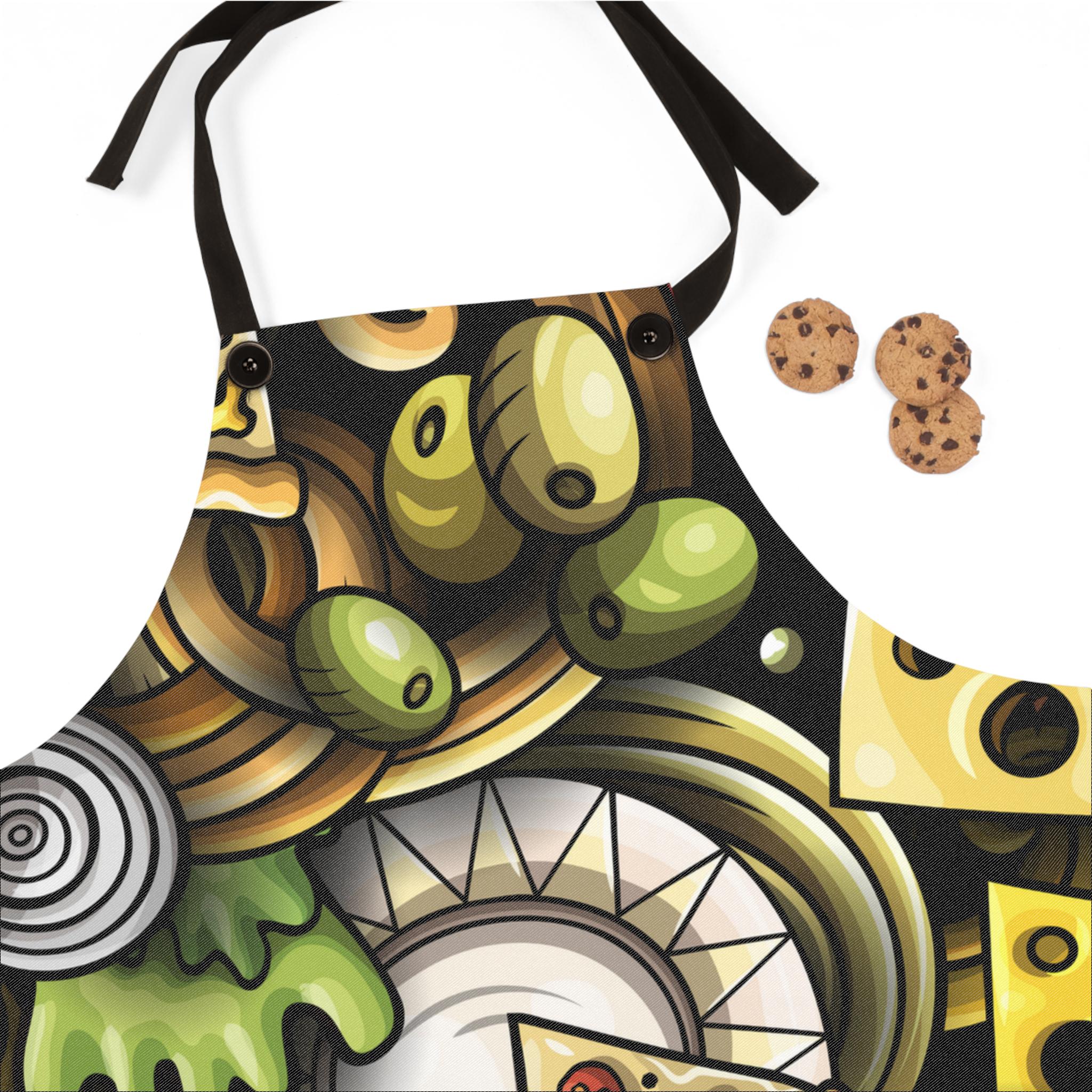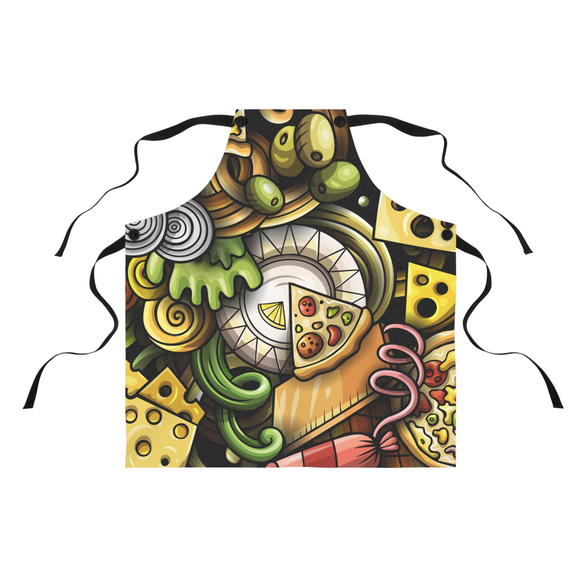 This vibrant apron brings the joy of a busy kitchen to life. Thick, quick-drying polyester holds up to spills while a lively, food-themed illustration — pizza slices, olives, cheese wedges, and pasta swirls — keeps things playful and colorful. The detachable black twill straps attach with buttonholes so you can adjust or remove them as needed. Durable overlocked seams mean it stands up to frequent use. Wear it while assembling a charcuterie board, teaching pizza night to friends, or hosting a cozy cooking session. The design feels lively and slightly cheeky, perfect for people who treat cooking like a creative session rather than a chore.
