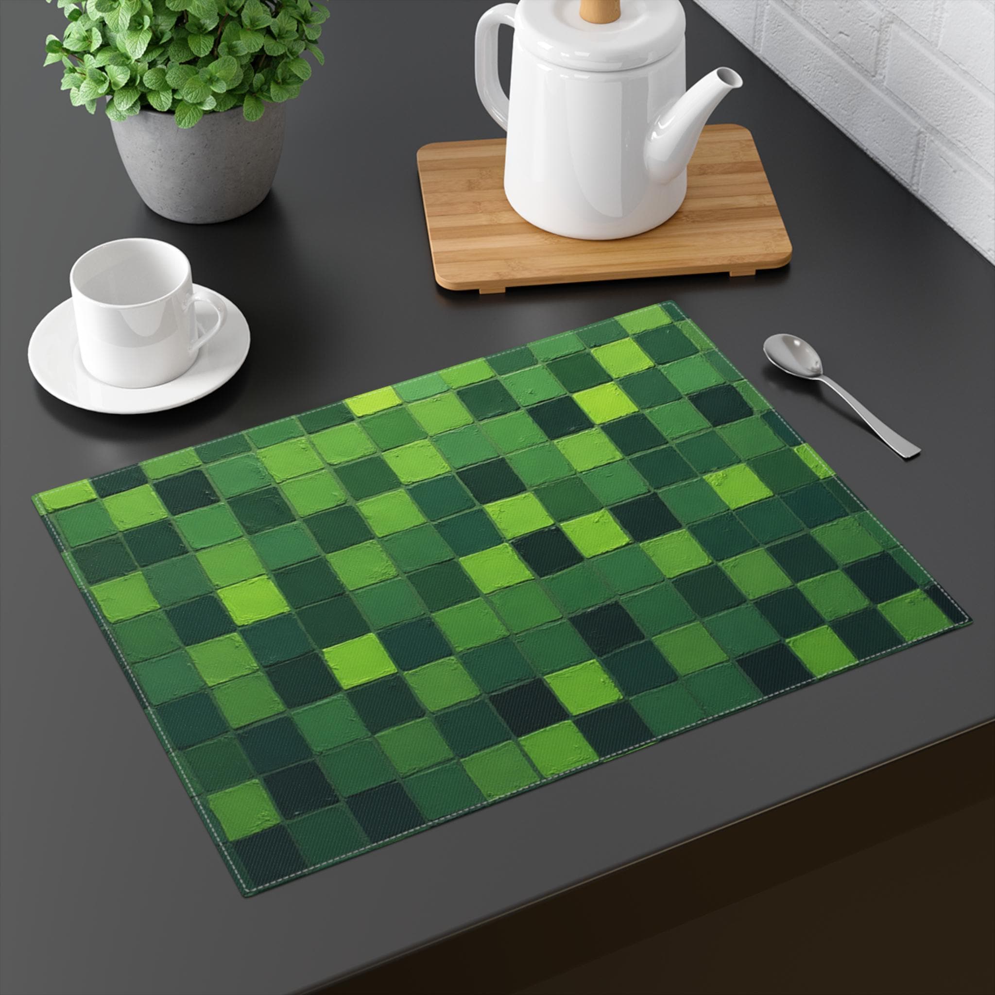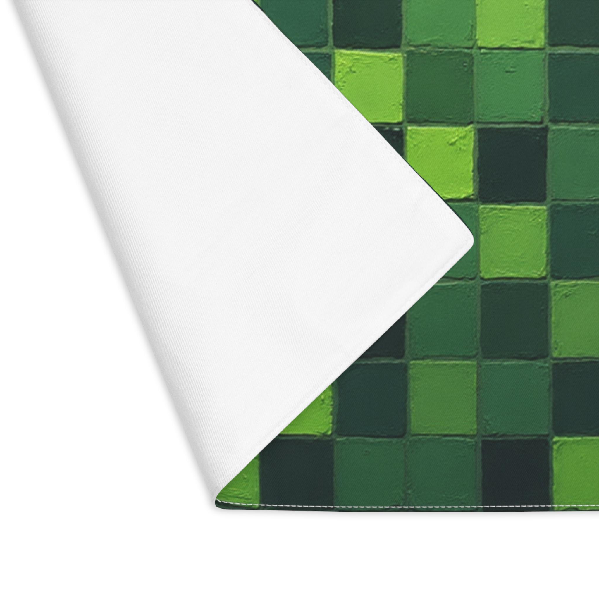 Bring a playful, retro rhythm to your table with this cotton twill placemat. A lively mosaic of green squares—ranging from lime to forest—creates depth and movement across a vintage-textured background. The double-layer cotton construction and hemmed edges offer everyday durability while the one-sided, vibrant print keeps the reverse clean and simple. Lay it down for morning tea, a casual lunch, or an evening snack to add a fresh, nature-inspired accent that feels both cozy and modern.