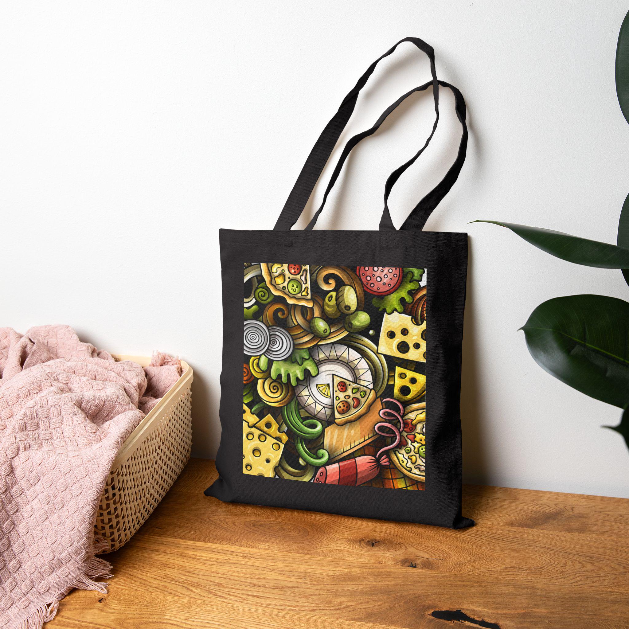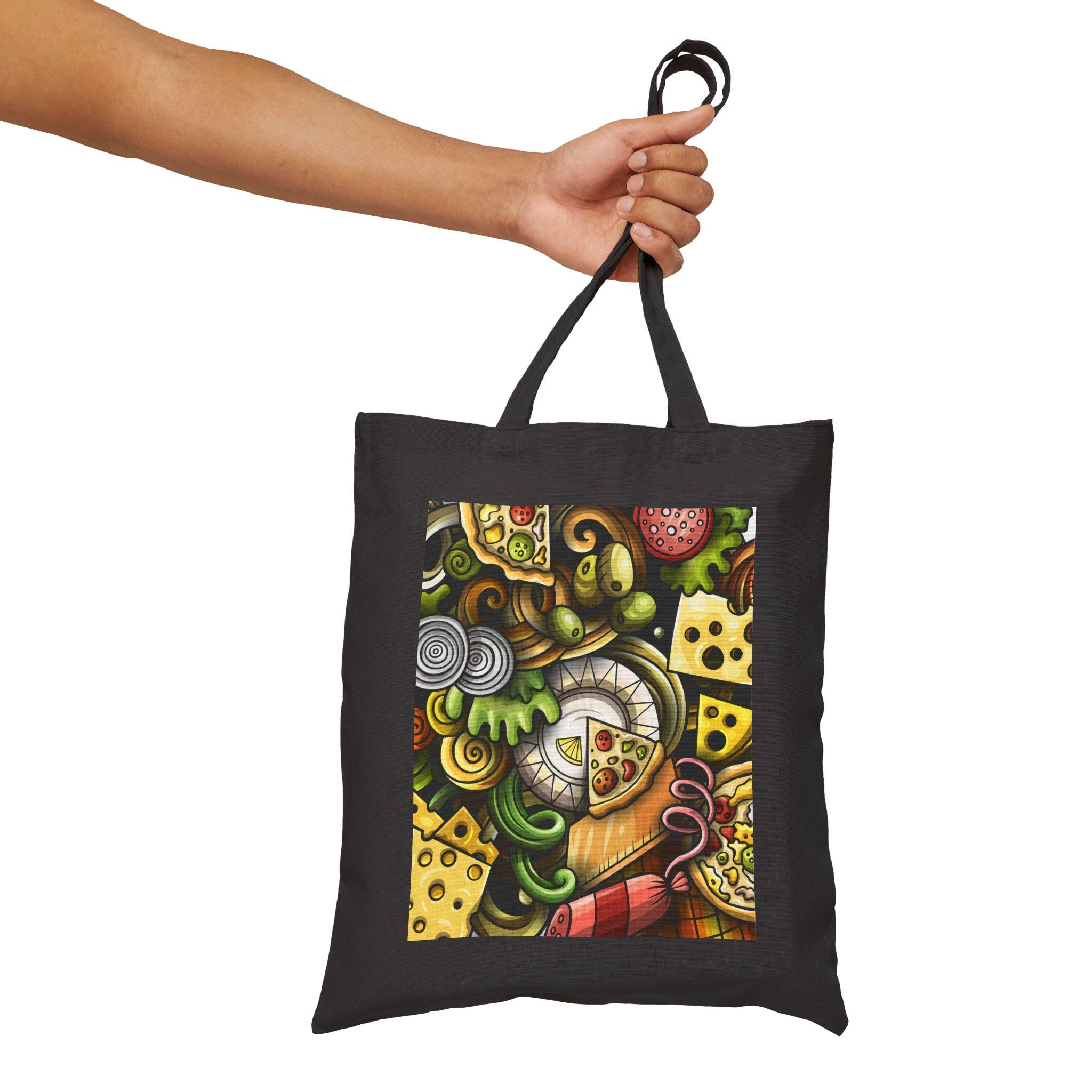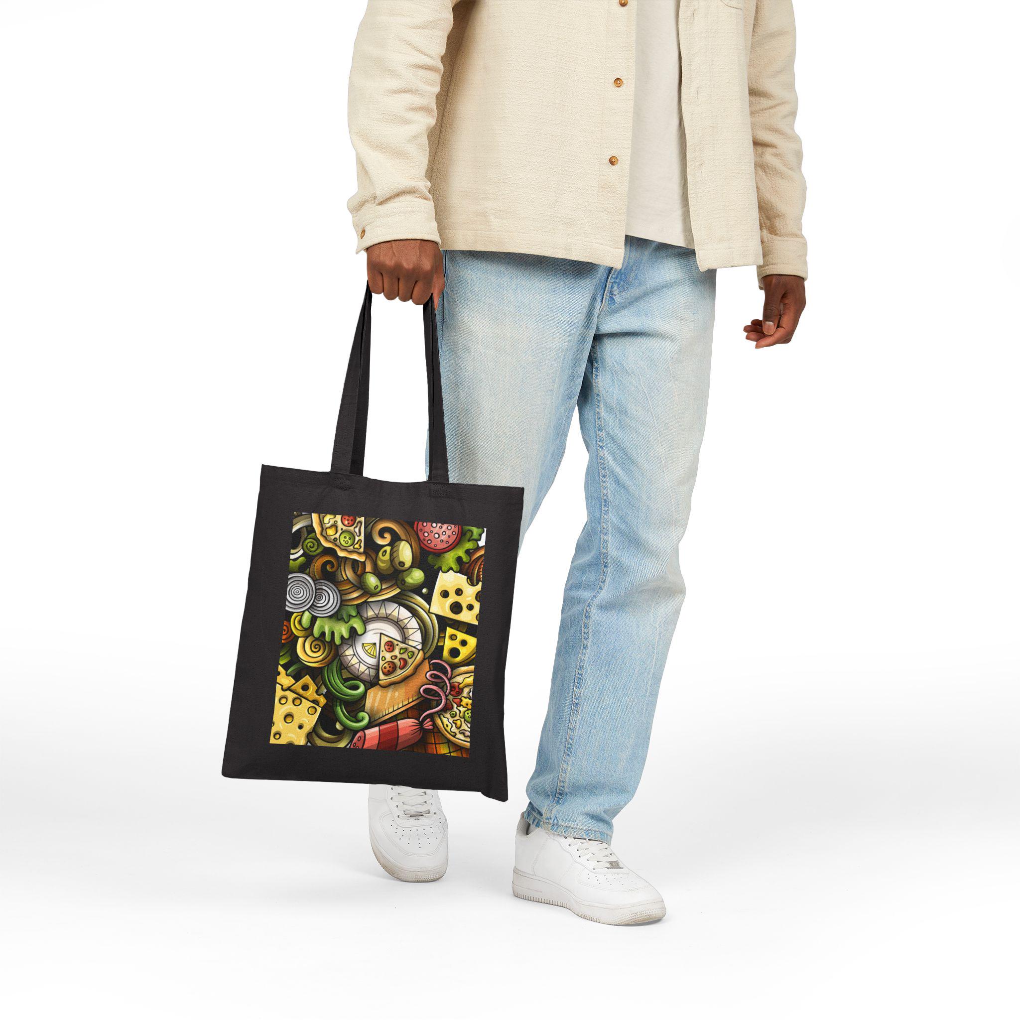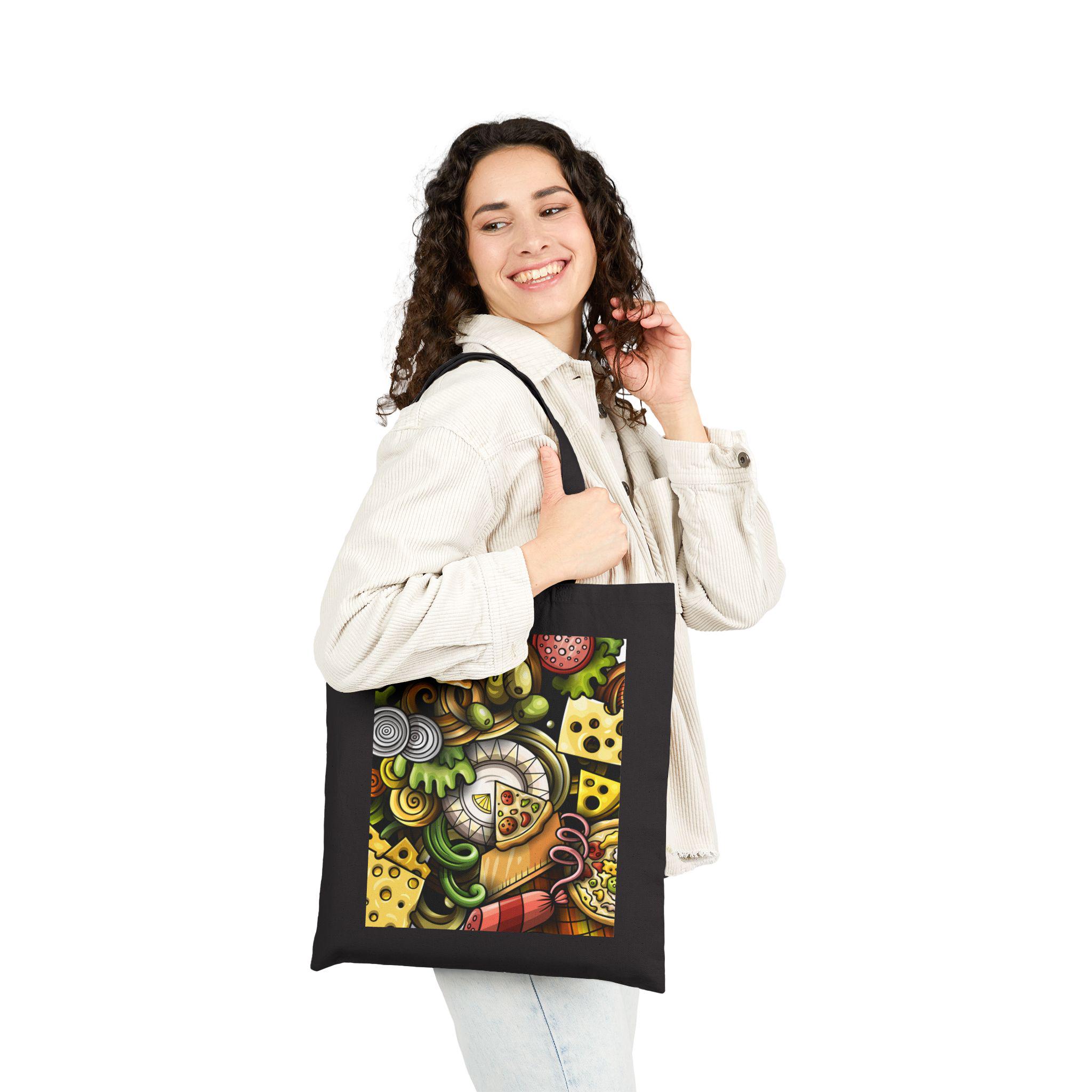 This sturdy cotton canvas tote carries a warm, whimsical food-scene print that feels like a visit to a beloved deli counter. Heavy 12 oz canvas and reinforced self-fabric handles give it a grounded, reliable weight — the kind of bag that stands up to library runs, farmers’ market hauls, or a day of city errands. The flat-corner construction keeps the print square and visible, while the sewn-in label and finely spun fibers promise long-lasting wear. Natural and black colorways let the artwork pop in different ways: black makes the rich colors sing, natural gives a softer, homey vibe. Bring this tote along to picnics, grocery trips, or casual meetups when you want something practical that also shows a little culinary joy.