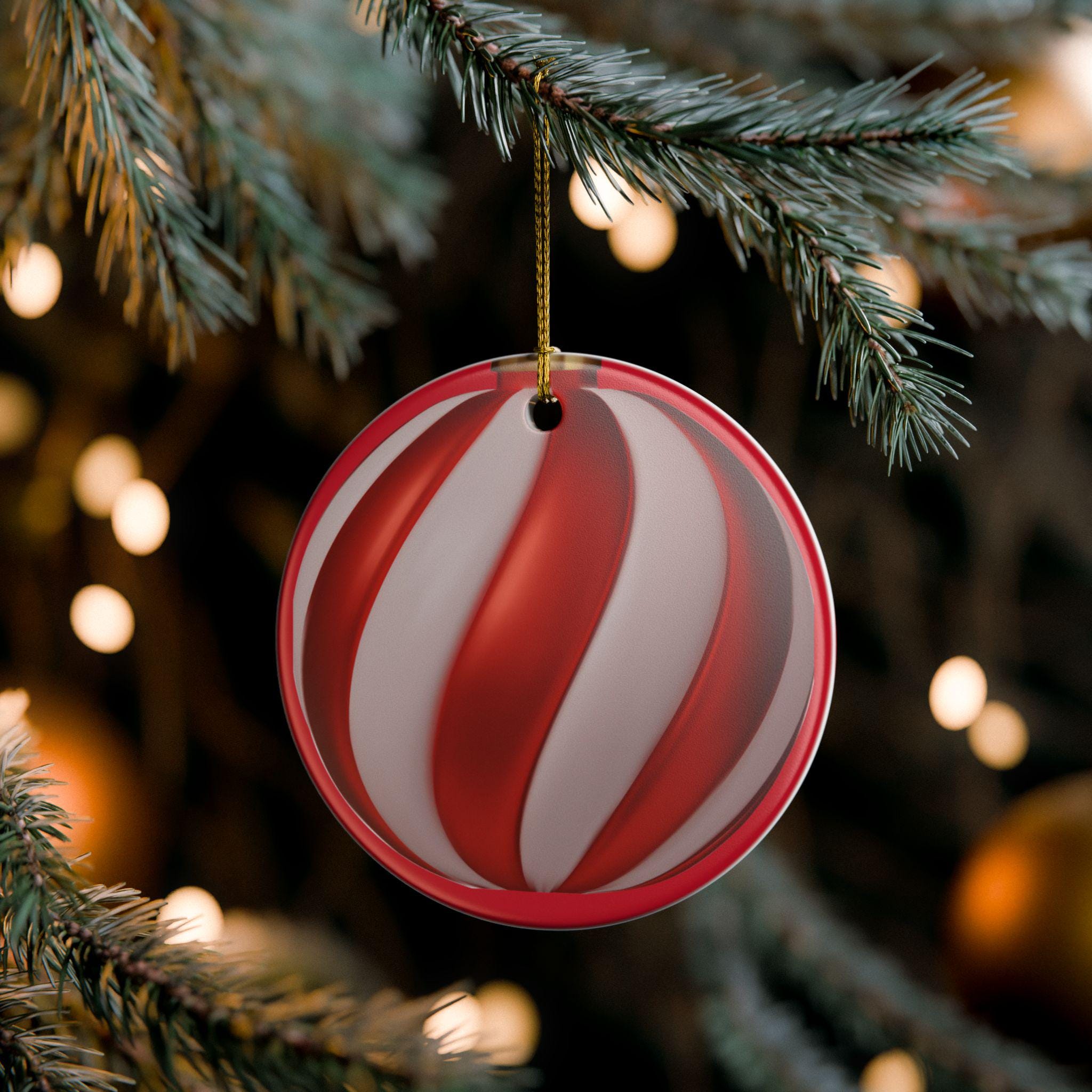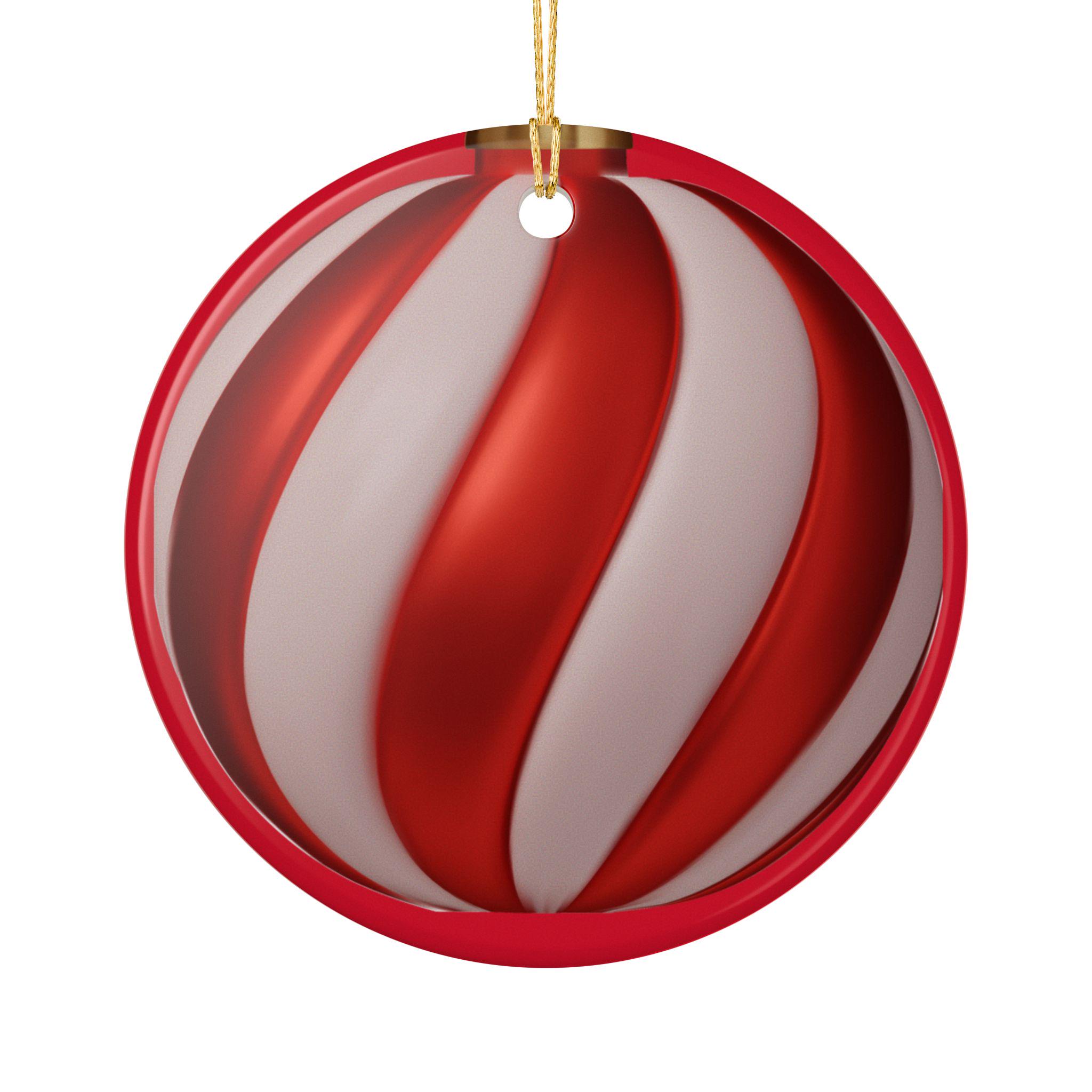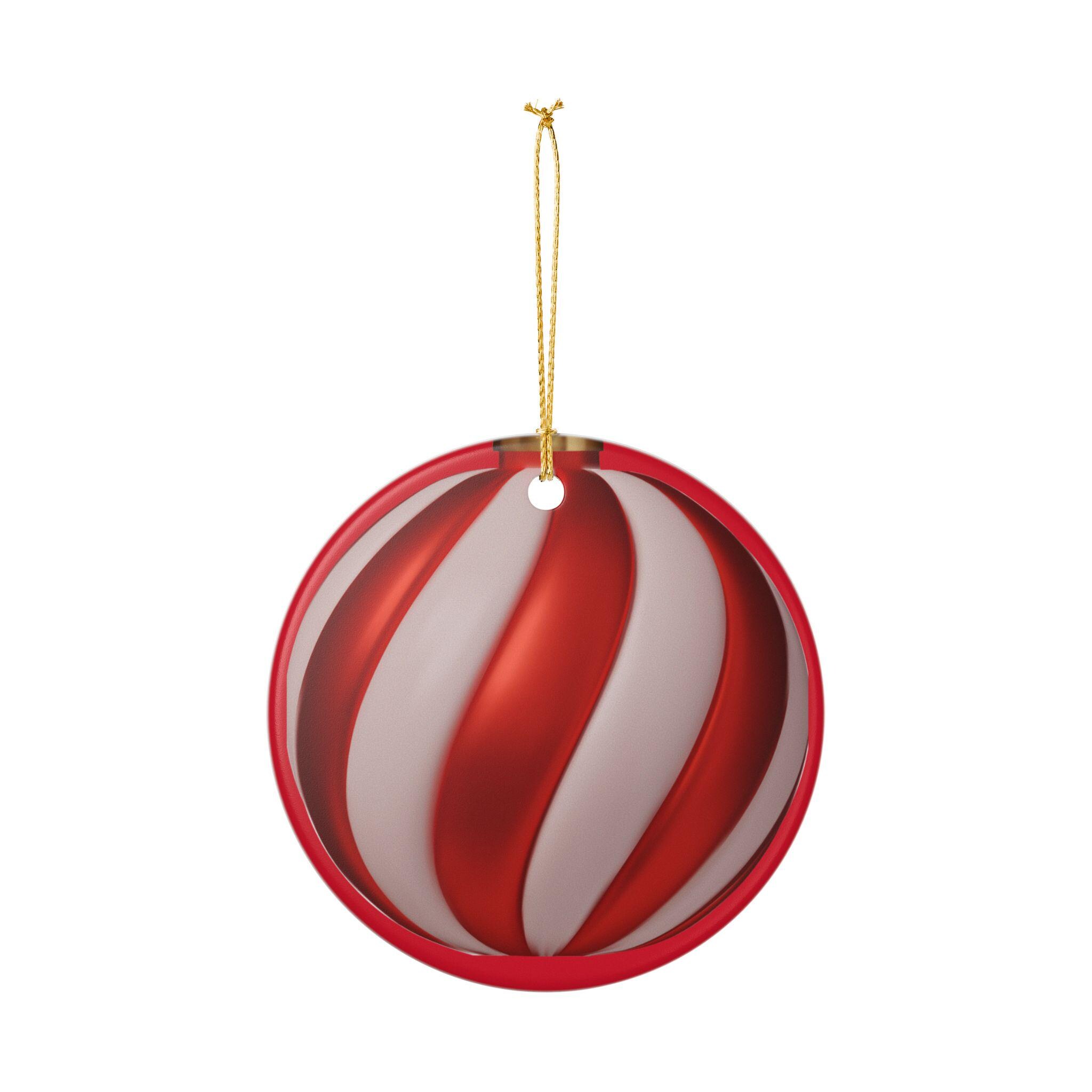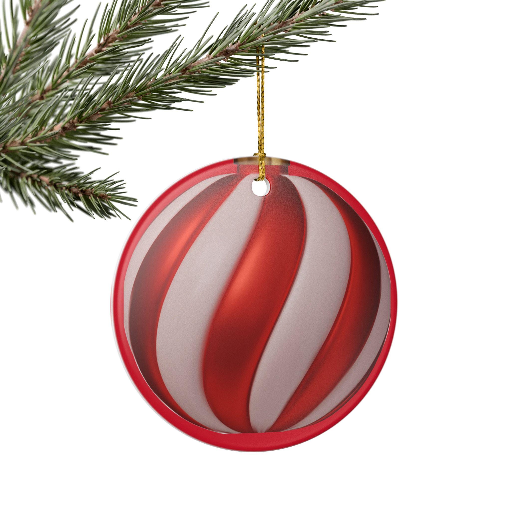 Hand-painted style swirls in candy-apple red and soft pearl white bring a warm, nostalgic glow to this round ceramic ornament. Hung by the included gold string, it catches tree lights and mantel candles with a glossy sheen while the matte-print swirls add a subtle, handcrafted feel. Lightweight but sturdy, this single-sided ornament slips easily onto boughs, wreaths, or gift tags and blends with both modern and vintage holiday decor. It evokes cozy evenings arranging decorations, the quiet thrill of unveiling childhood favorites, and the simple pleasure of adding one more meaningful piece to a home’s seasonal story.