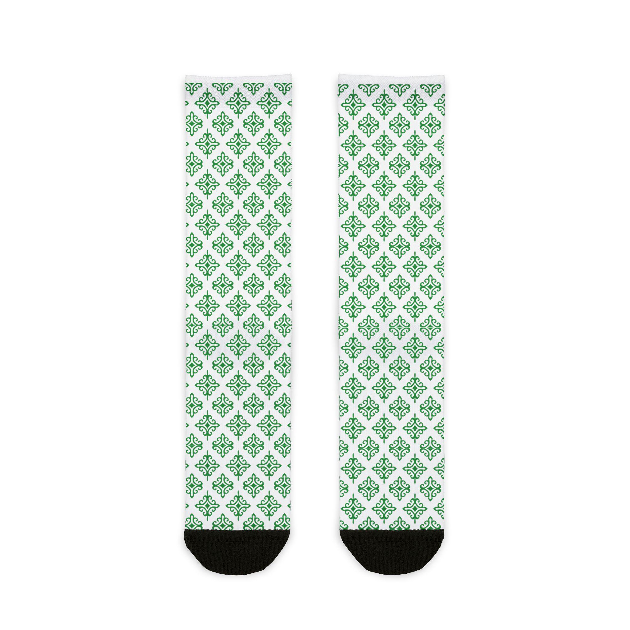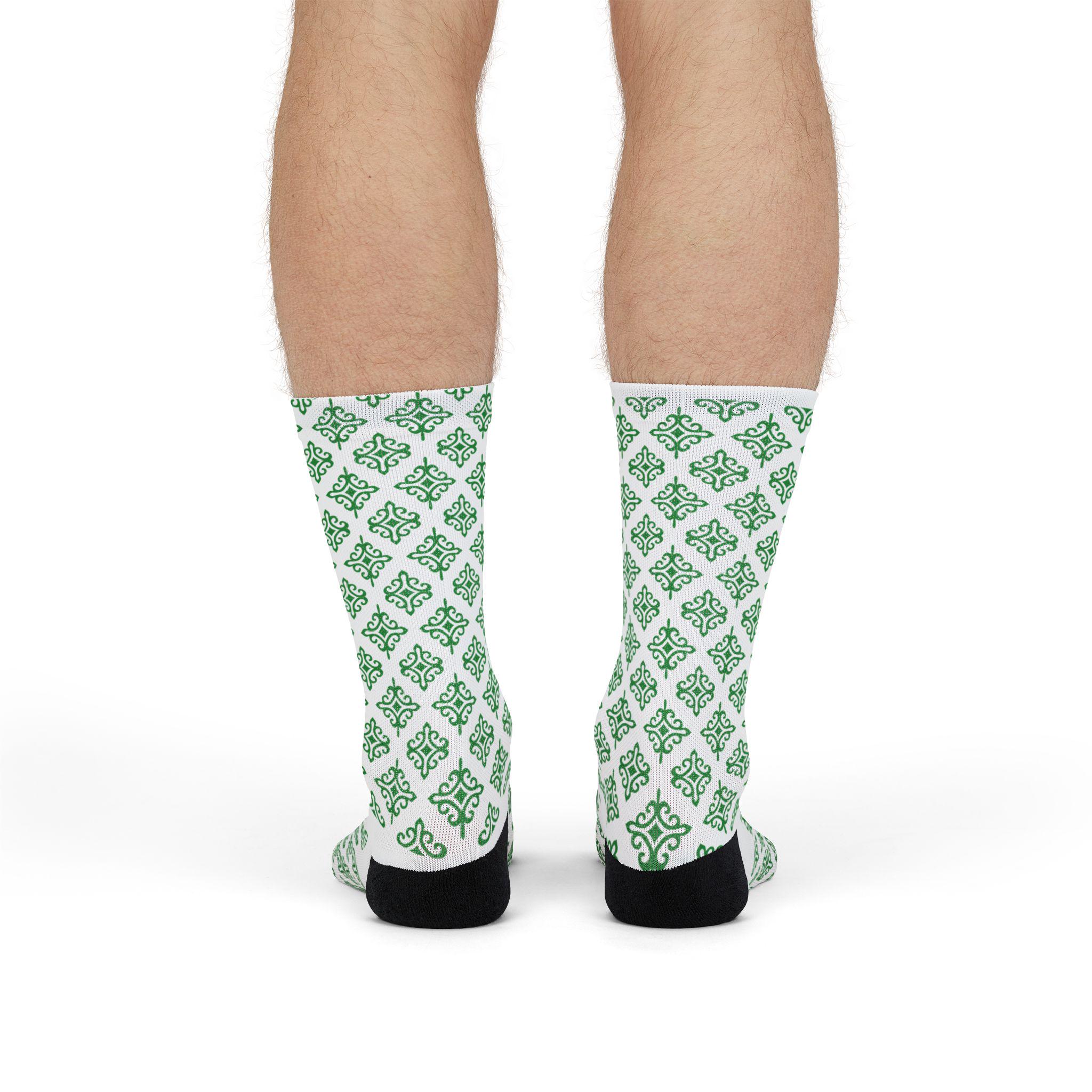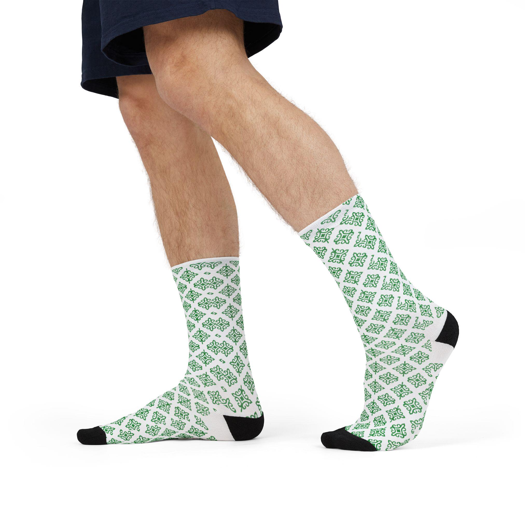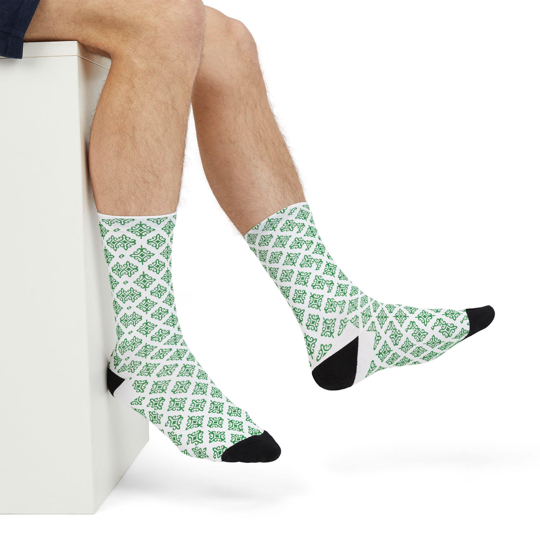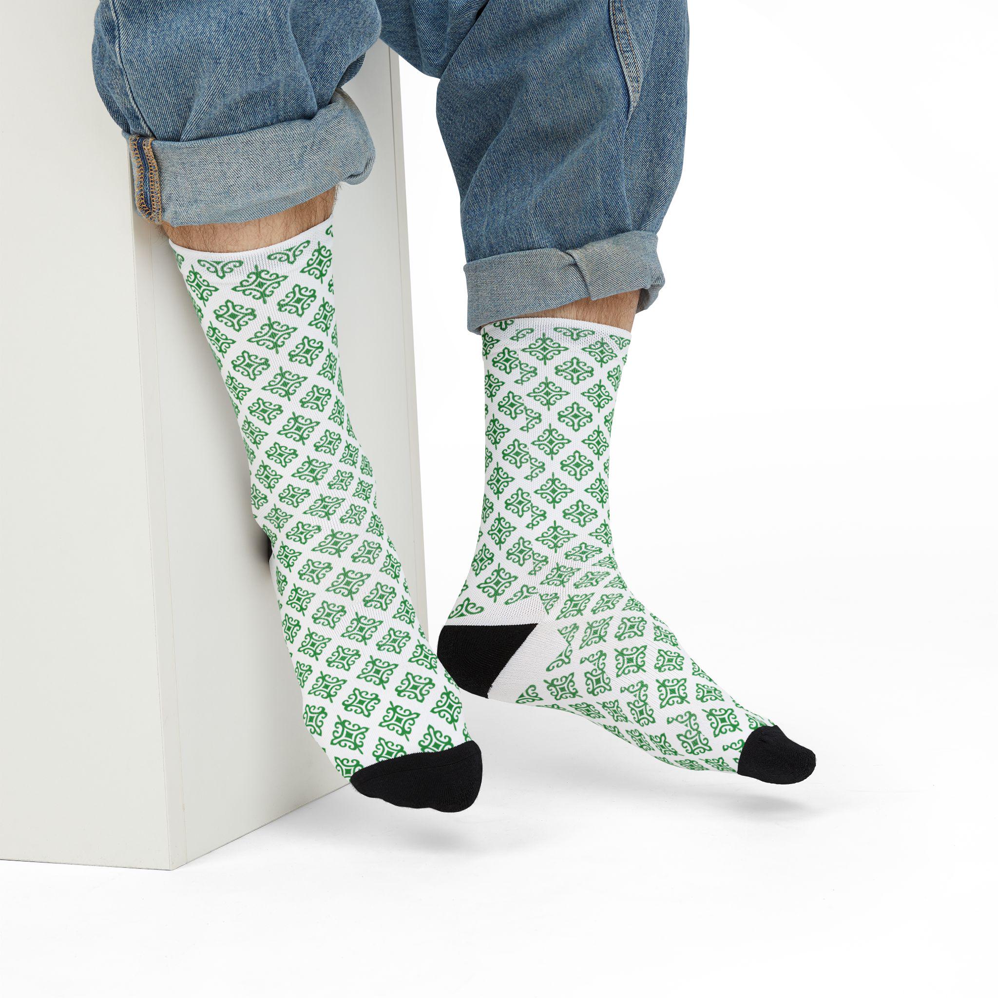 These crew socks bring a quiet, thoughtful energy to everyday wear. A subtle lattice of green shamrock-like motifs repeats across a crisp white background, giving a fresh, garden-like rhythm that stays visible whether you’re on a walk, at your desk, or cozying up at home. The lightweight, quick-drying knit sits comfortably against the skin while the reinforced black heel and toe add durability where you need it most. They slip easily into casual and slightly dressed-up outfits, and layer well with boots or low-profile sneakers. Wear them when you want a small, cheerful detail that quietly lifts the rest of your look.