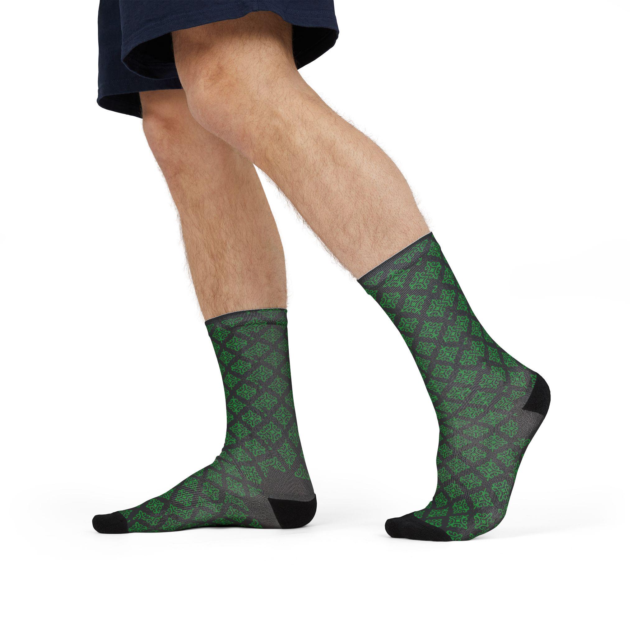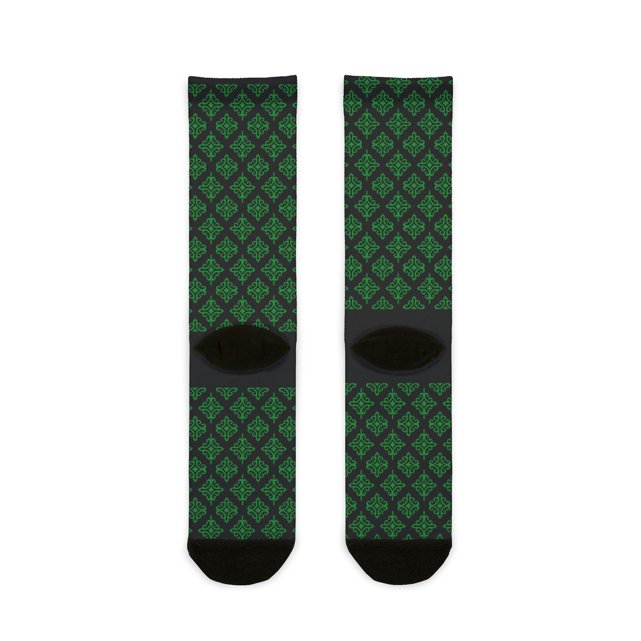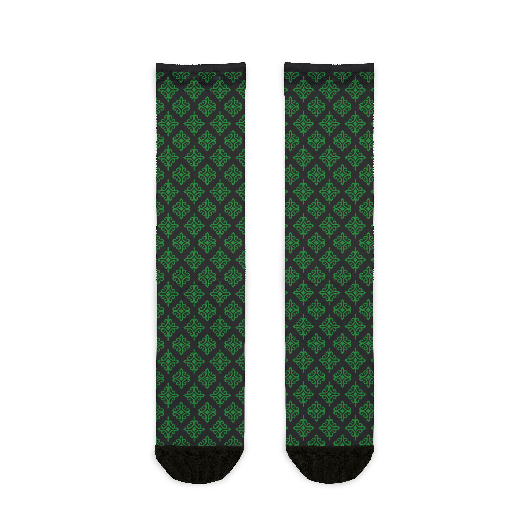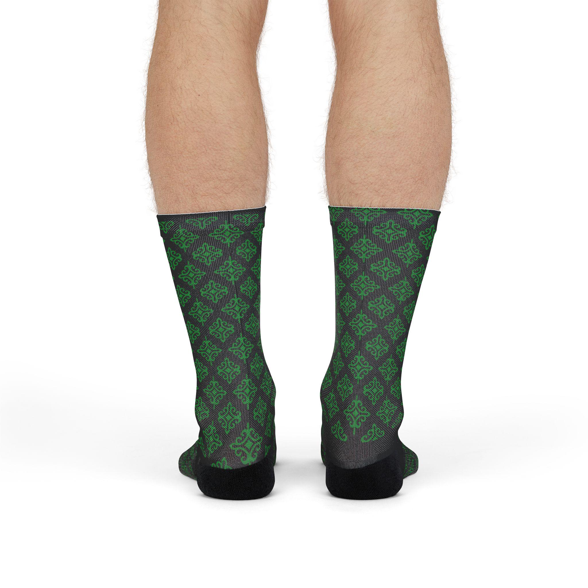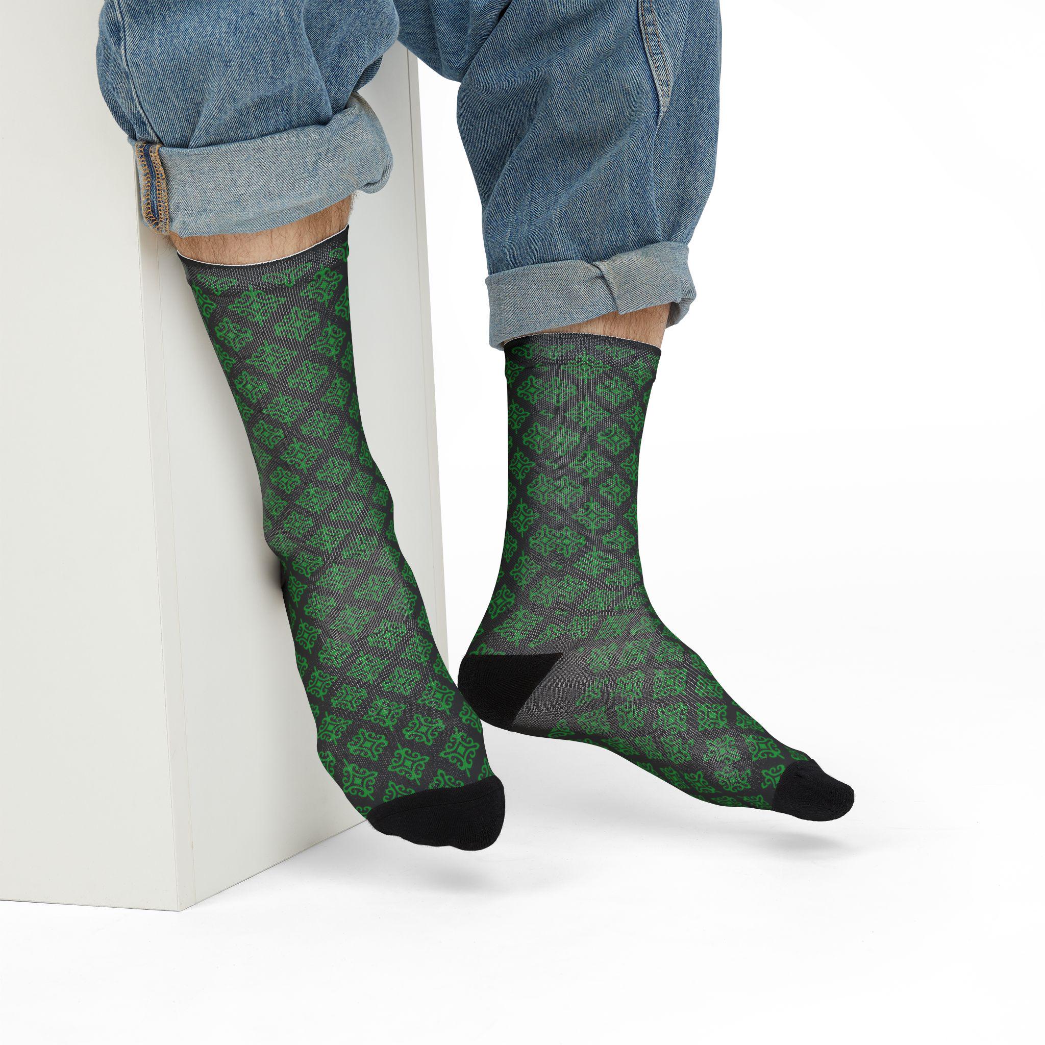These crew socks bring a subtle, grown-up pattern into everyday wear. The deep green lattice and tiny clover motifs sit against a soft, lightweight knit that stretches to fit a wide range of sizes. Slip them on with boots or loafers for a touch of pattern under a calm, neutral outfit. They hold their shape thanks to a resilient synthetic blend and 200-needle knit, so the texture stays smooth through many wears and washes. The black heel and toe give a neat, finished look that hides scuffs while the crew length offers coverage and a little extra warmth on cooler commutes or quiet evenings at home.
