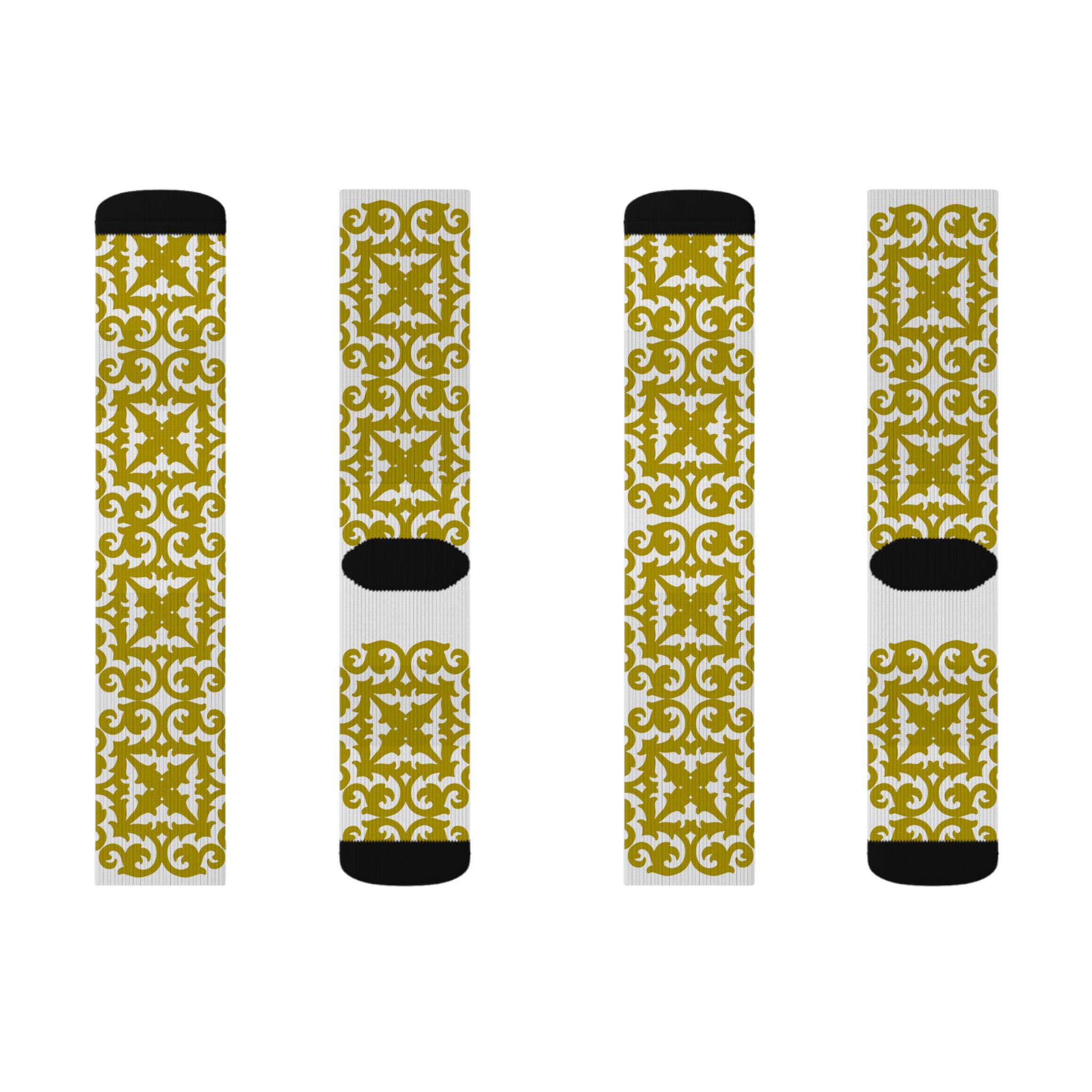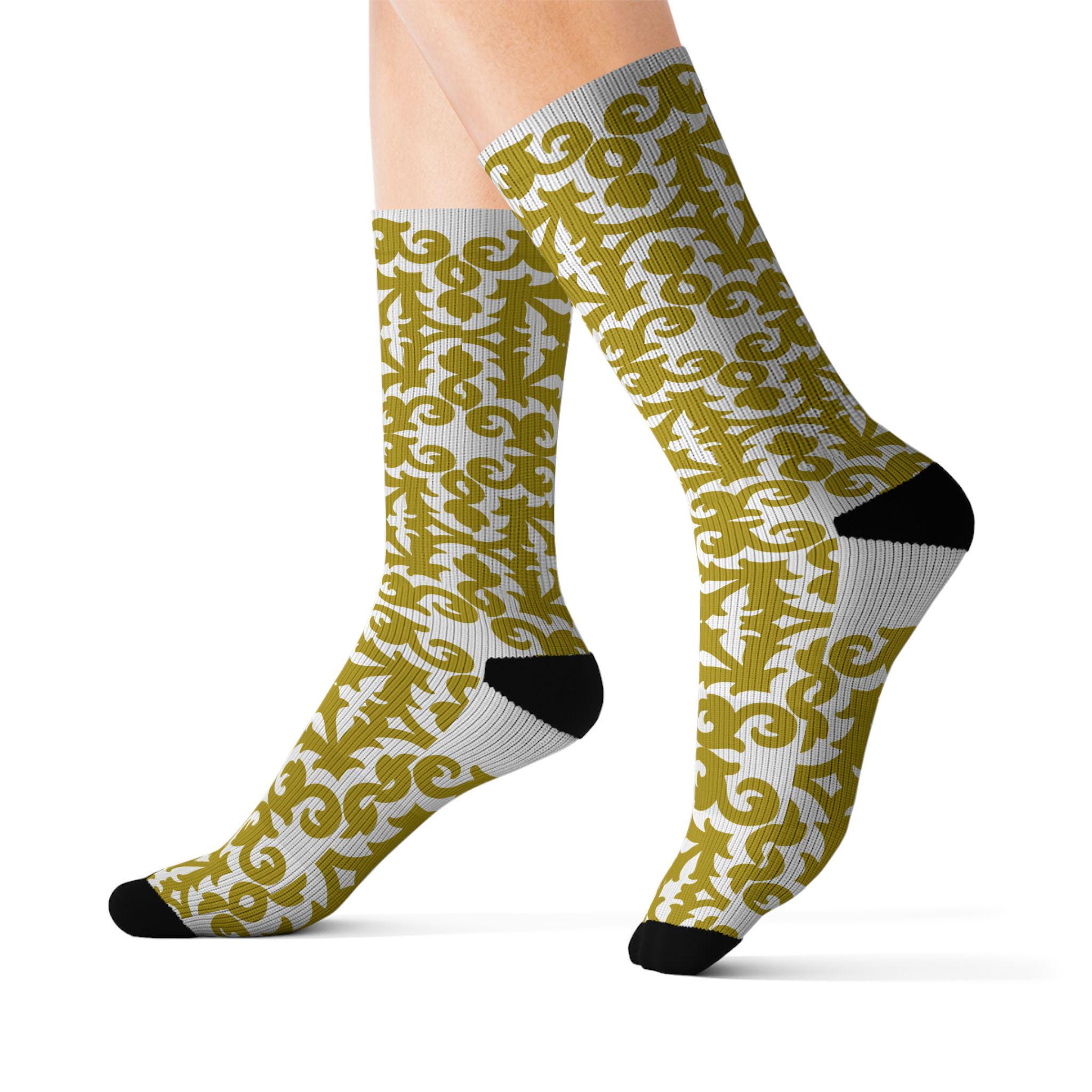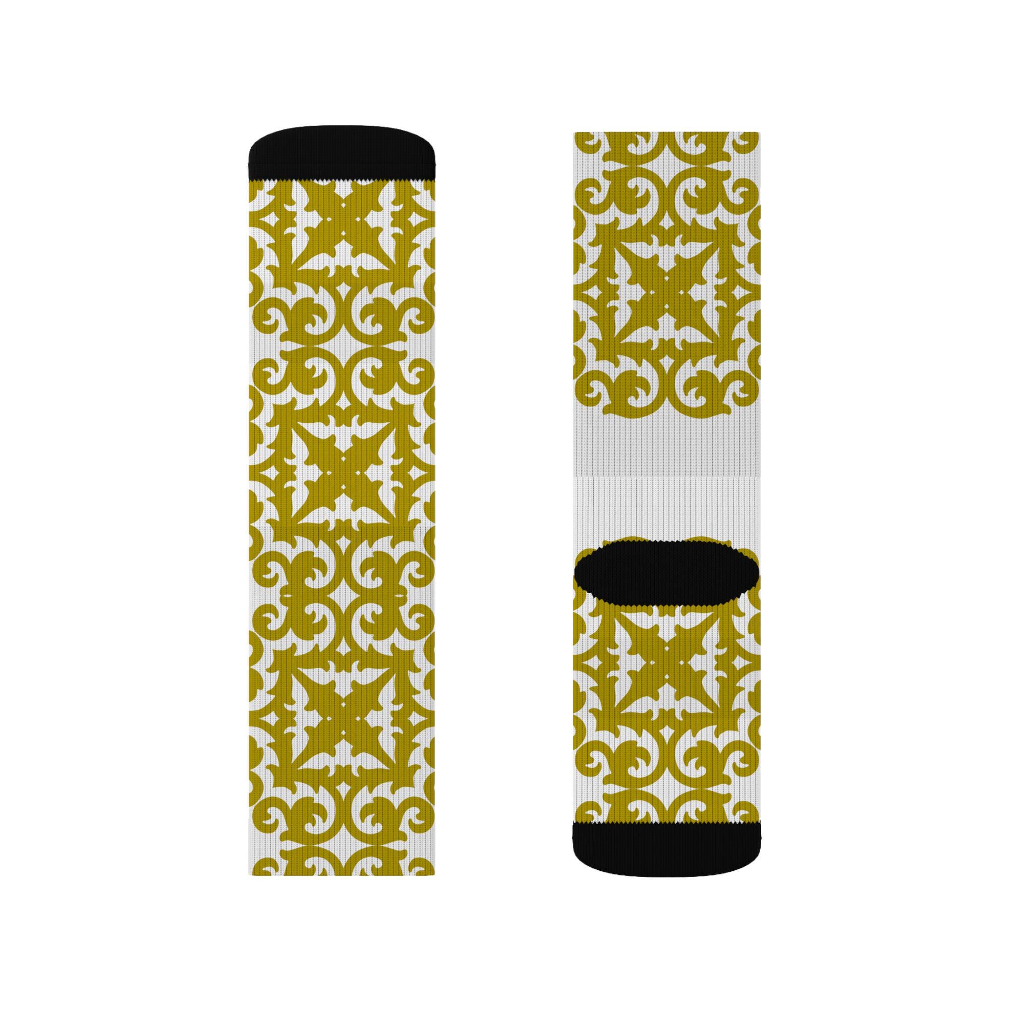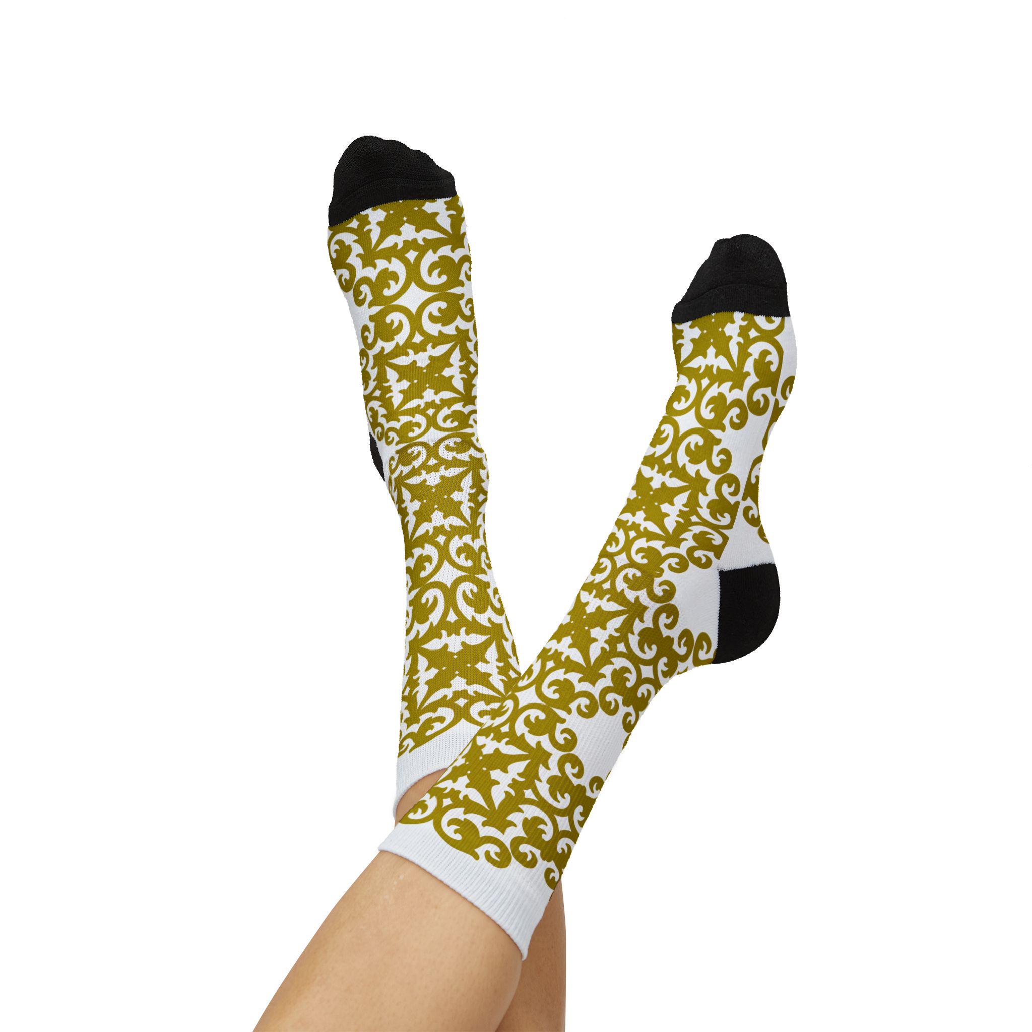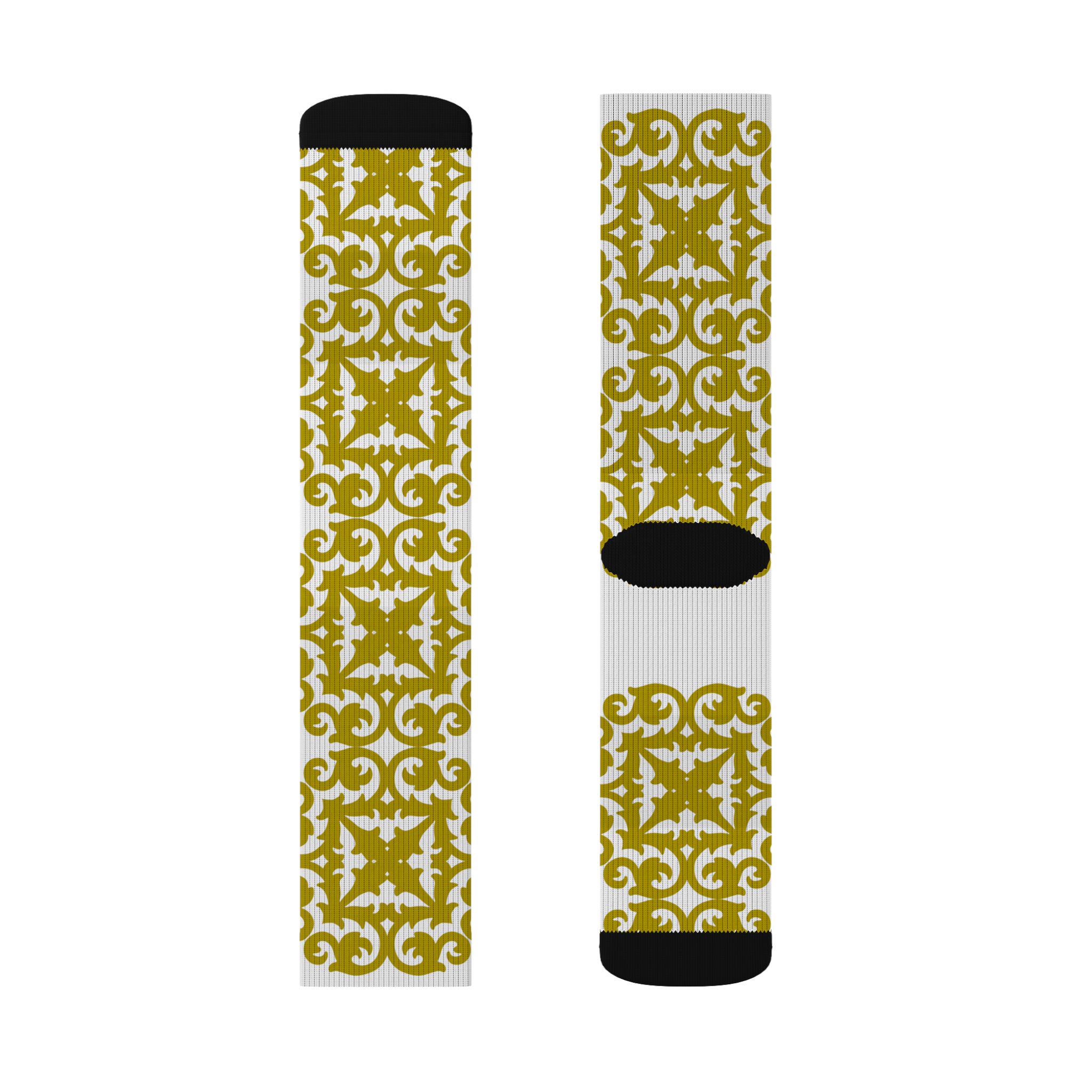 These crew-length sublimation socks bring a touch of vintage tile charm to everyday wear. The all-over print wraps an ornate, repeating motif around the leg and foot, while the cushioned bottoms and fleece lining deliver cozy warmth and gentle support during long days on your feet. The ribbed tube and unisex regular fit keep the sock snug without squeezing, and the polyester-spandex blend holds the printed details crisp and bright. Small seam color variation is normal with flat sublimation printing, adding to the handmade, textile feel. Wear them with boots, loafers, or while lounging at home — they keep toes warm and style quietly confident.
