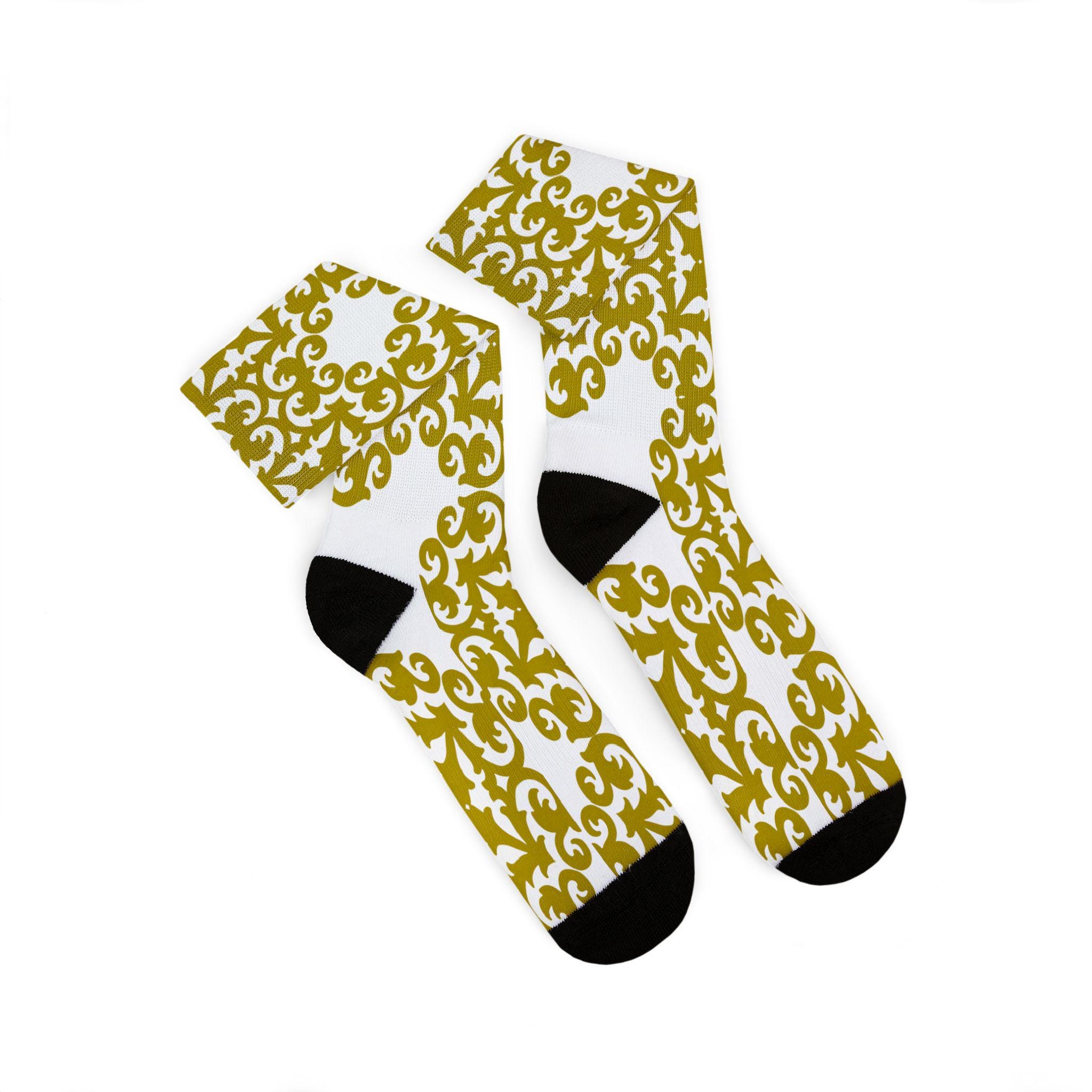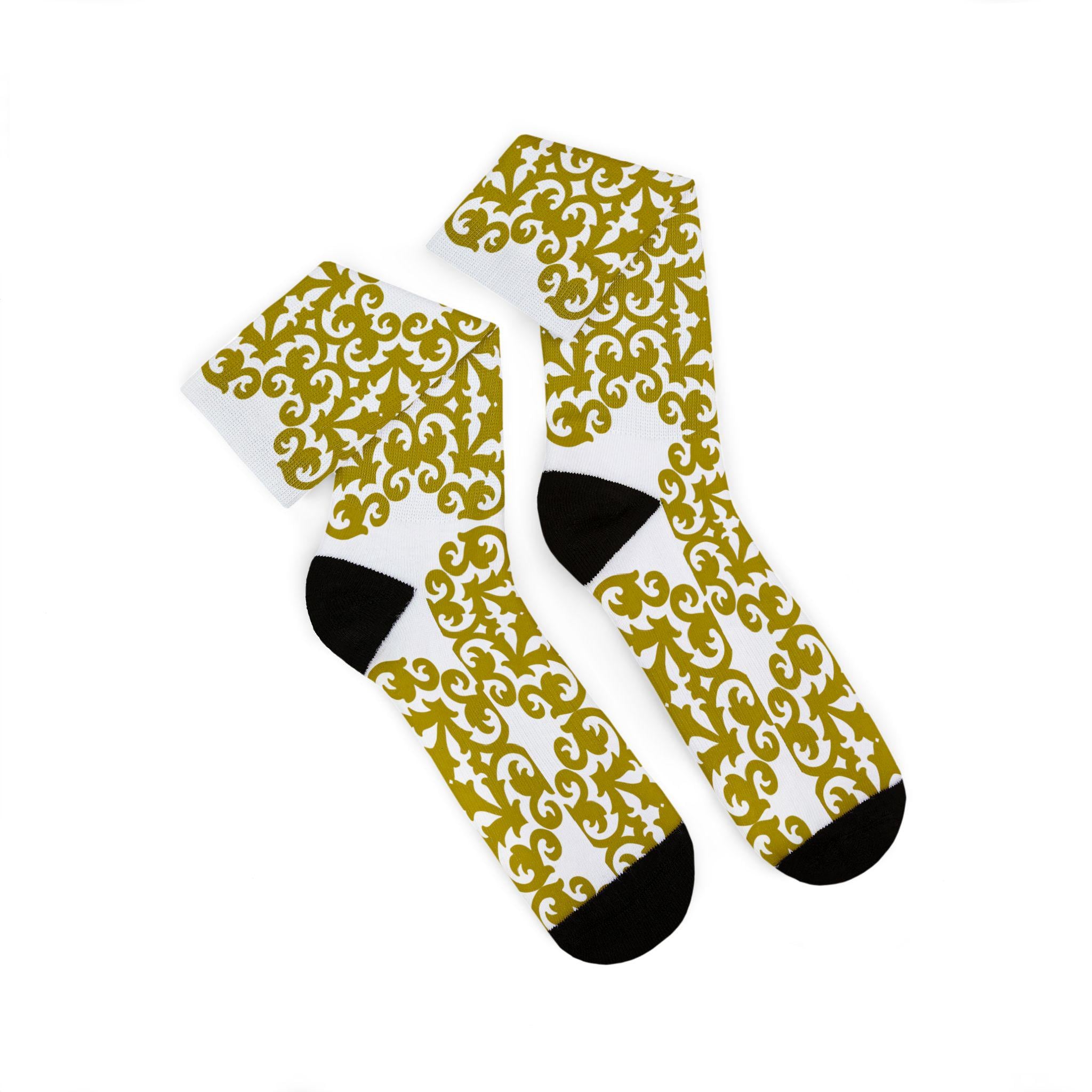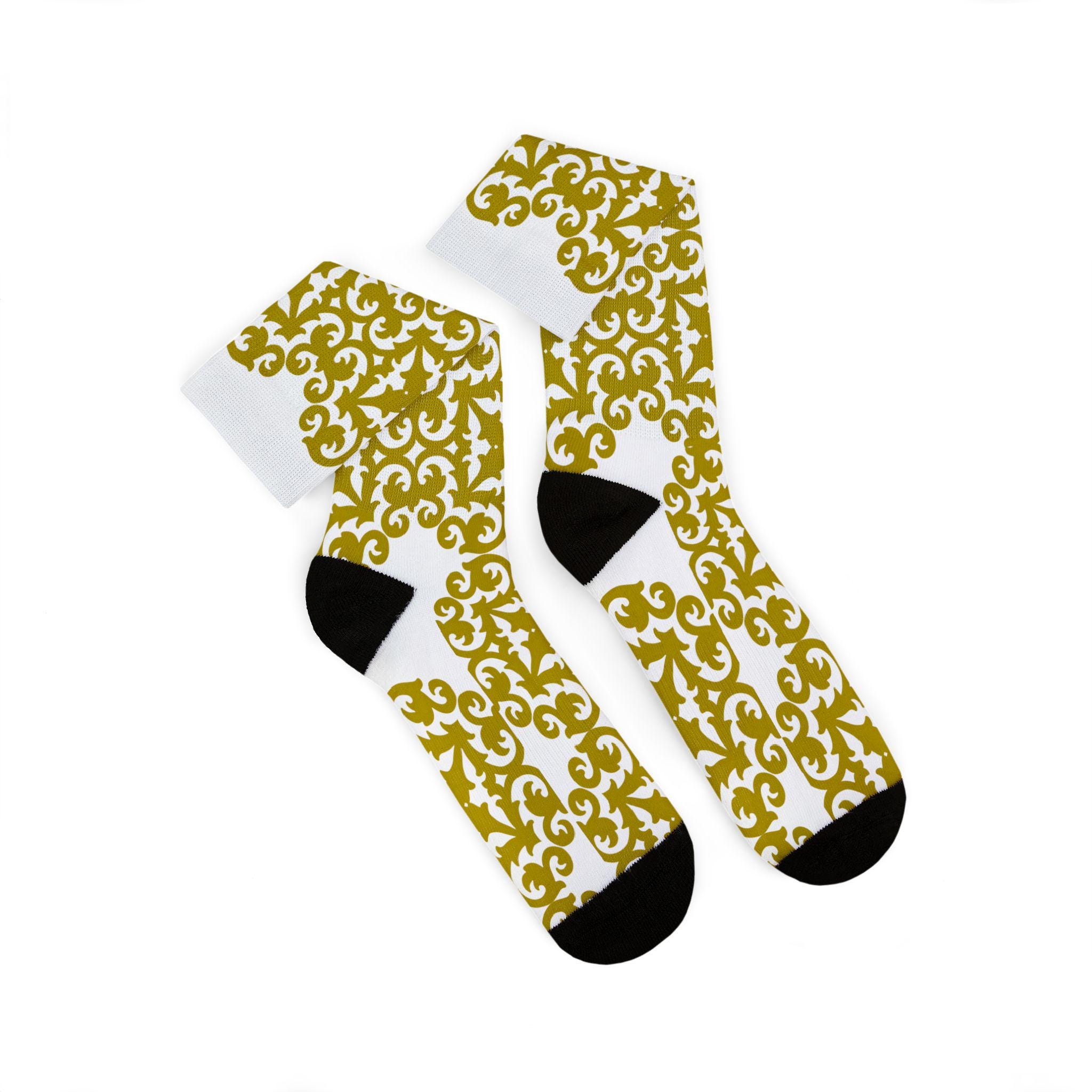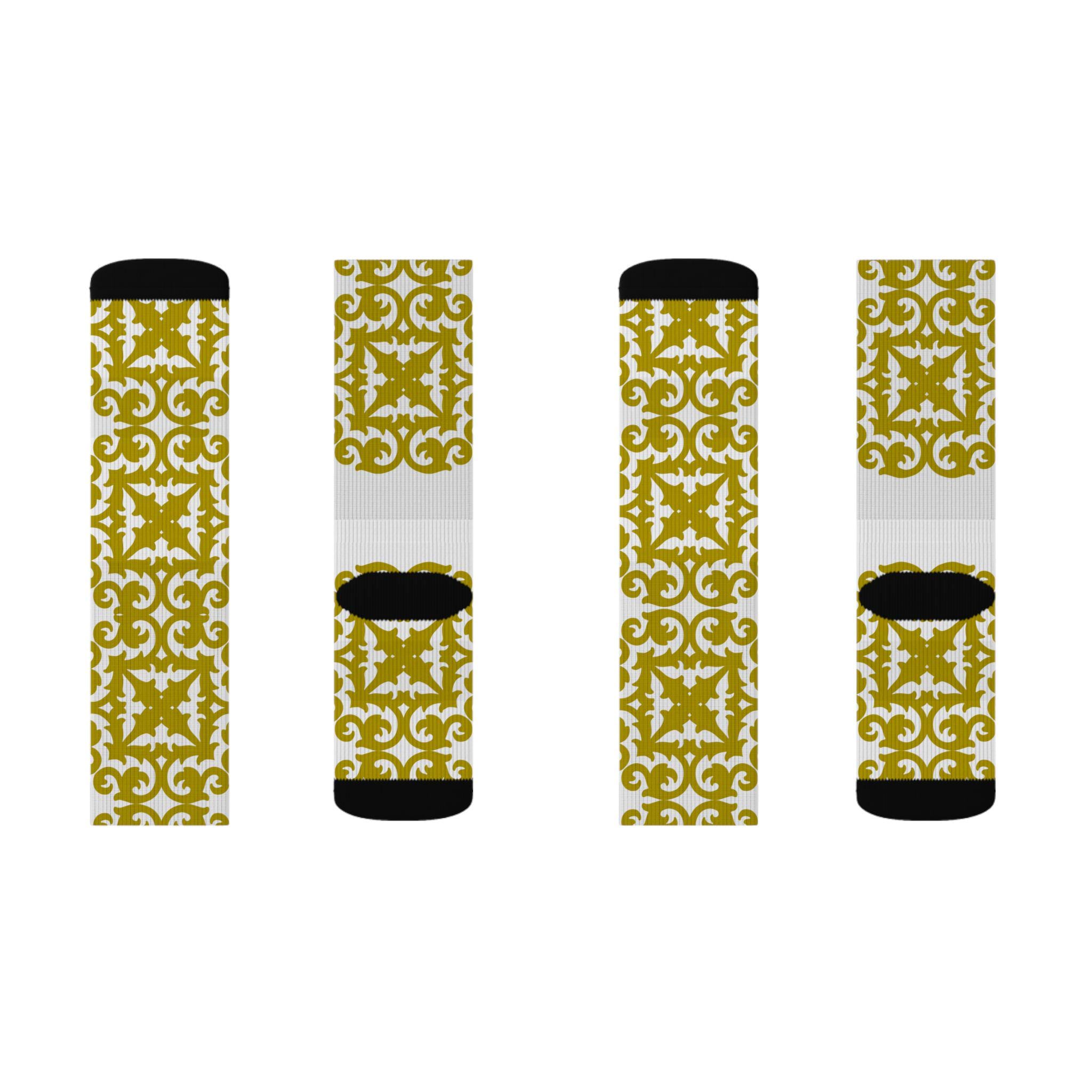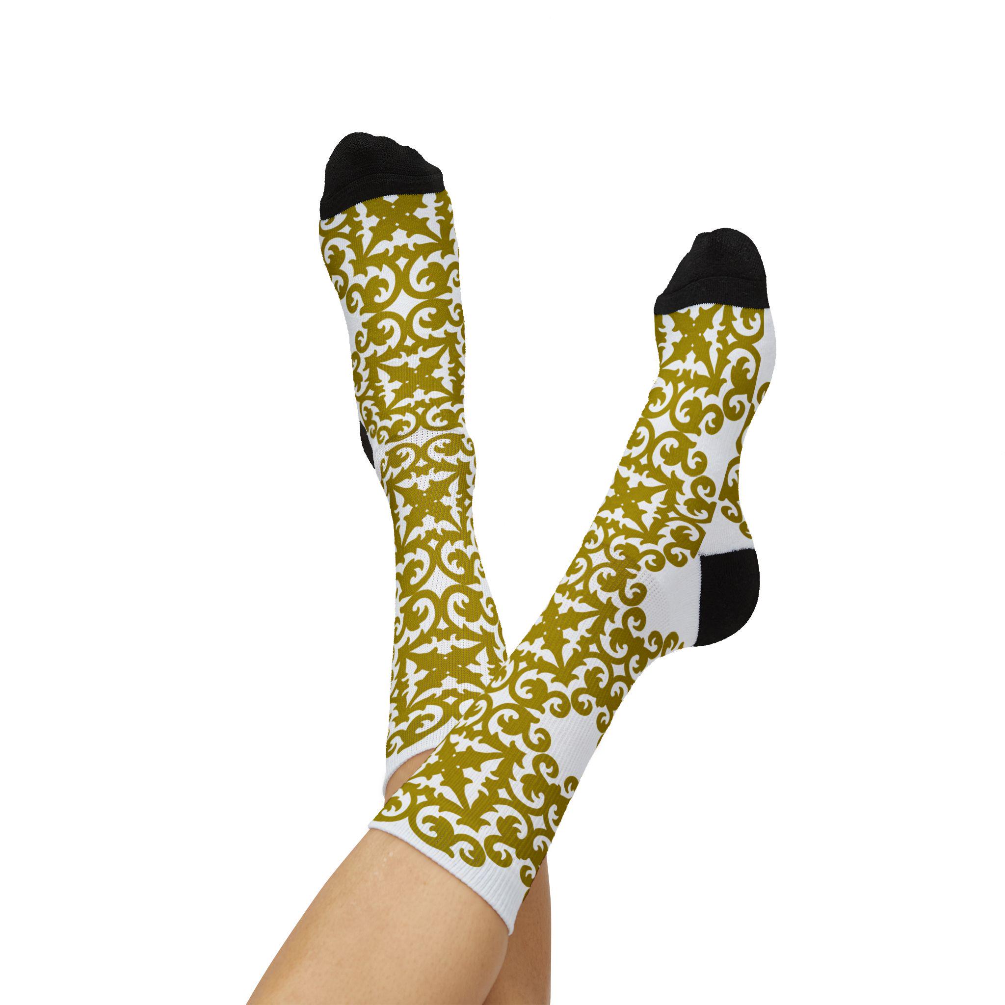 These crew-length sublimation socks bring a touch of vintage tile charm to everyday wear. The all-over print wraps an ornate, repeating motif around the leg and foot, while the cushioned bottoms and fleece lining deliver cozy warmth and gentle support during long days on your feet. The ribbed tube and unisex regular fit keep the sock snug without squeezing, and the polyester-spandex blend holds the printed details crisp and bright. Small seam color variation is normal with flat sublimation printing, adding to the handmade, textile feel. Wear them with boots, loafers, or while lounging at home — they keep toes warm and style quietly confident.