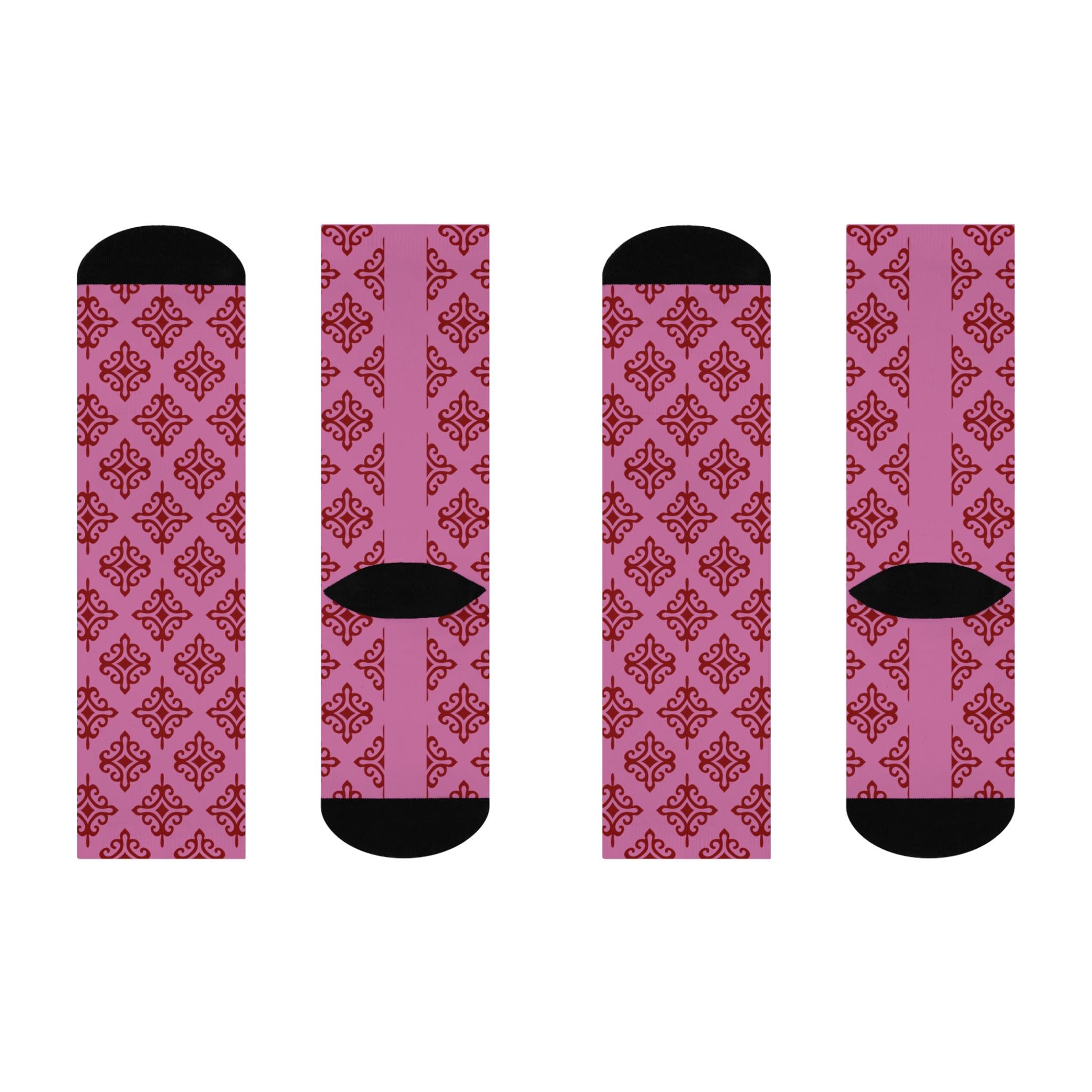 Knee-height cushioned crew socks with a warm, vintage-inspired tile motif in rosy pink and deep rose. The all-over print wraps the leg in a repeating ornamental pattern while black heel and toe panels add contrast and durability. Soft, stretchy knit breathes with each step and the 200-needle construction gives a smooth surface for crisp colors. These socks slip into everyday routines — sliding on for a long day at the desk, peeking out under a skirt on crisp mornings, or keeping toes cozy during late-night reading. They feel like a small, deliberate detail that lifts an outfit and comforts tired feet after a long commute or a slow weekend at home.