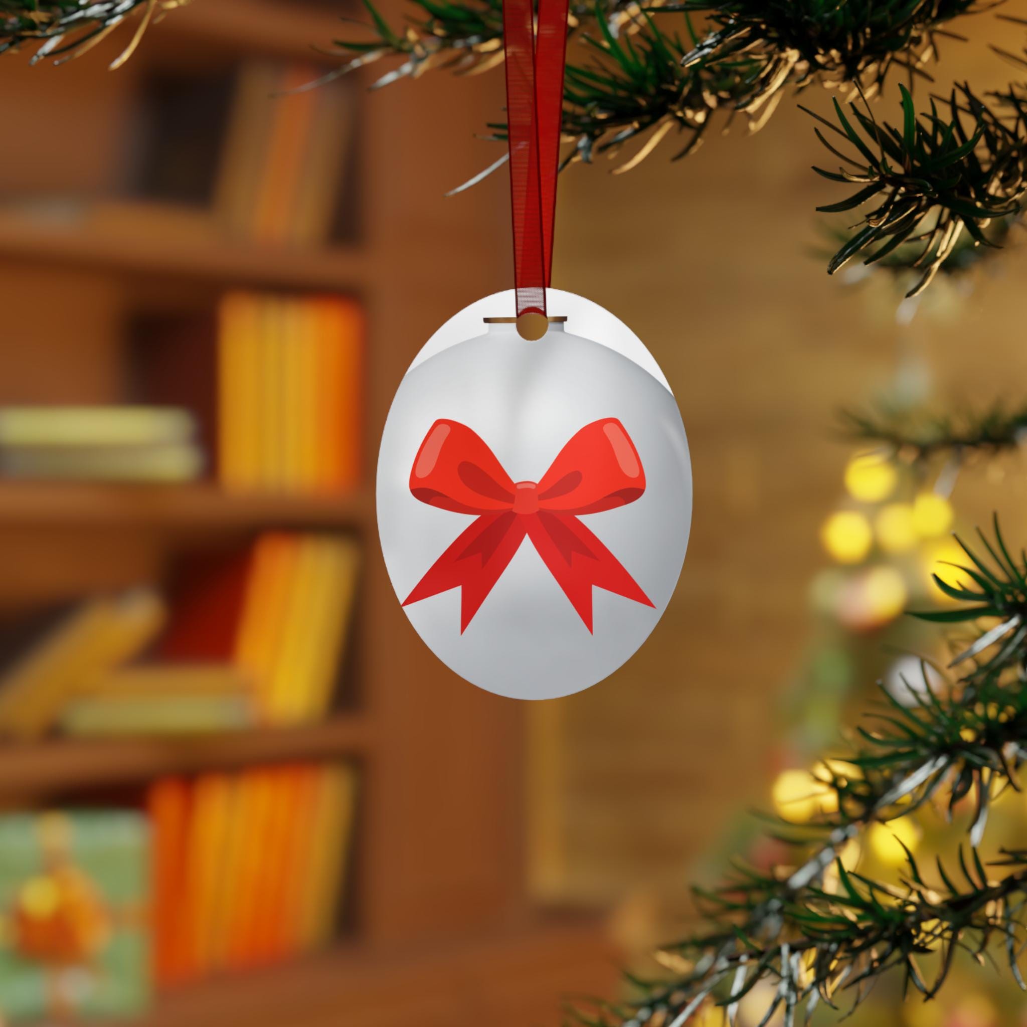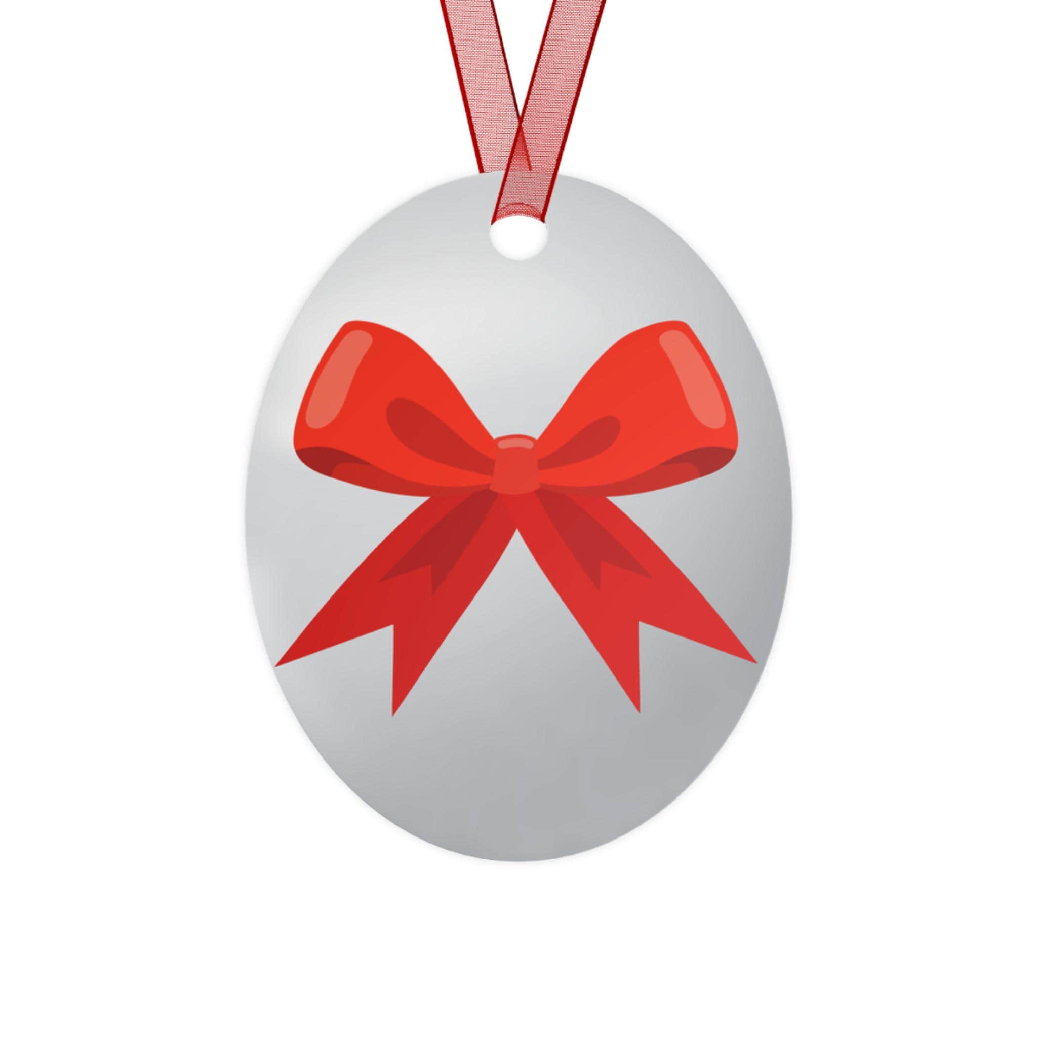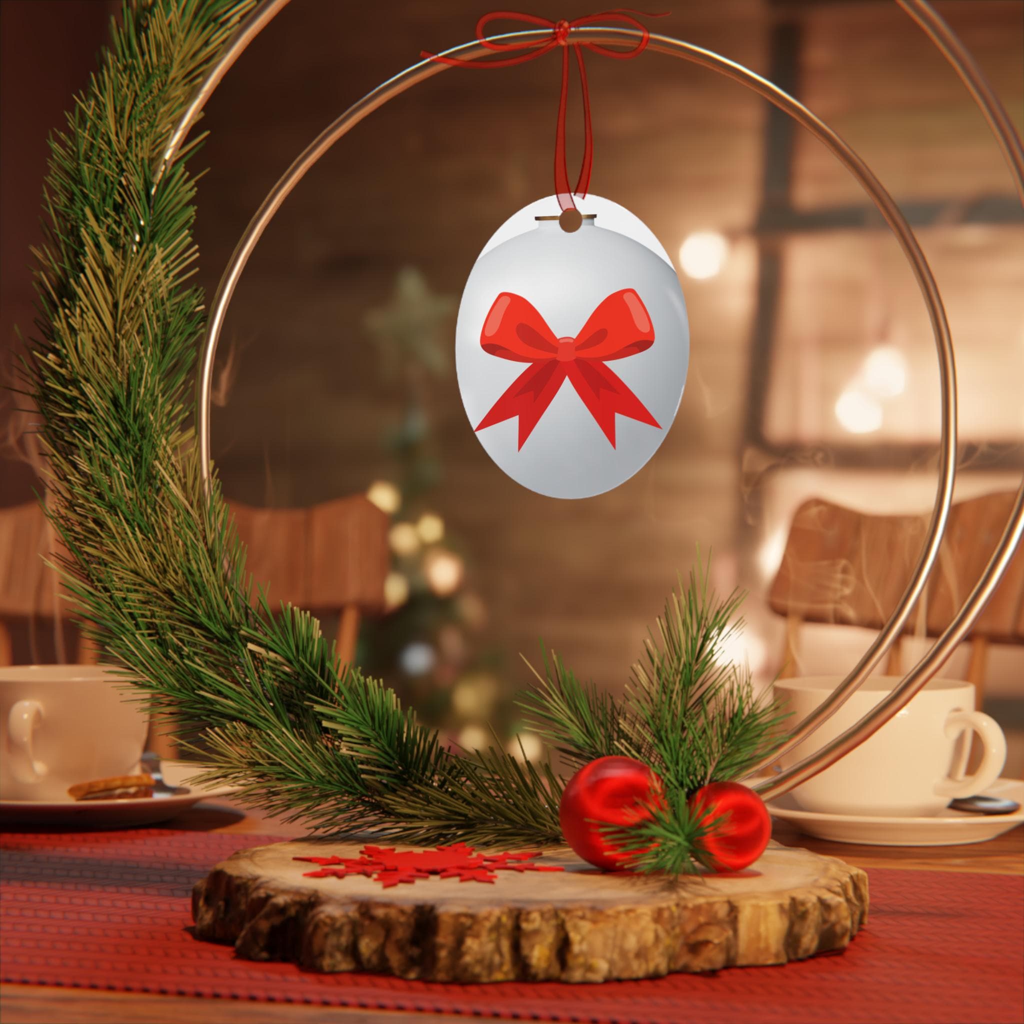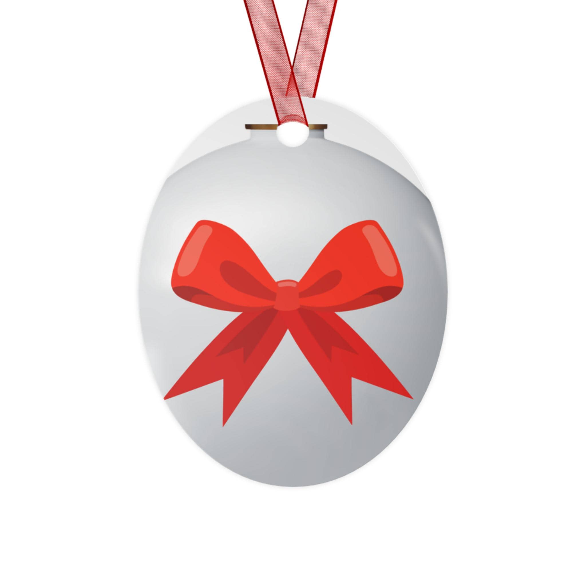 A bright, glossy metal ornament that brings a touch of handcrafted holiday cheer to every branch. Lightweight aluminum with a white gloss finish keeps the red ribbon and bow artwork vivid on both sides. Each ornament arrives with a red hanging ribbon threaded through a pre-drilled hole so it’s ready to hang on the tree, wreath, or garland. The durable, scratch- and chip-resistant surface holds up year after year, keeping the cheerful bow motif sharp and festive. Choose from four classic shapes – bell, tree, round, or oval – to mix and match a personalized look for mantel displays, memory trees, or seasonal décor.