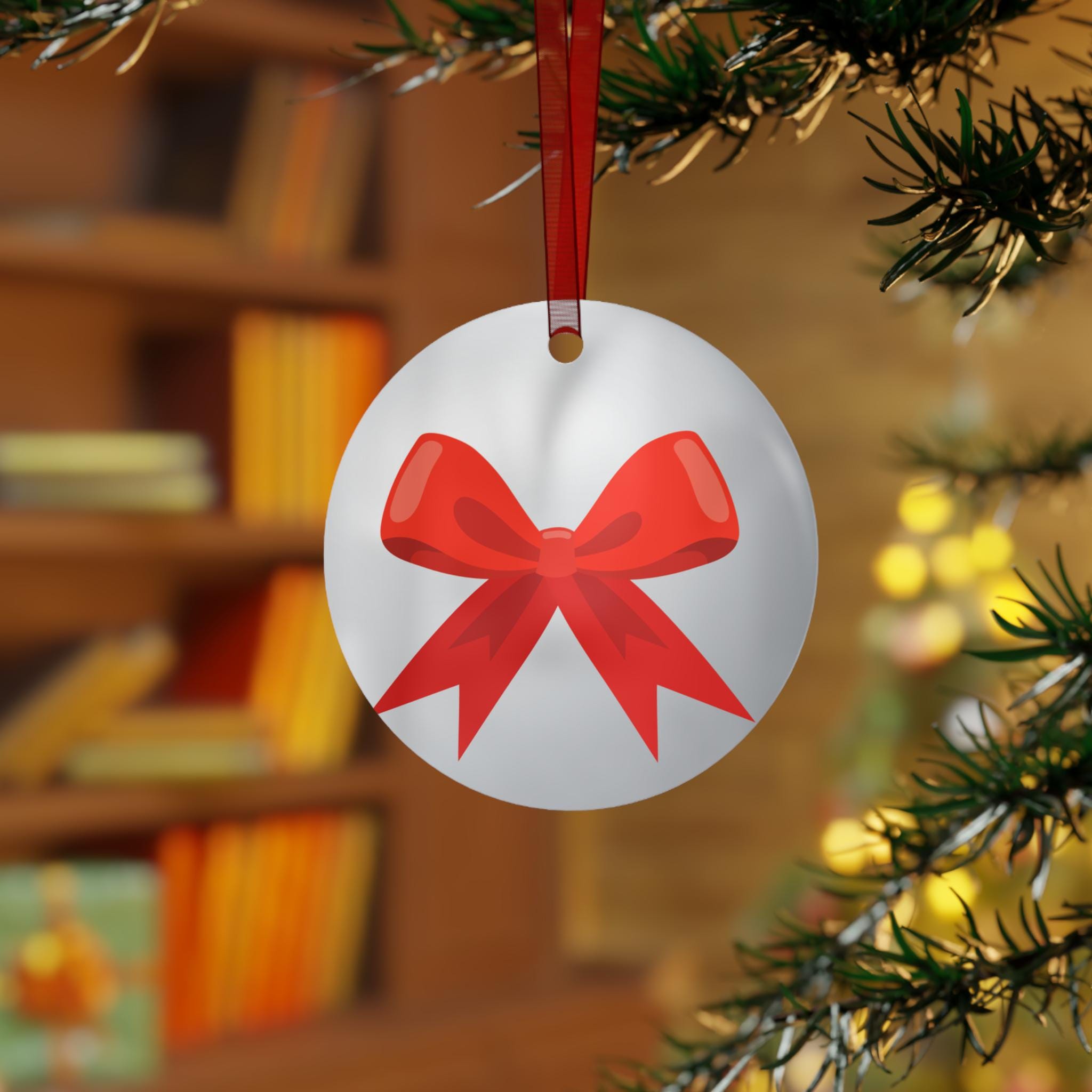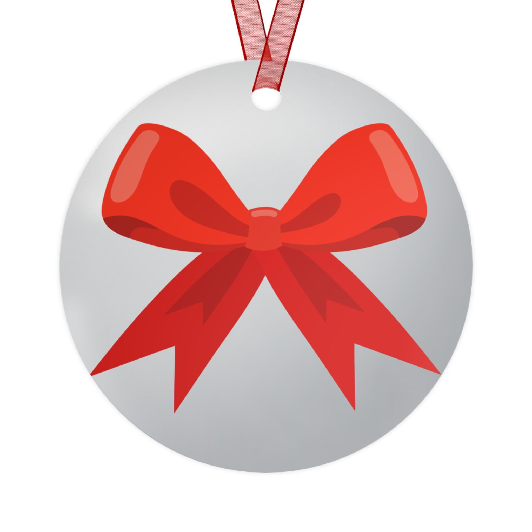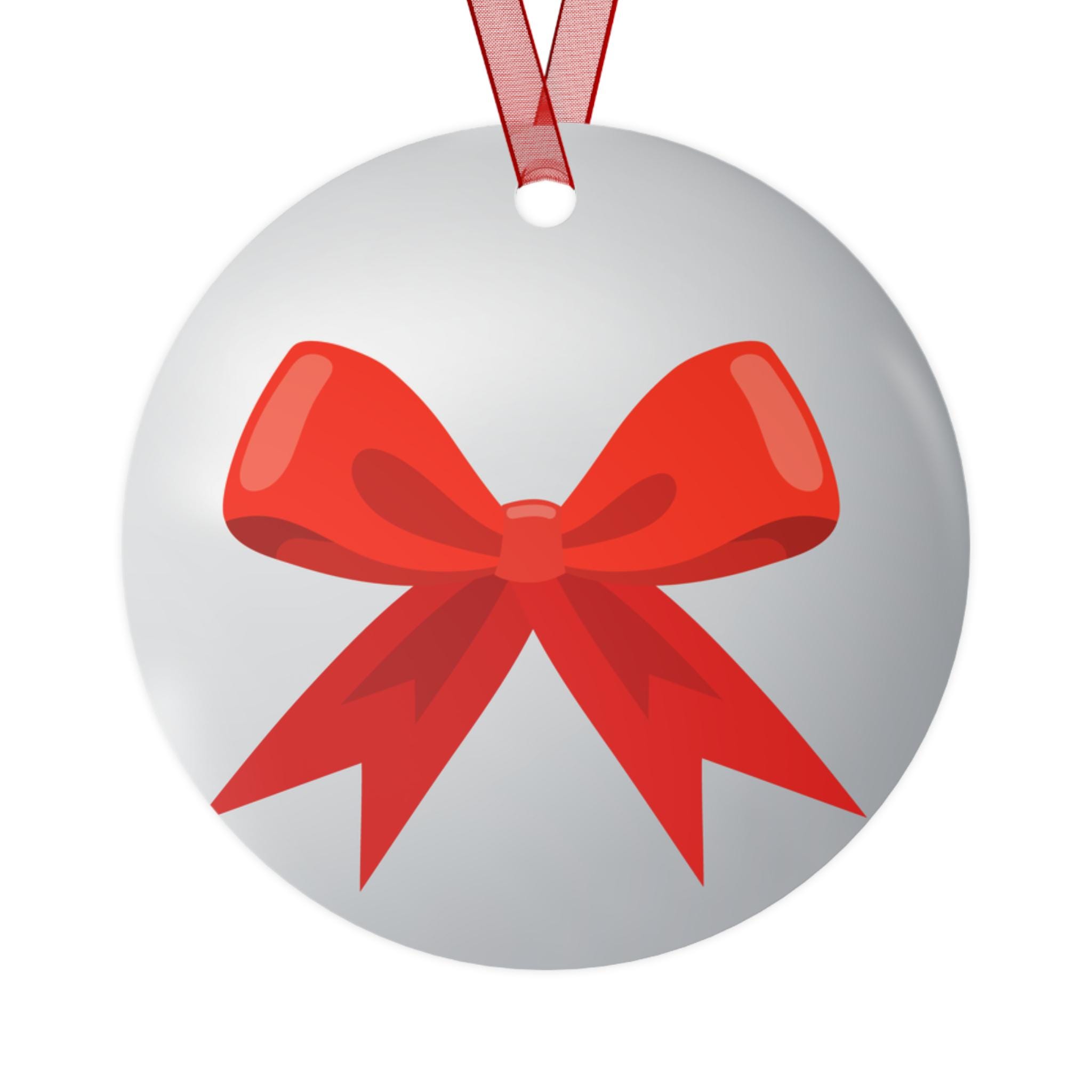 A bright, glossy metal ornament that brings a touch of handcrafted holiday cheer to every branch. Lightweight aluminum with a white gloss finish keeps the red ribbon and bow artwork vivid on both sides. Each ornament arrives with a red hanging ribbon threaded through a pre-drilled hole so it’s ready to hang on the tree, wreath, or garland. The durable, scratch- and chip-resistant surface holds up year after year, keeping the cheerful bow motif sharp and festive. Choose from four classic shapes – bell, tree, round, or oval – to mix and match a personalized look for mantel displays, memory trees, or seasonal décor.