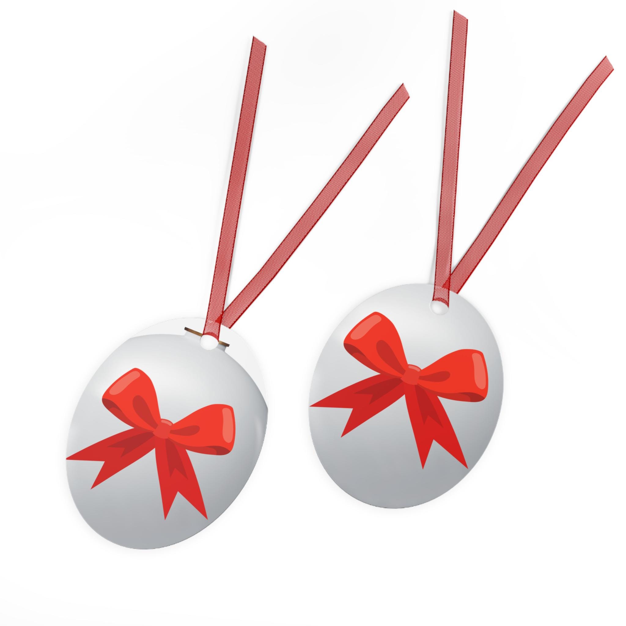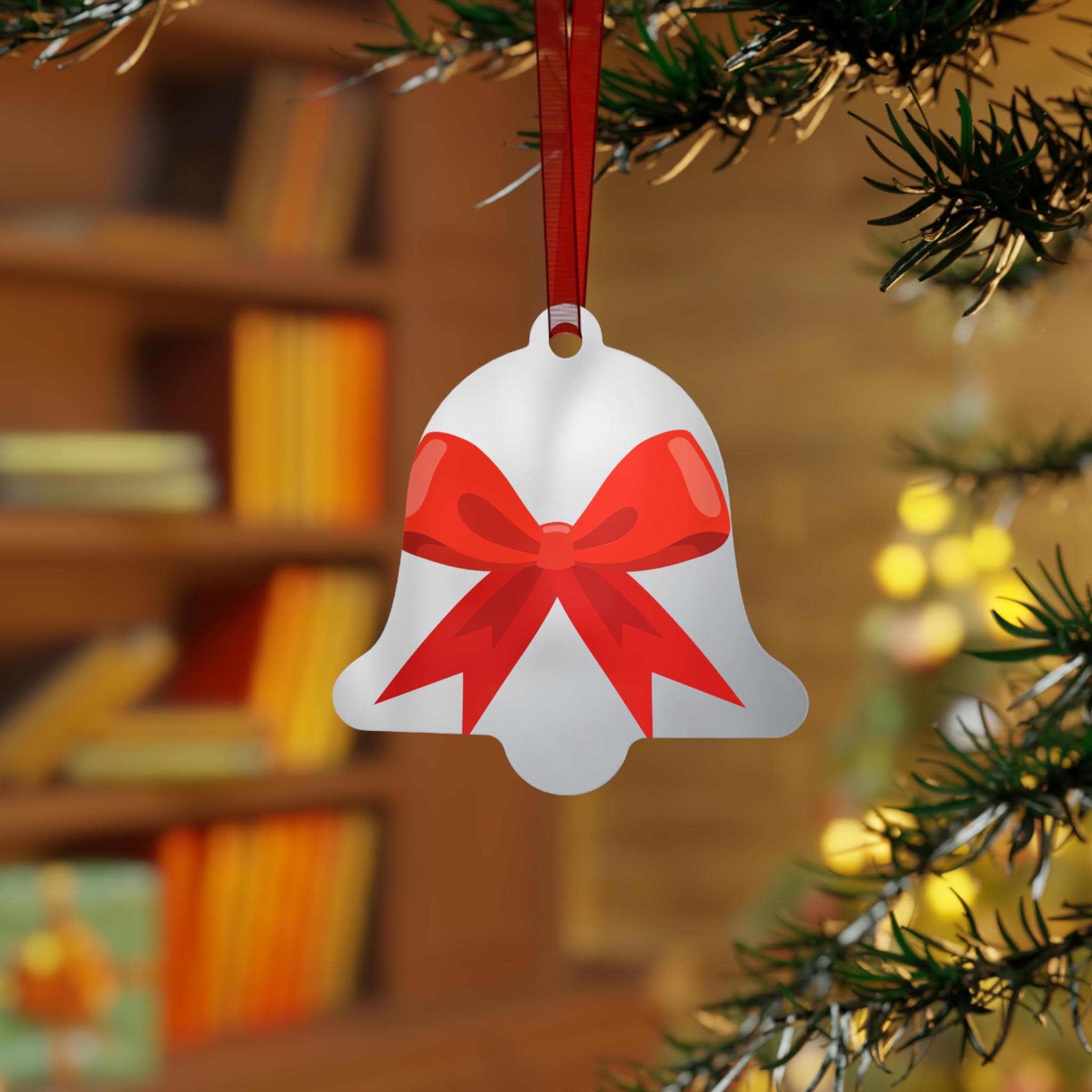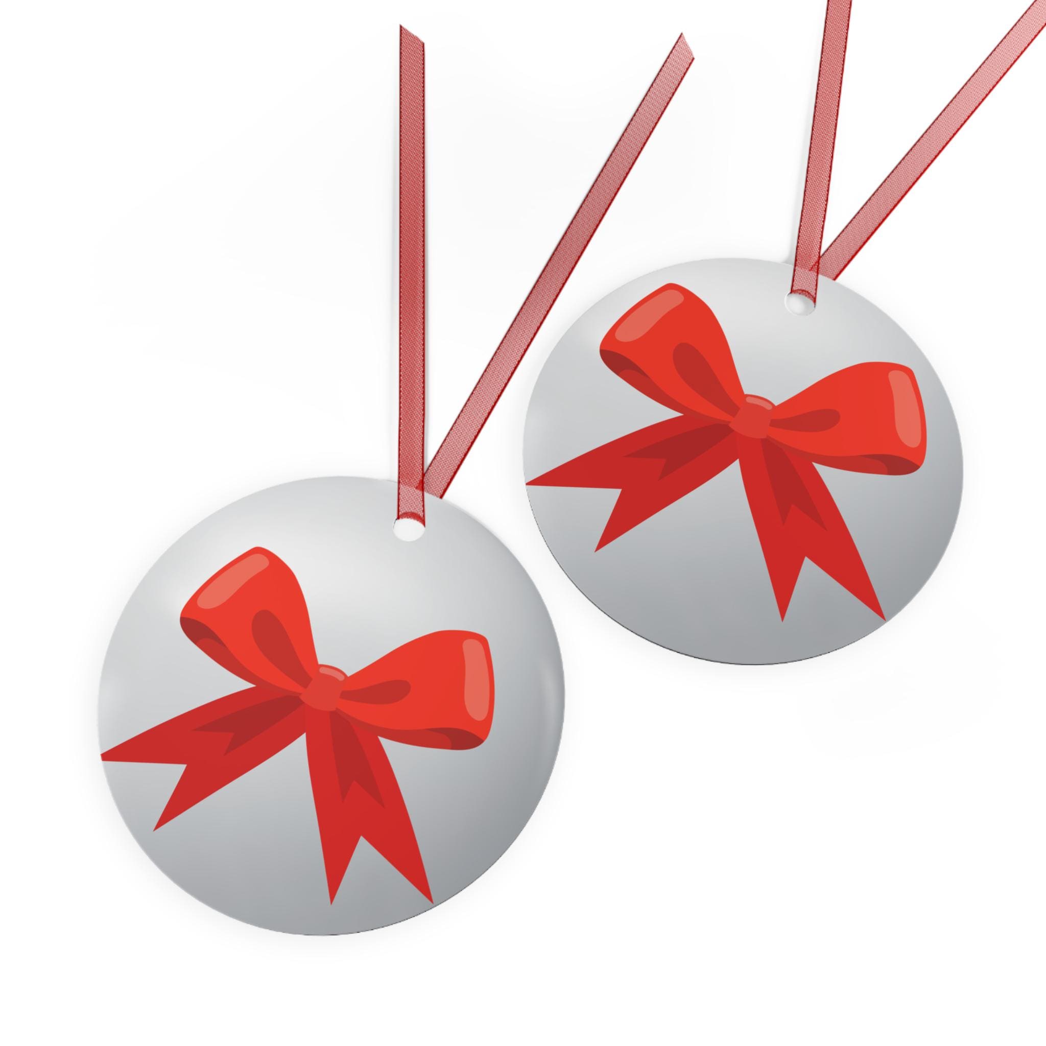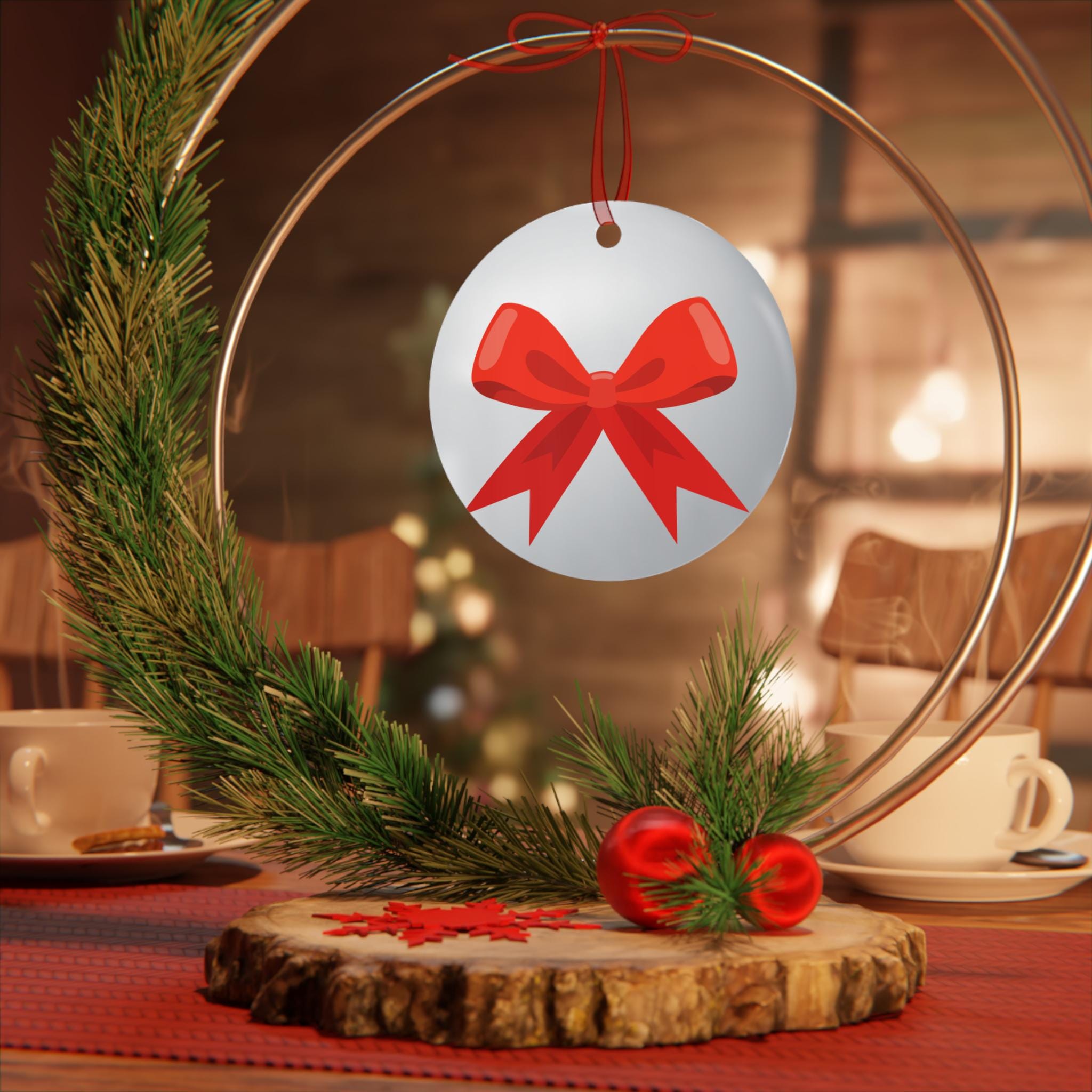 A bright, glossy metal ornament that brings a touch of handcrafted holiday cheer to every branch. Lightweight aluminum with a white gloss finish keeps the red ribbon and bow artwork vivid on both sides. Each ornament arrives with a red hanging ribbon threaded through a pre-drilled hole so it’s ready to hang on the tree, wreath, or garland. The durable, scratch- and chip-resistant surface holds up year after year, keeping the cheerful bow motif sharp and festive. Choose from four classic shapes – bell, tree, round, or oval – to mix and match a personalized look for mantel displays, memory trees, or seasonal décor.