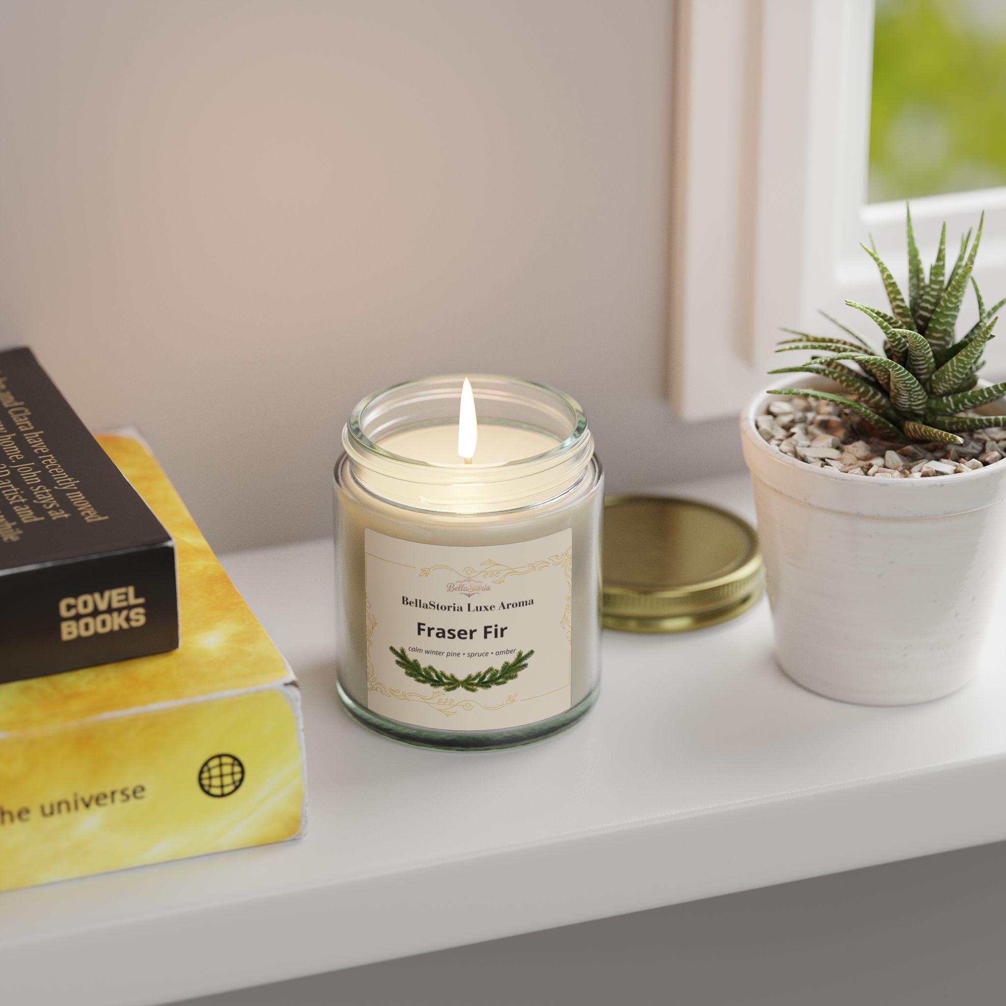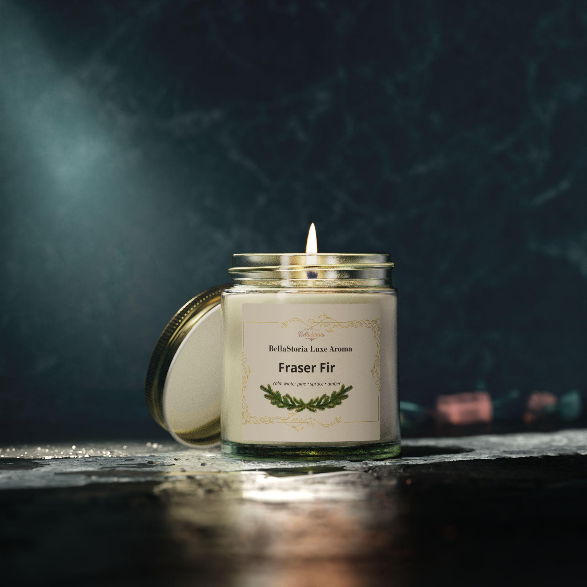 BellaStoria | Fraser Fir Scented Candle - Coconut Apricot Wax. Bring warmth and tranquility to your space with this eco-friendly and non-toxic candle made with natural Coconut Apricot Wax. Perfect for those who enjoy the refreshing and earthy scent of Fraser Fir. Ideal for holiday seasons and cozy evenings at home.