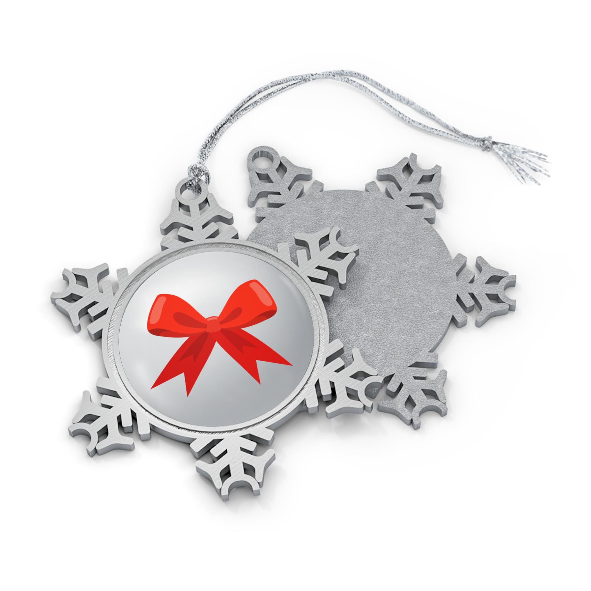 Handcrafted from solid pewter and cut in an intricate snowflake silhouette, this ornament brings a quiet, wintry hush to any tree. The subtly brushed silver finish catches light without overpowering, while the recessed circular center accepts vivid custom art or a delicate emblem — printed with bright, crisp color that stays true year after year. A silver-toned hanging string threads through a carved point so the piece floats naturally among the branches. Comes nestled in a black presentation box, ready to tuck away with seasonal treasures or bring out for cozy holiday rituals.