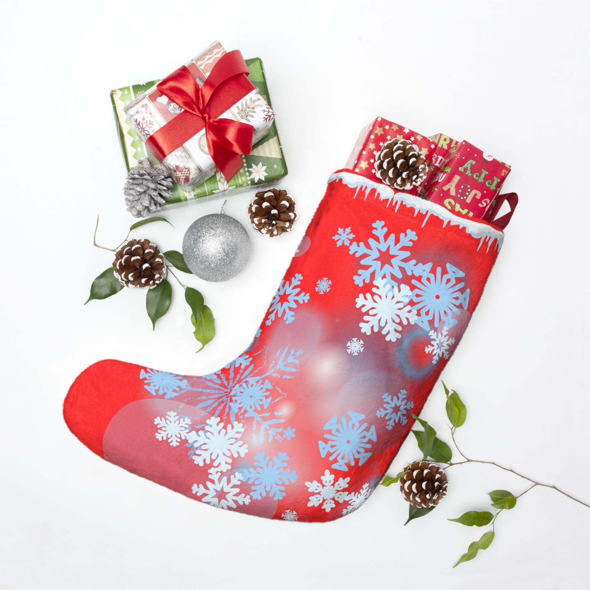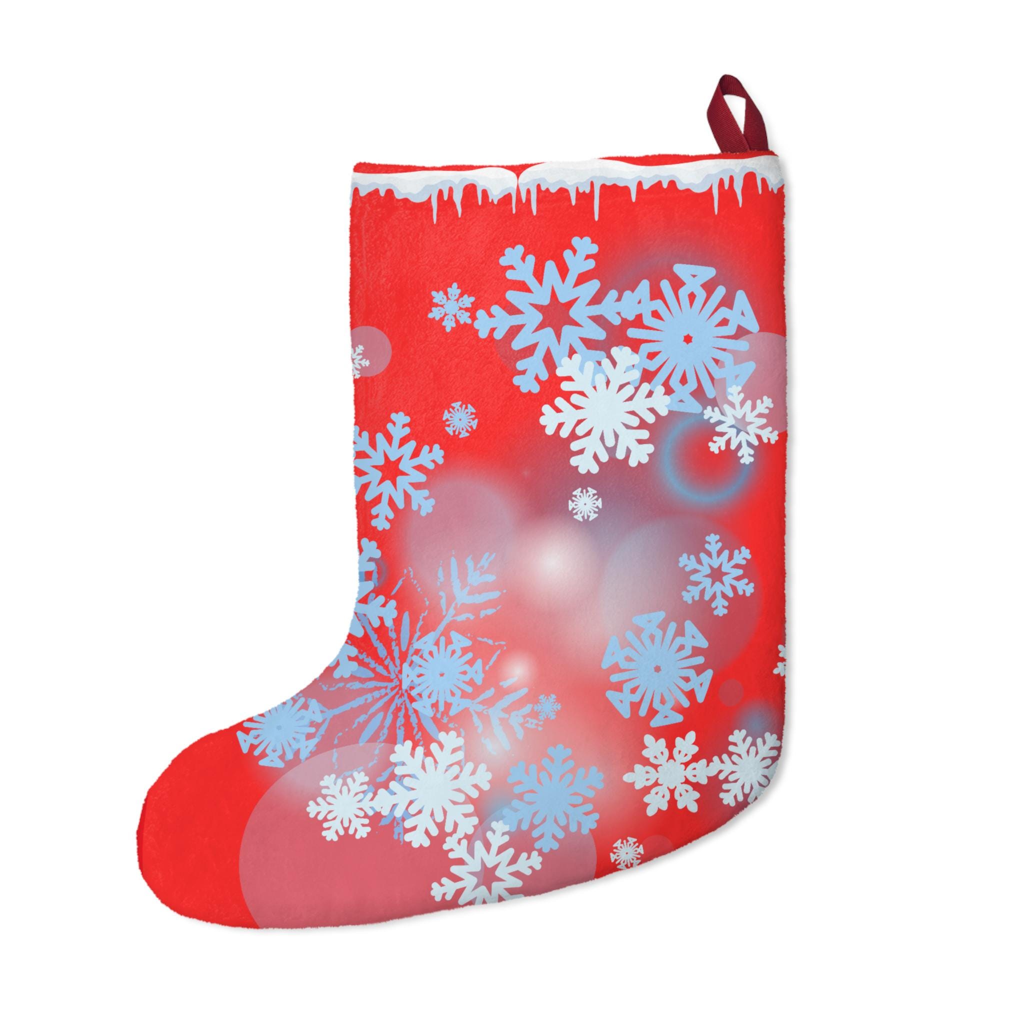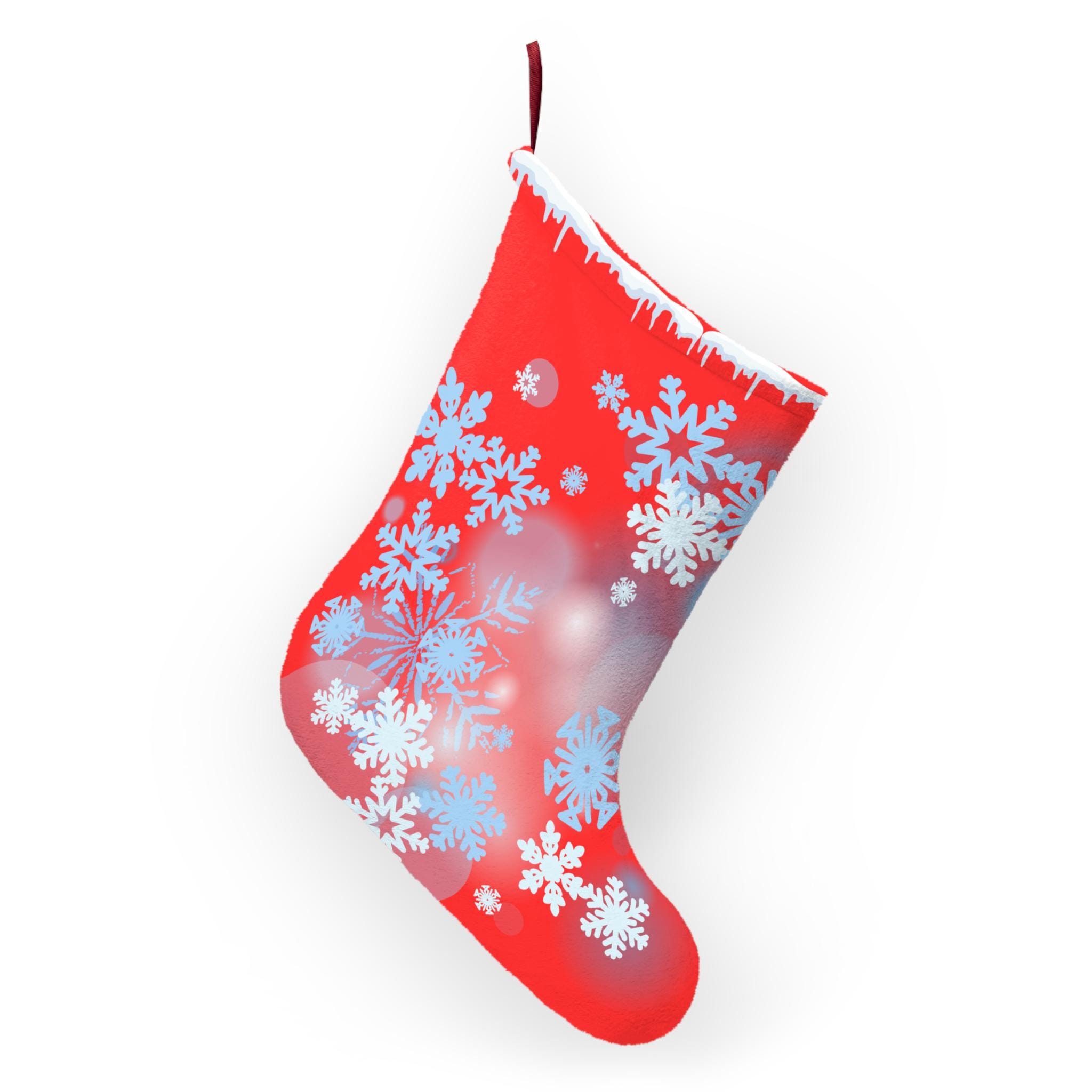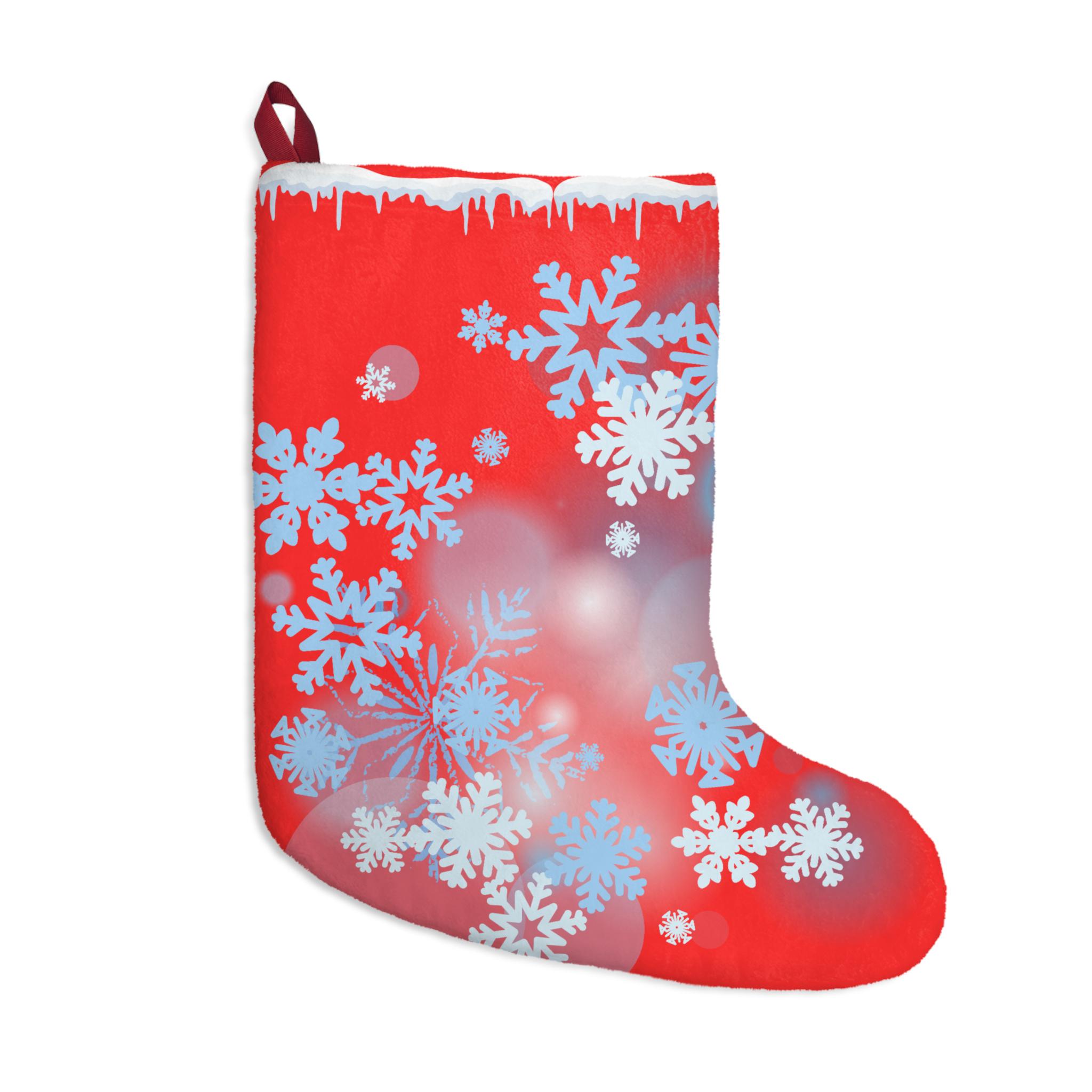 Hang a little winter wonder on your mantel with this plush Christmas stocking. The bright red fleece is dusted with soft blue and white snowflakes, giving a cozy, nostalgic glow that feels like the hush of the first snowfall. Generous in size, it swells with treats, small treasures, and handwritten notes. The thick, velvety fleece and overlocked seams mean it stays fluffy and dependable year after year — a warm accent that reads like a handwritten holiday memory in fabric form. The stitched twill loop makes hanging effortless, whether you drape it from a rustic beam or a modern stocking holder. Made with care in the USA from globally sourced parts, it brings a handcrafted, homey presence to Christmas Eve and every holiday gathering that gathers loved ones close.