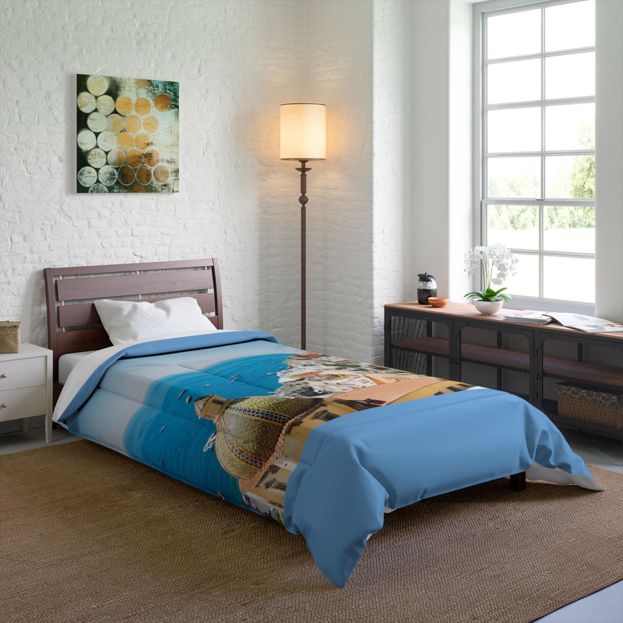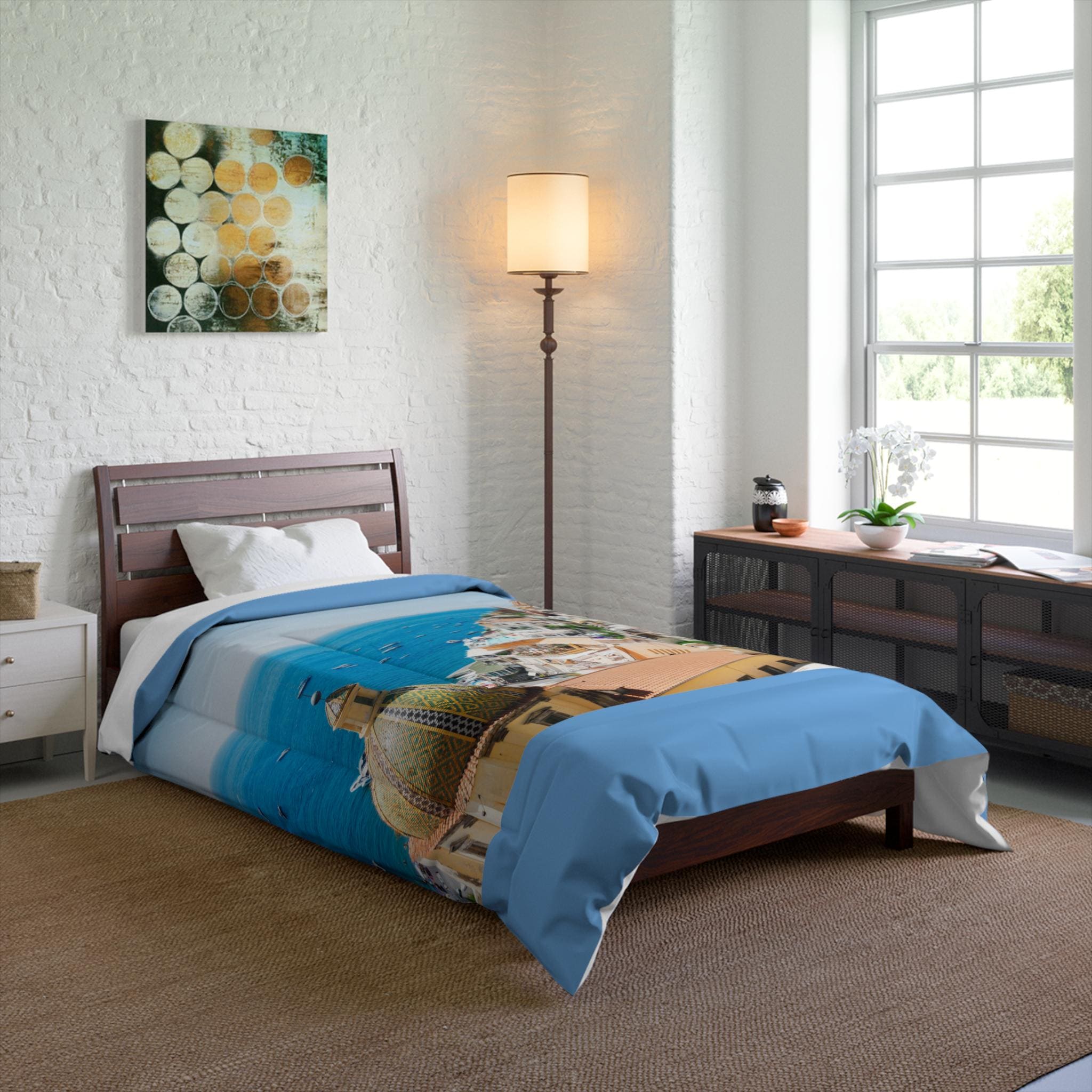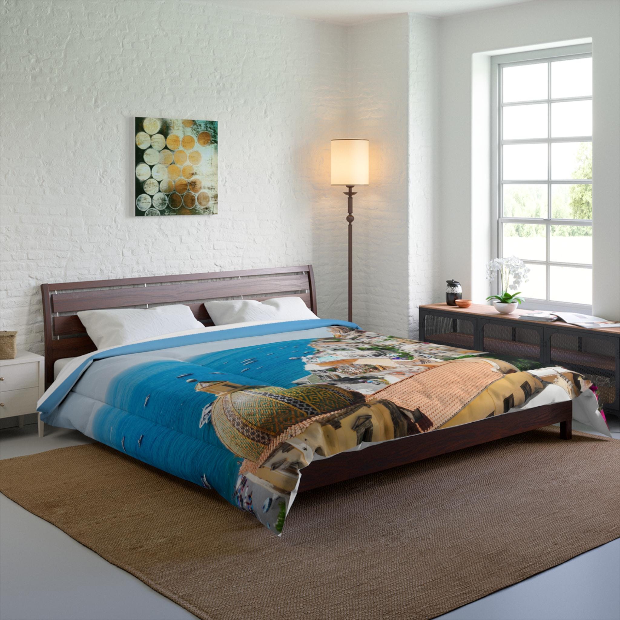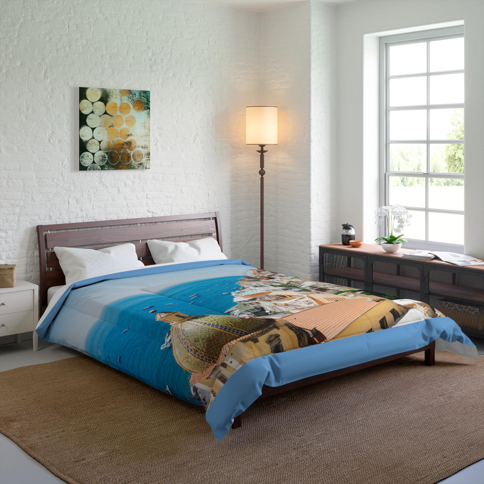 Drift into a sunny Mediterranean afternoon every night. This lightweight comforter carries a vibrant coastal scene – pastel cliffside homes, bright bougainvillea, and the shimmer of turquoise water – printed on soft microfiber that feels gentle against the skin. It layers easily over sheets or a duvet insert, bringing an instant vacation mood to a bedroom. Let it sit atop a low wooden frame or a modern platform bed; the bold colors anchor the room while the solid white back keeps the look fresh and crisp. It’s built with double square quilting to keep the plush batting evenly distributed, so the warmth feels consistent without bulk. For someone who collects travel memories or simply wants a daily escape, this comforter turns sleep into a moment of calm and sun-warm nostalgia.