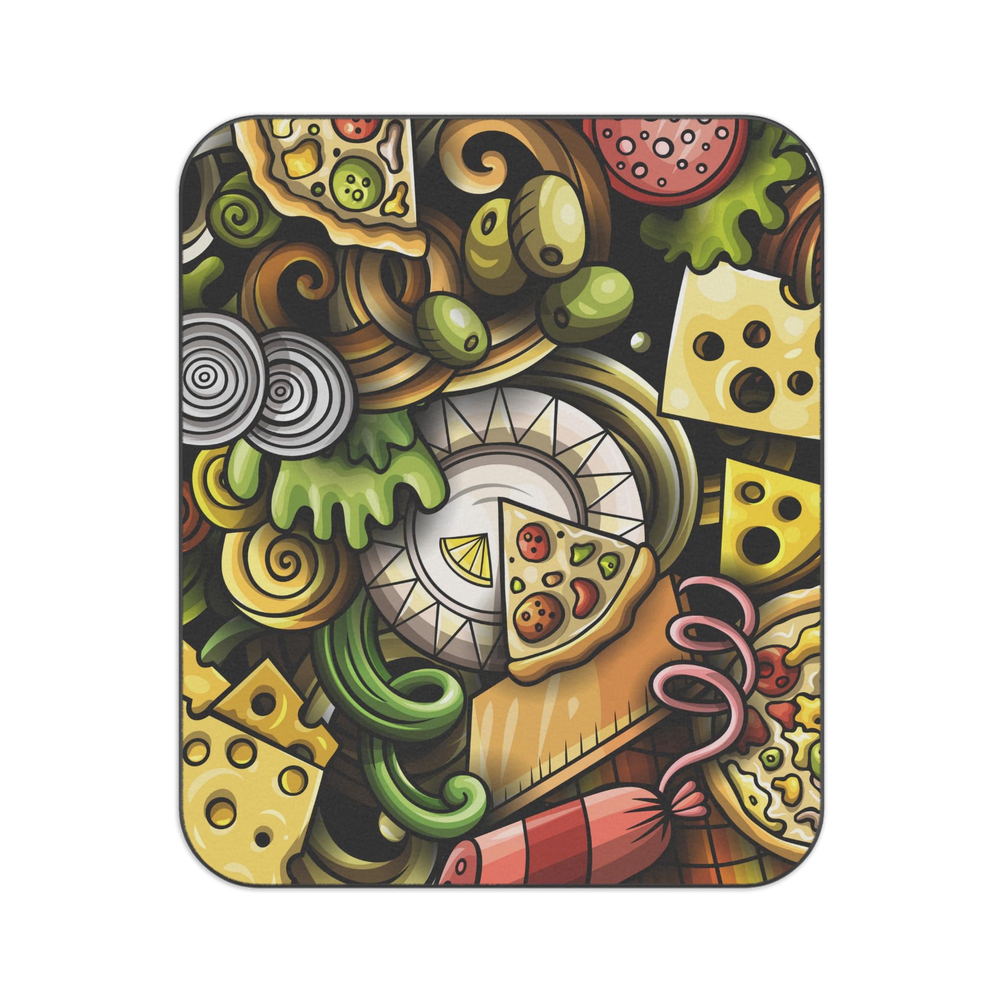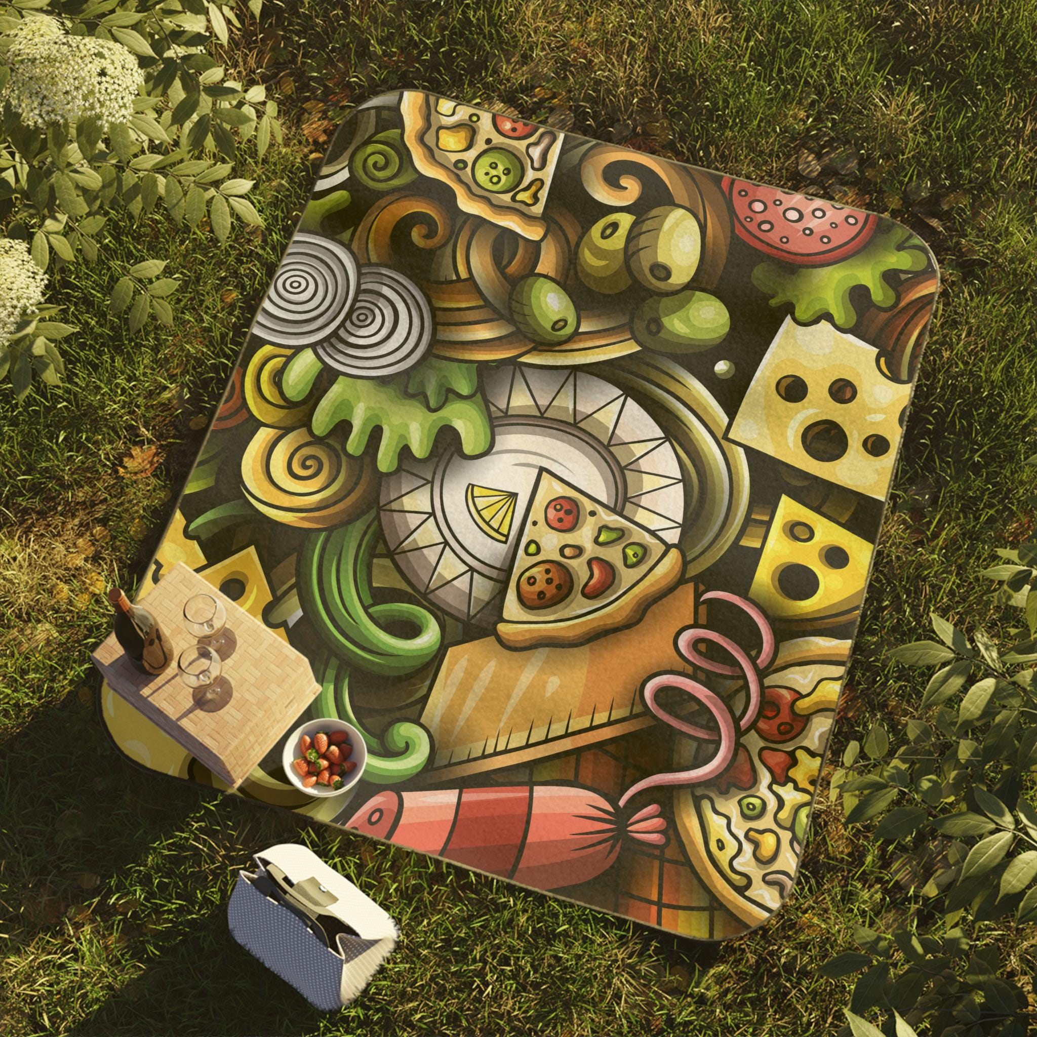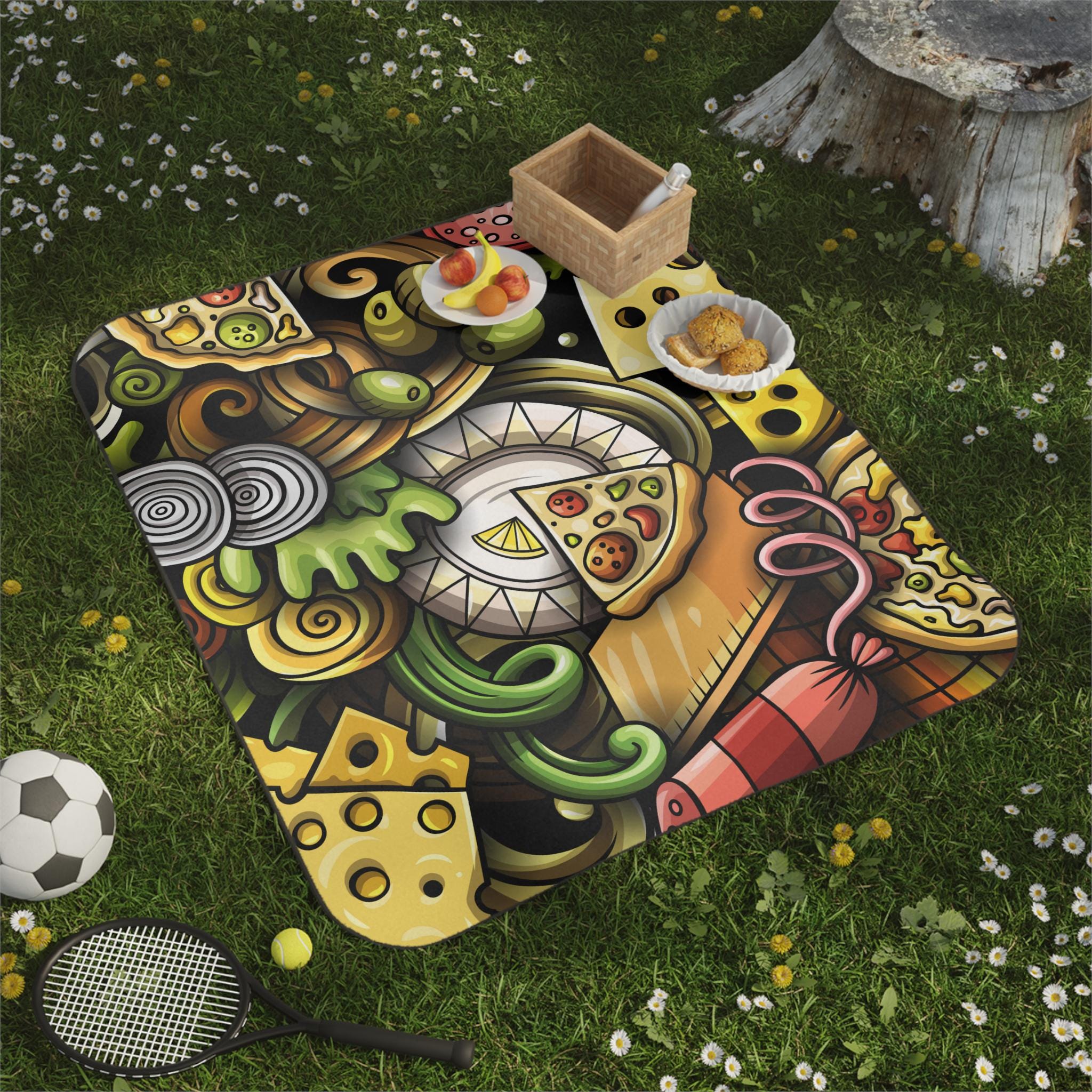 Spread out on a sun-warmed lawn or unfurl beneath a shady tree — this picnic blanket brings playful, food-inspired art to every outdoor moment. The plush fleece top feels cozy against bare legs, while the black, water-resistant oxford backing keeps dampness from seeping through. Bright, crisp colors pop across the surface thanks to advanced printing, so the quirky pizza-and-cheese illustration stays vivid through many afternoons. When the day winds down, fold it neatly and snap the black carrying strap for easy transport. Lightweight, durable, and soft, it’s the kind of blanket you reach for when a spontaneous picnic or a relaxed park hangout is calling.