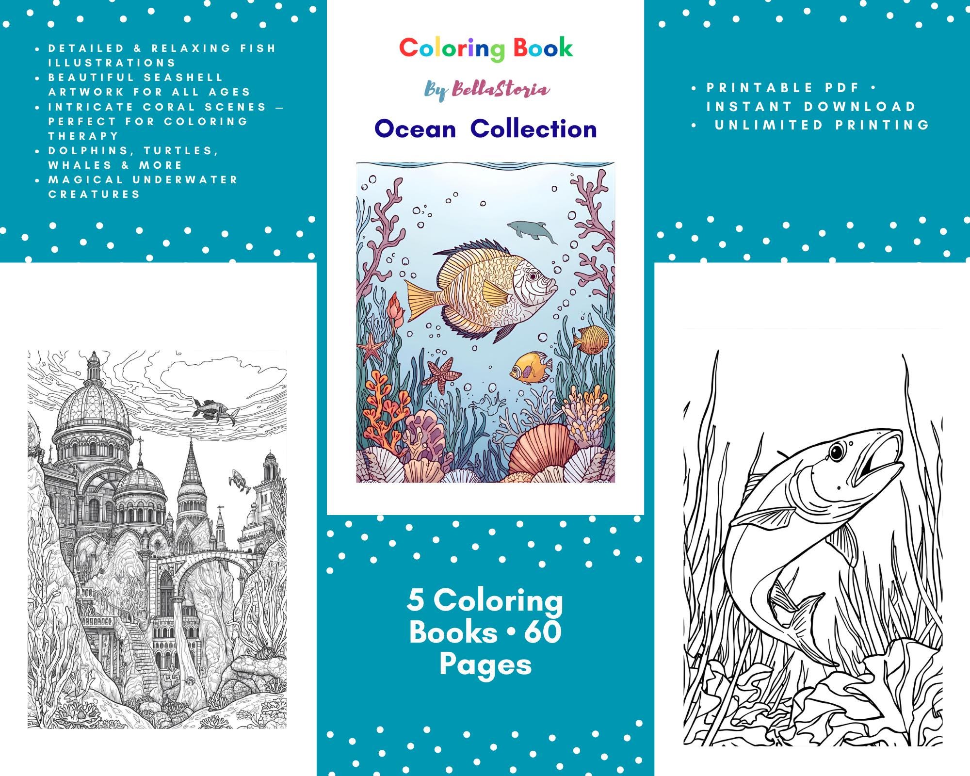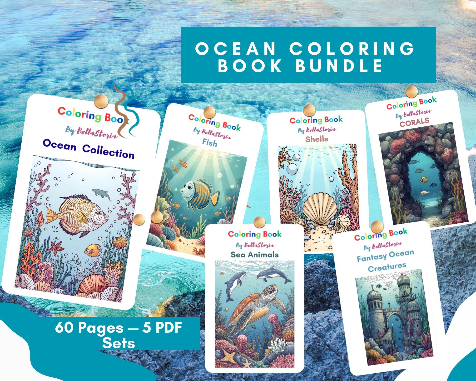 This beautiful set includes 5 themed coloring books (Fish, Shells, Corals, Sea Animals, Fantasy Ocean Characters) - a total of 60 detailed ocean illustrations perfect for both children and adults.